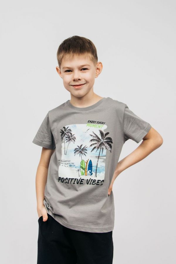 Футболка для мальчика прямого силуэта с втачным коротким рукавом. Горловина круглая, обработана воротником из рибаны. Горловина спинки внутри укреплена бейкой из кулирки. Низ изделия и рукава обработан швом вподгибку. На полочке Фотопринт с шелкографией. Надпись переводится как "Наслаждайся каждым моментом; Самый простой способ сохранять спокойствие-лежать под пальмой; Волны позитива".