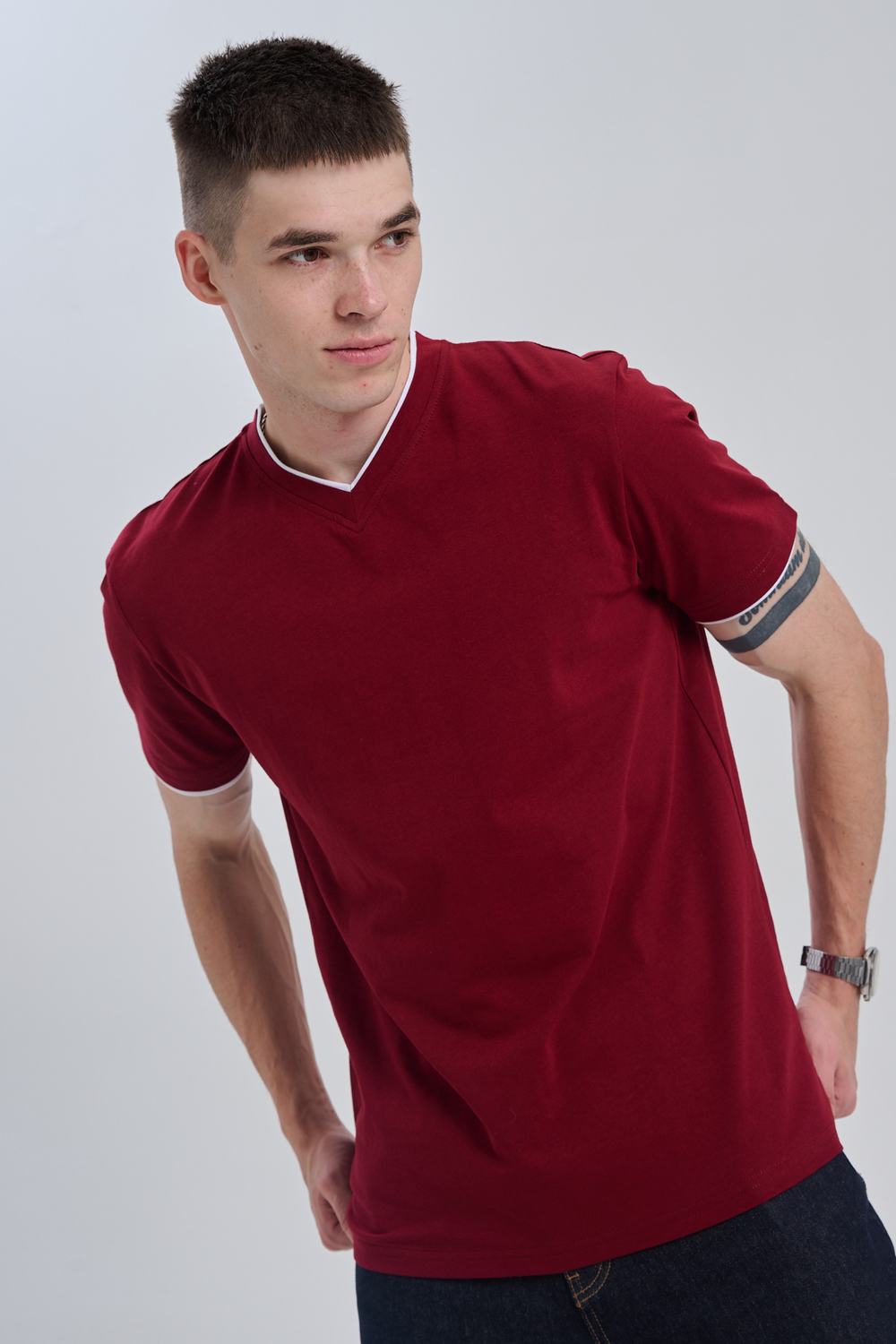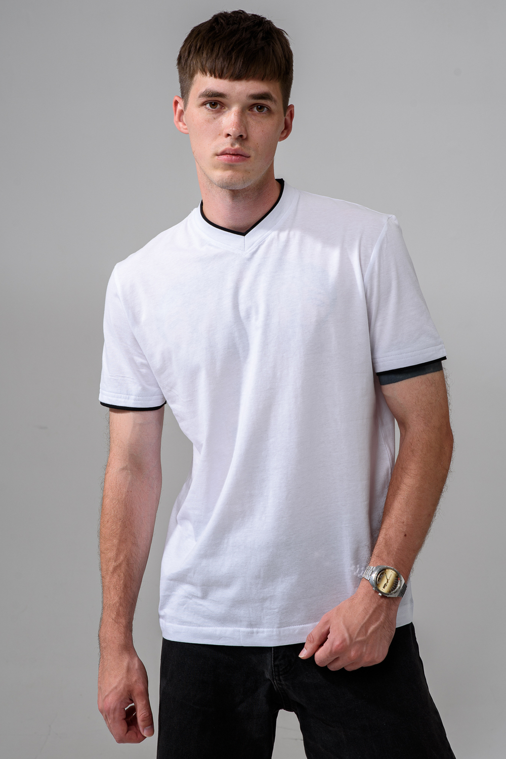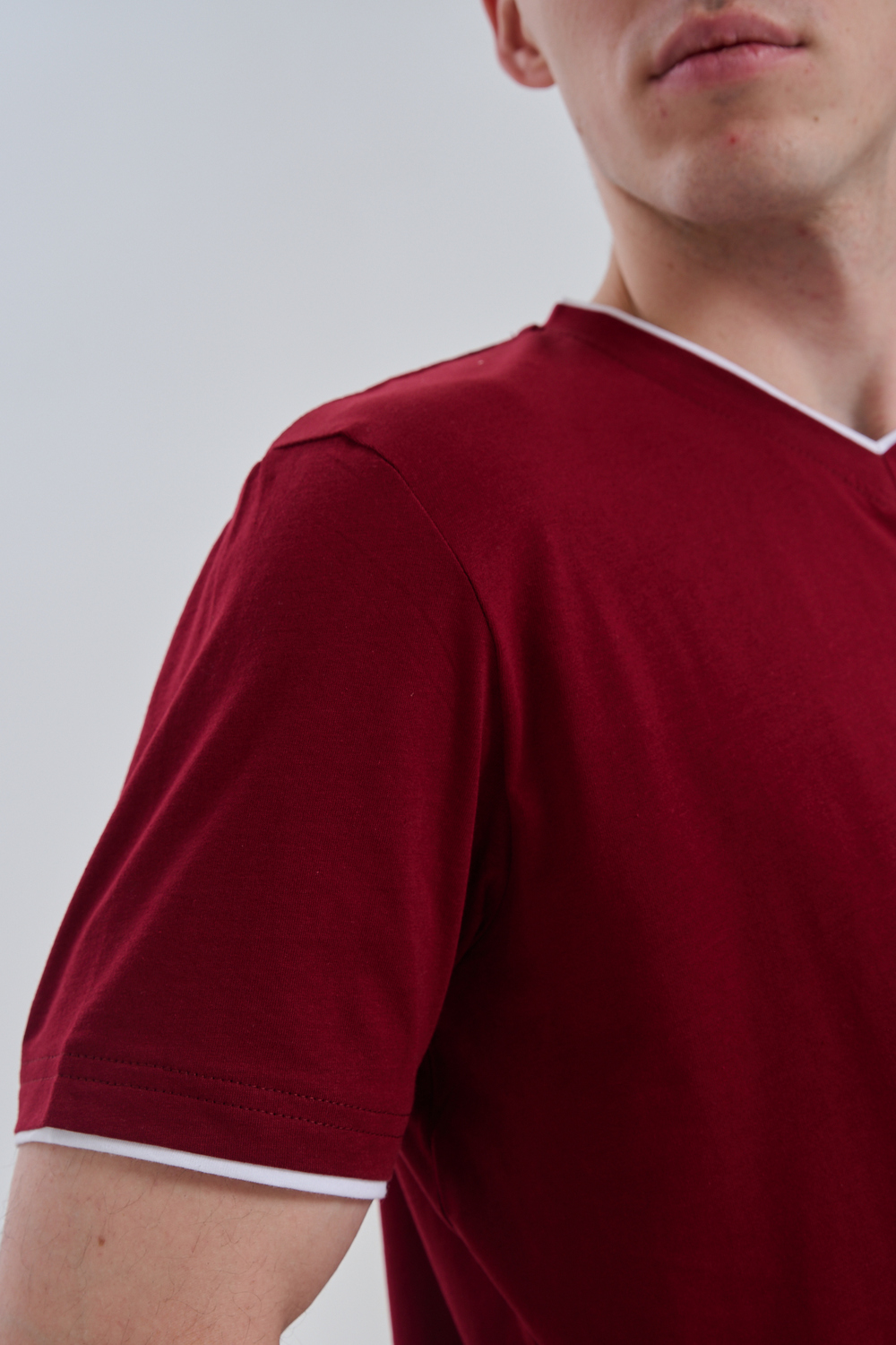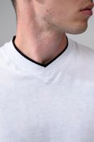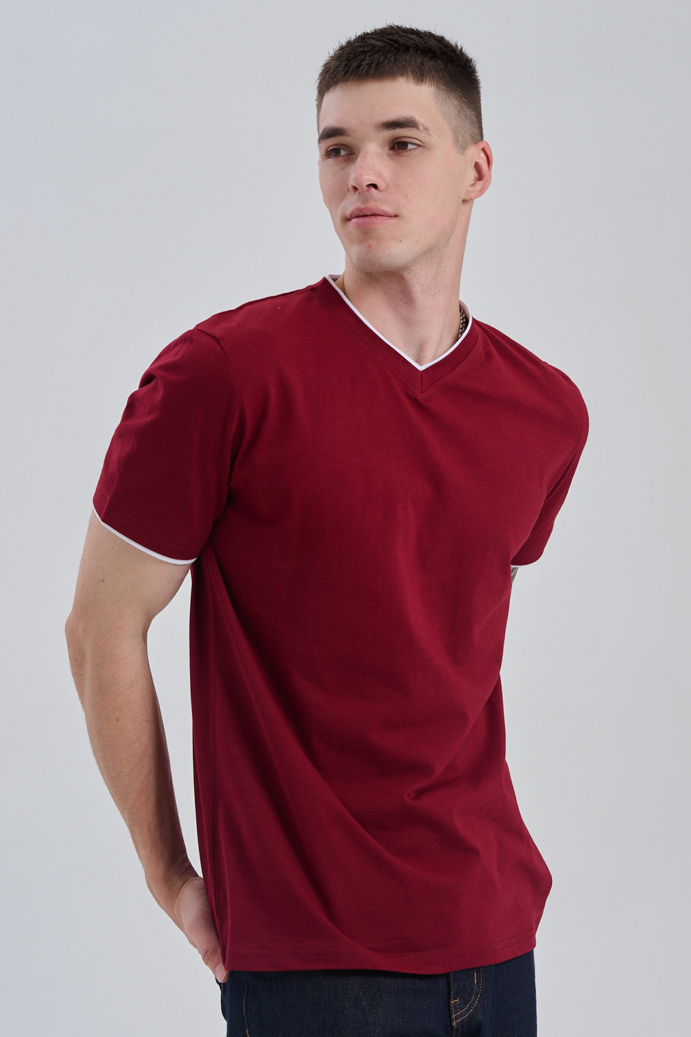 Футболка мужская однотонная с окантовкой из плотного дышащего хлопка. Модель в расслабленном молодежном стиле. Свободный прямой крой – база для любого гардероба. Представлены мягкие футболки стандартных размеров, подходят на высокий рост. С усиленным V-Образным вырезом и окантовкой, подойдет для тренировок, офиса, учебы, активного отдыха, туристических поездок, встреч с друзьями и дома.