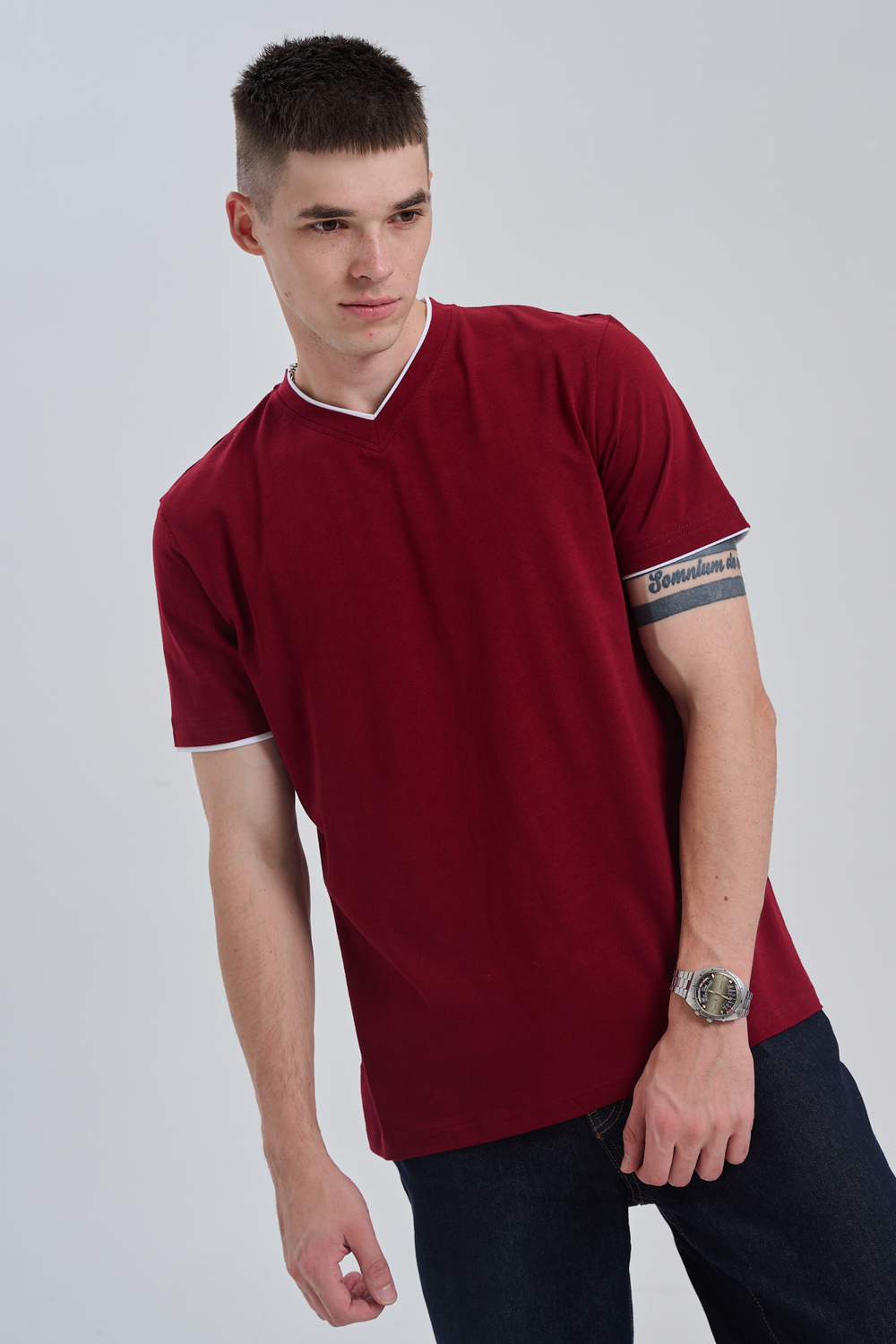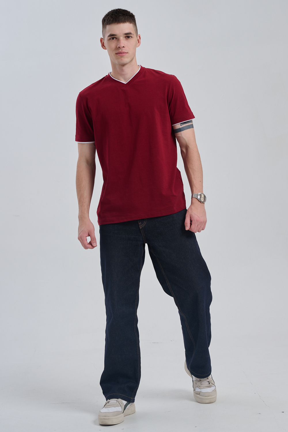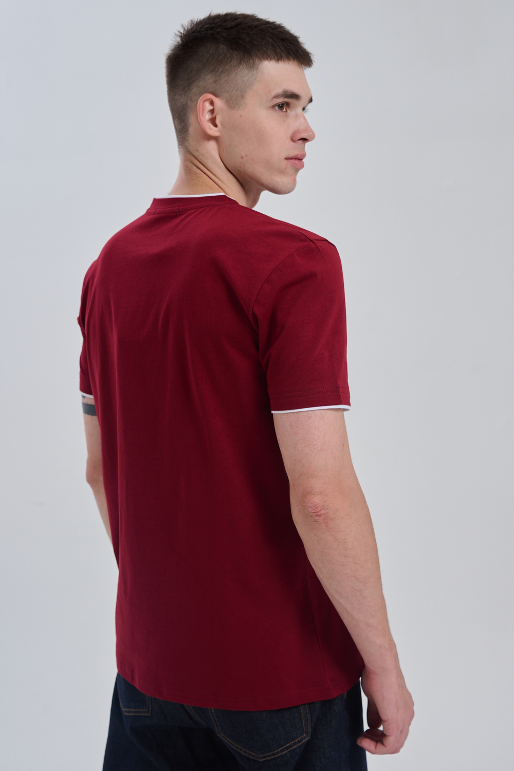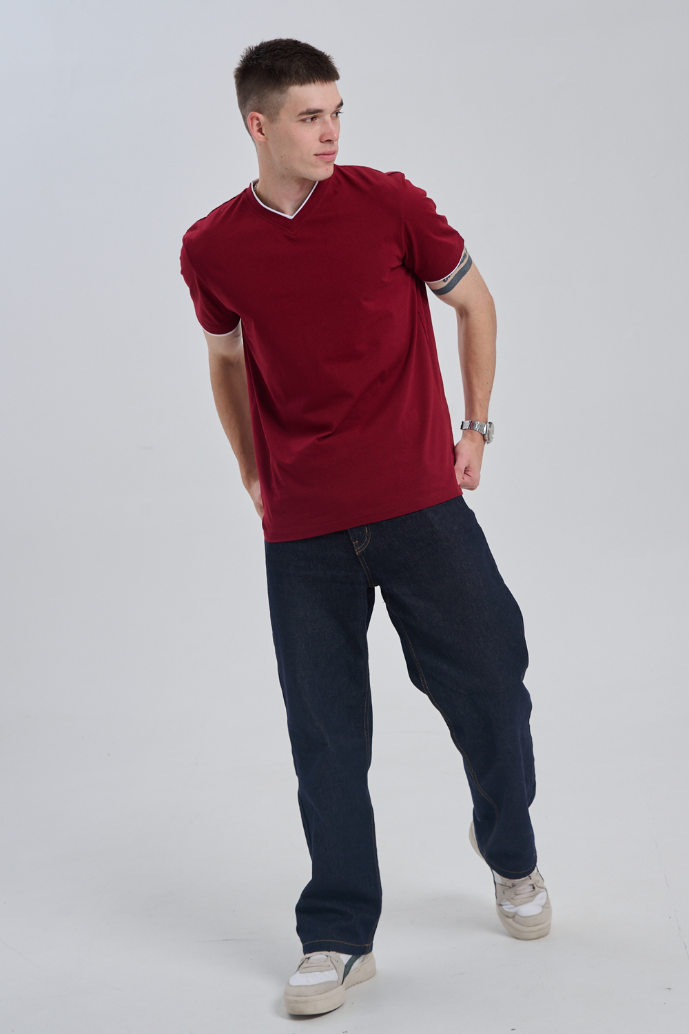 Футболка мужская однотонная с окантовкой из плотного дышащего хлопка. Модель в расслабленном молодежном стиле. Свободный прямой крой – база для любого гардероба. Представлены мягкие футболки стандартных размеров, подходят на высокий рост. С усиленным V-Образным вырезом и окантовкой, подойдет для тренировок, офиса, учебы, активного отдыха, туристических поездок, встреч с друзьями и дома.