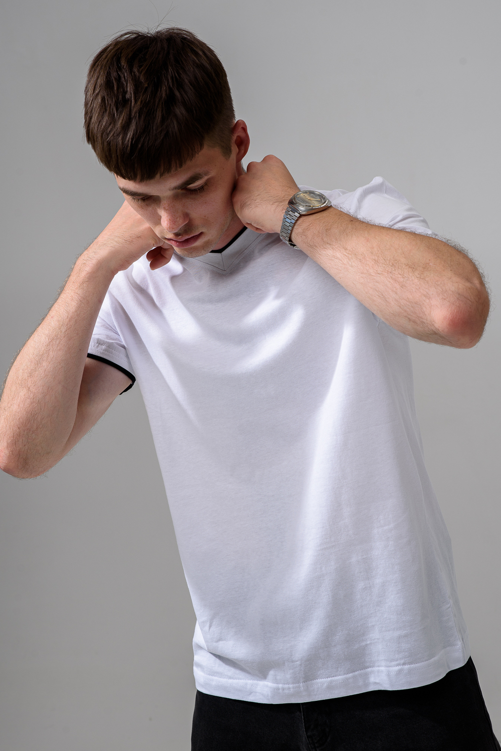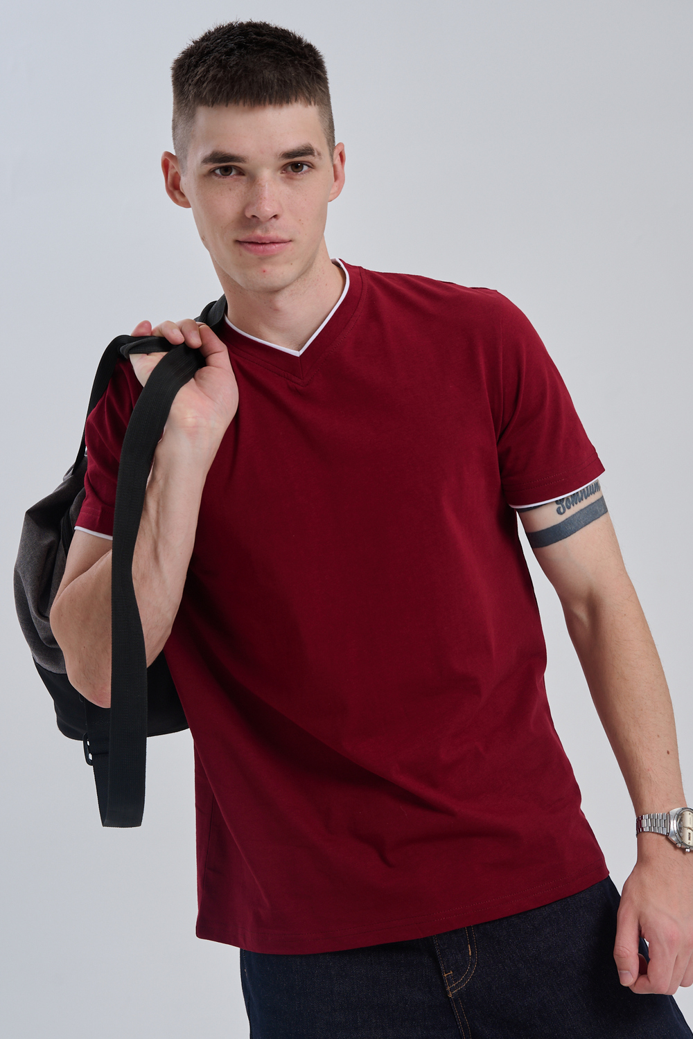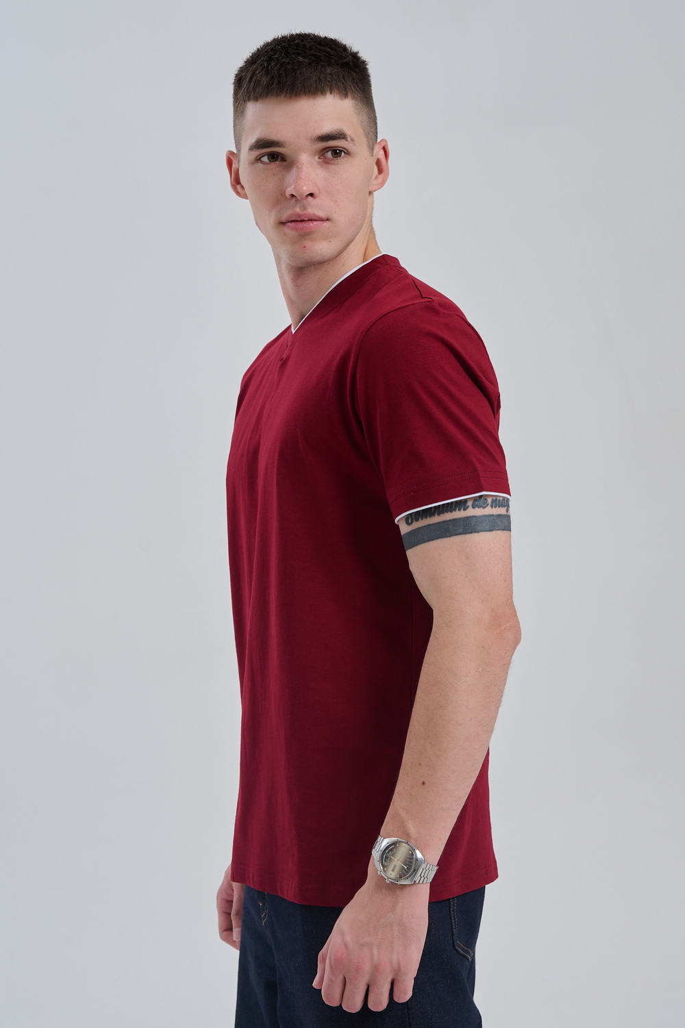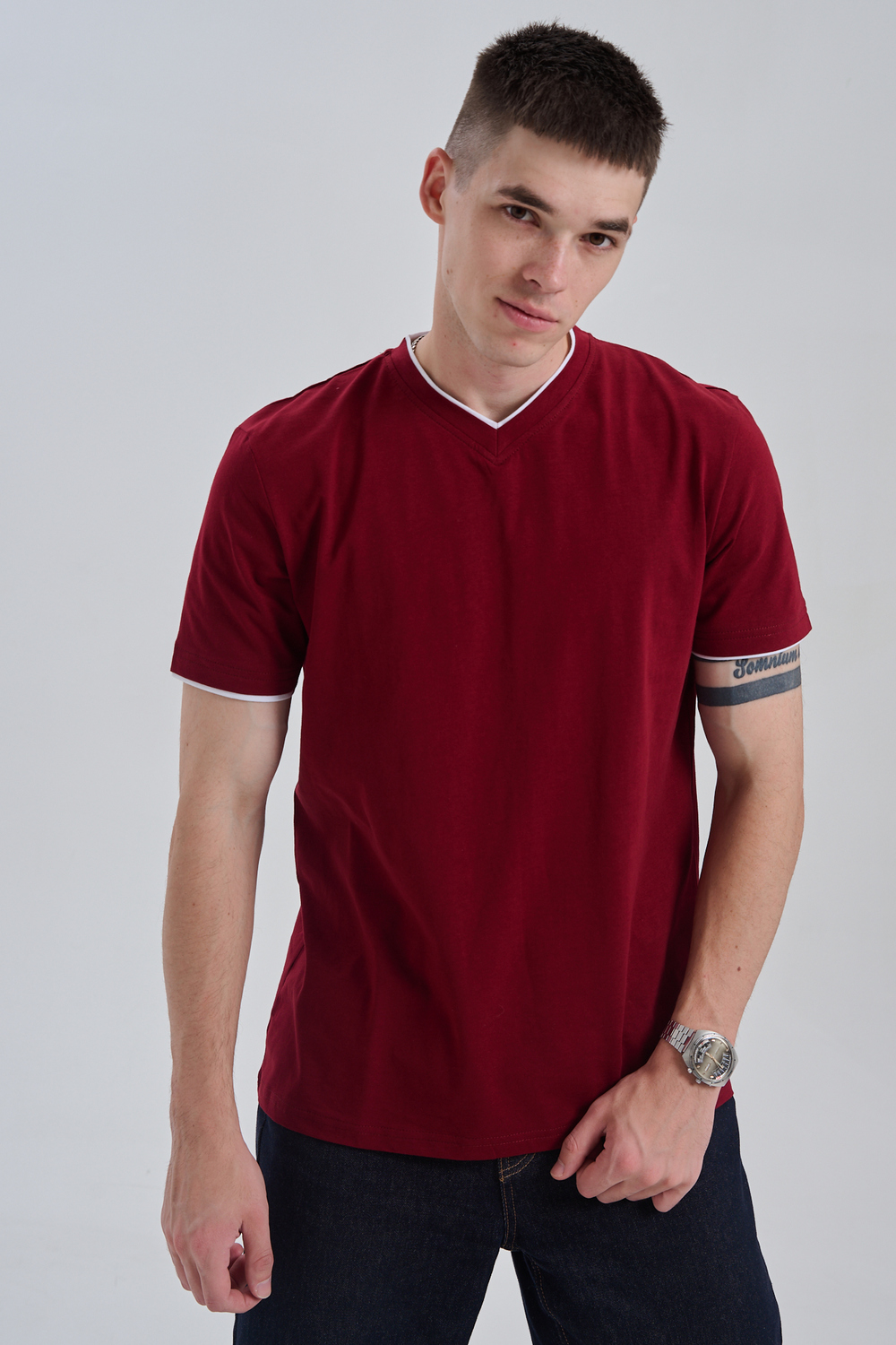 Футболка мужская однотонная с окантовкой из плотного дышащего хлопка. Модель в расслабленном молодежном стиле. Свободный прямой крой – база для любого гардероба. Представлены мягкие футболки стандартных размеров, подходят на высокий рост. С усиленным V-Образным вырезом и окантовкой, подойдет для тренировок, офиса, учебы, активного отдыха, туристических поездок, встреч с друзьями и дома.