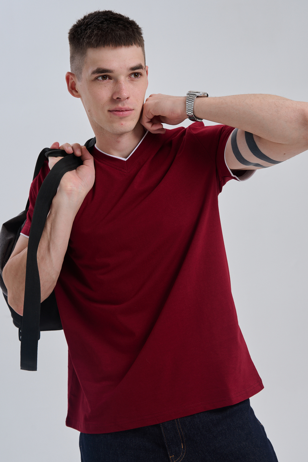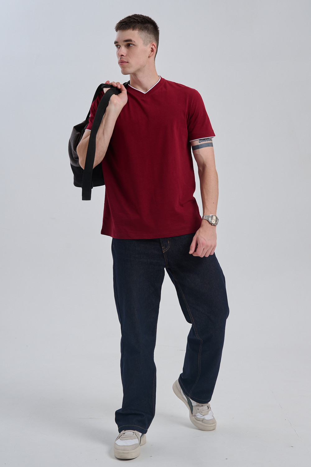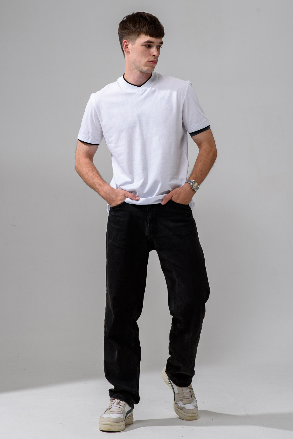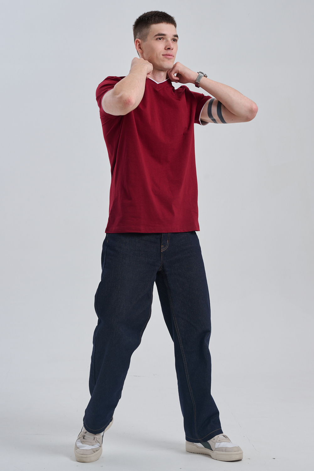 Футболка мужская однотонная с окантовкой из плотного дышащего хлопка. Модель в расслабленном молодежном стиле. Свободный прямой крой – база для любого гардероба. Представлены мягкие футболки стандартных размеров, подходят на высокий рост. С усиленным V-Образным вырезом и окантовкой, подойдет для тренировок, офиса, учебы, активного отдыха, туристических поездок, встреч с друзьями и дома.