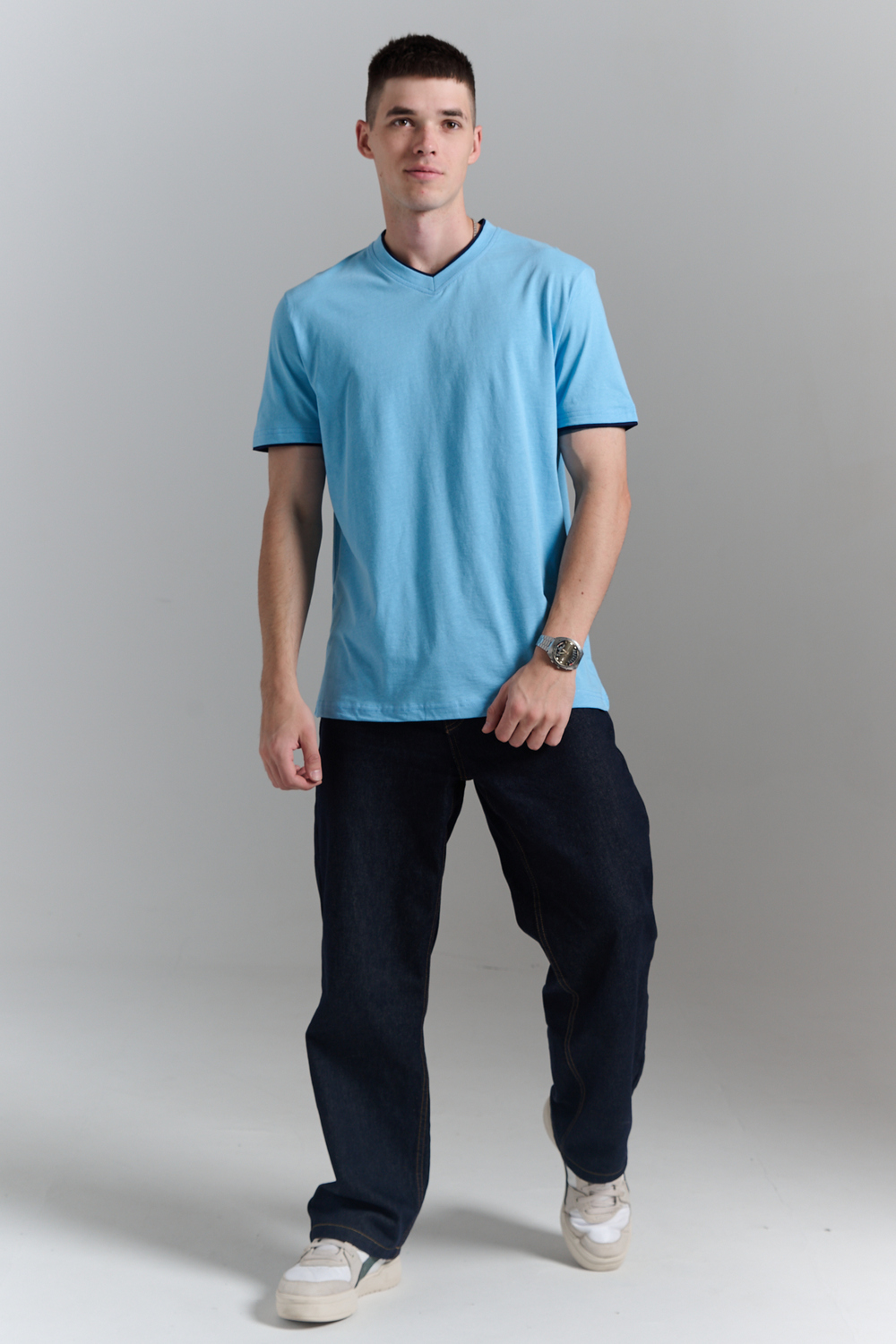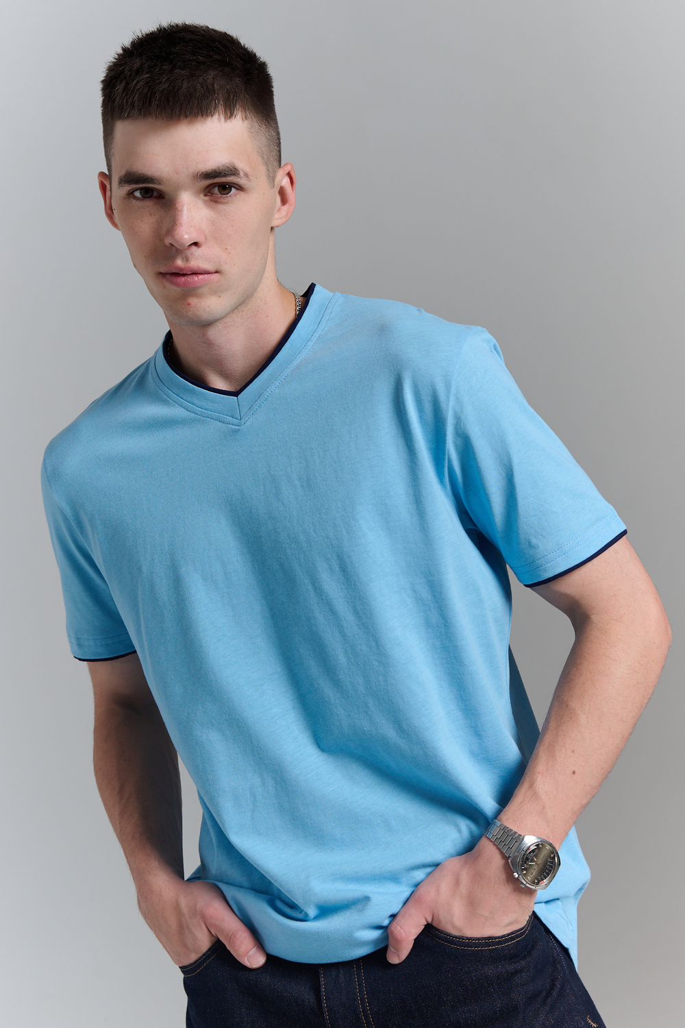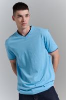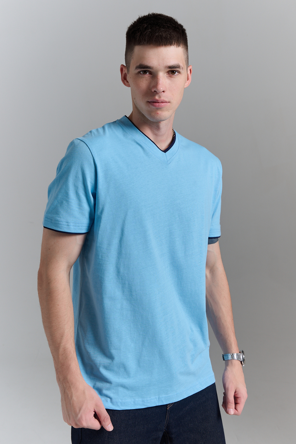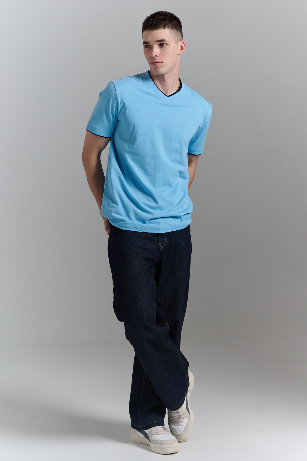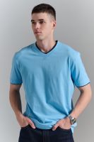 Футболка мужская однотонная с окантовкой из плотного дышащего хлопка. Модель в расслабленном молодежном стиле. Свободный прямой крой – база для любого гардероба. Представлены мягкие футболки стандартных размеров, подходят на высокий рост. С усиленным V-Образным вырезом и окантовкой, подойдет для тренировок, офиса, учебы, активного отдыха, туристических поездок, встреч с друзьями и дома.