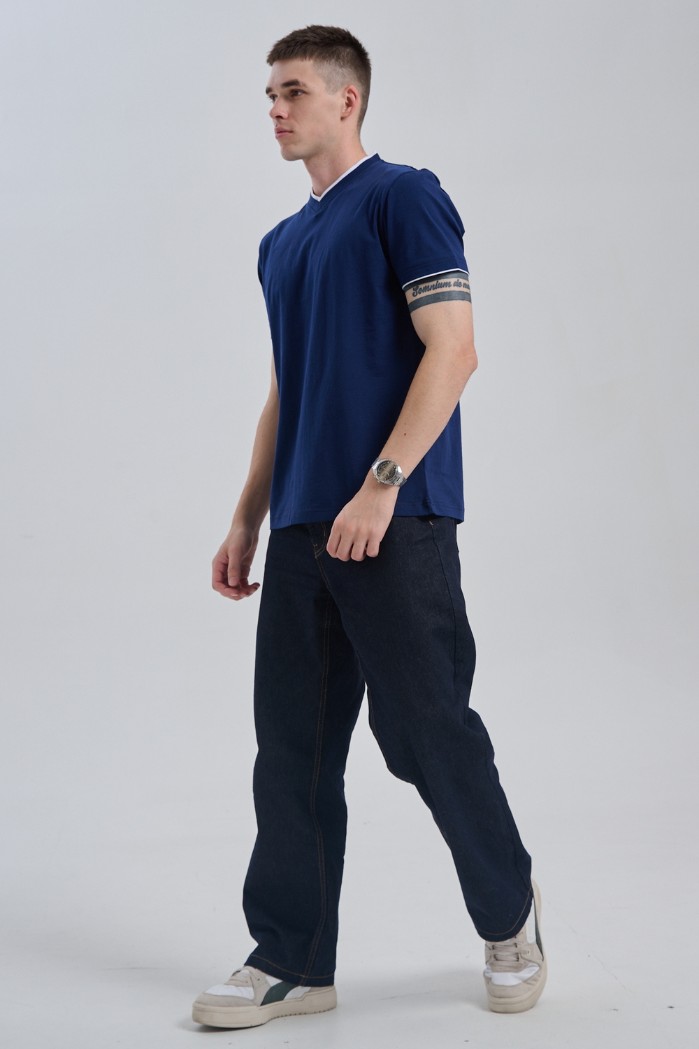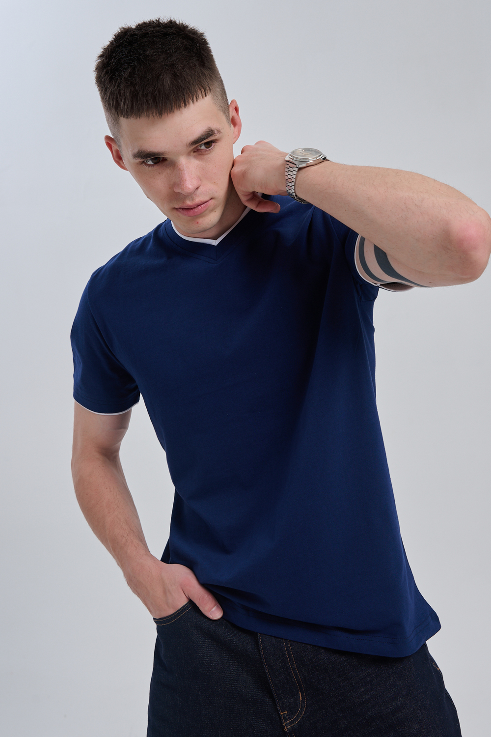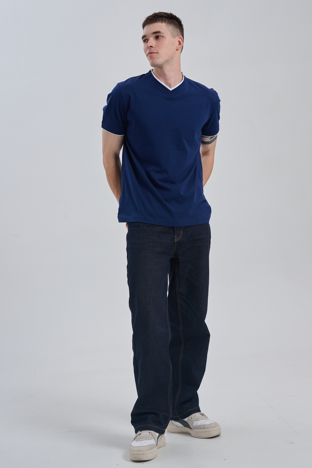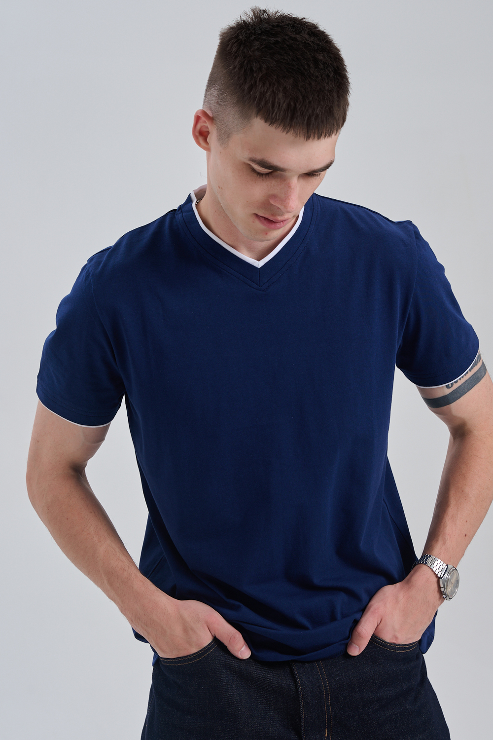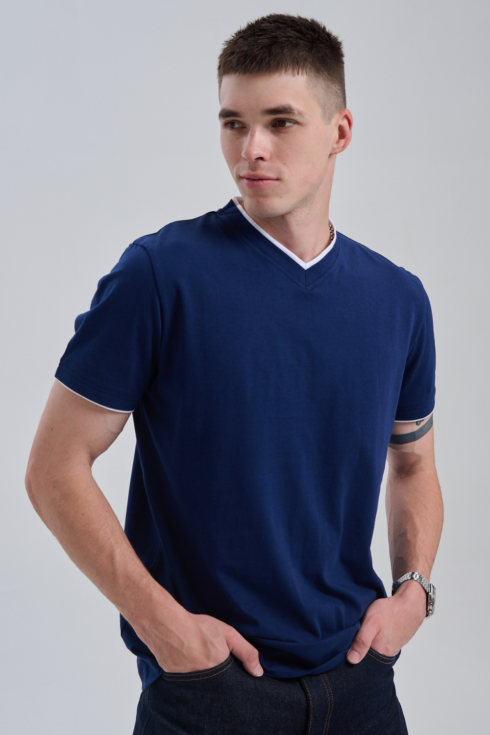 Футболка мужская однотонная с окантовкой из плотного дышащего хлопка. Модель в расслабленном молодежном стиле. Свободный прямой крой – база для любого гардероба. Представлены мягкие футболки стандартных размеров, подходят на высокий рост. С усиленным V-Образным вырезом и окантовкой, подойдет для тренировок, офиса, учебы, активного отдыха, туристических поездок, встреч с друзьями и дома.