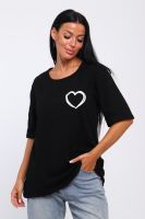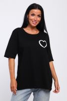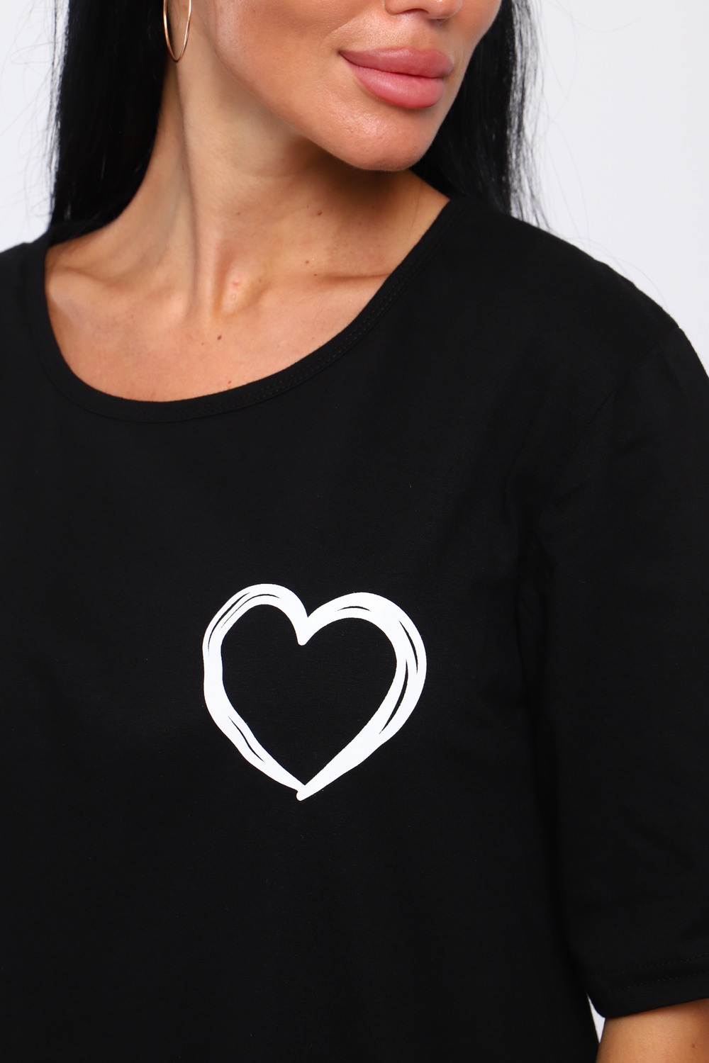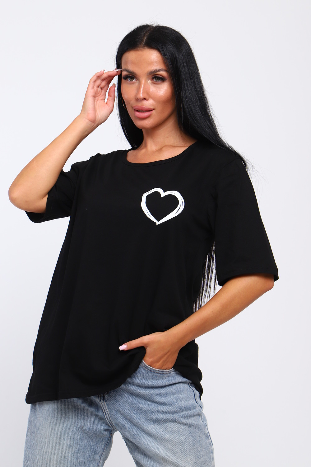 Футболка базовая из 100% хлопка. Свободный фасон прямого силуэта и рукав до локтя со спущенным плечом обеспечивают свободу движений. Крой oversize будет хорошо продаваться в любое время года. Широкий размерный ряд от 48 до 66 включает большие размеры. Качественный трикотаж и модный принт сердца подойдет любой аудитории от подростков для взрослых дам.
