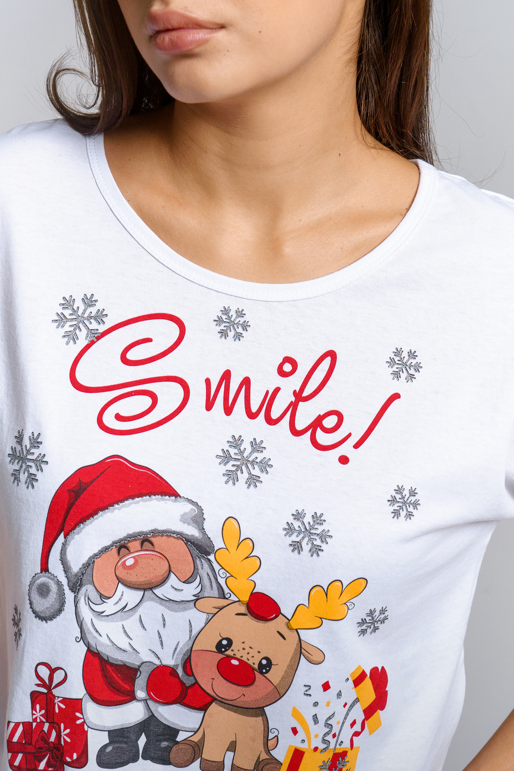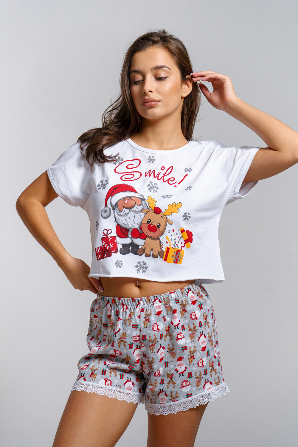 Оригинальный комплект из шорт футболки с новогодним принтом. Нижние срезы шорт обработаны белым кружевом., верхний резинкой. Срезы горловины и пройм футболки окантованы, нижний - оставлен без обработки.