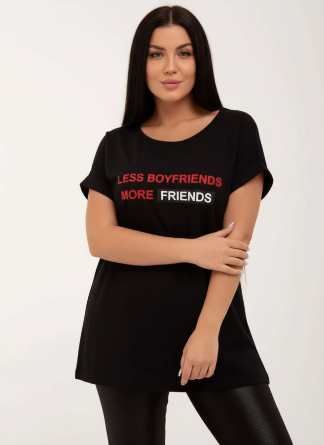 Модель свободного силуэта с принтом шелкография. Горловина круглая обработана обтачкой. Рукав спущенный, выше локтя.