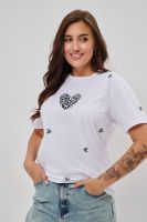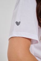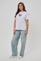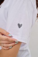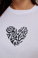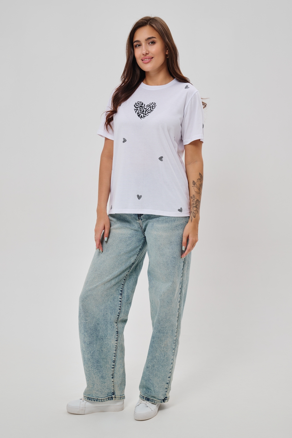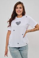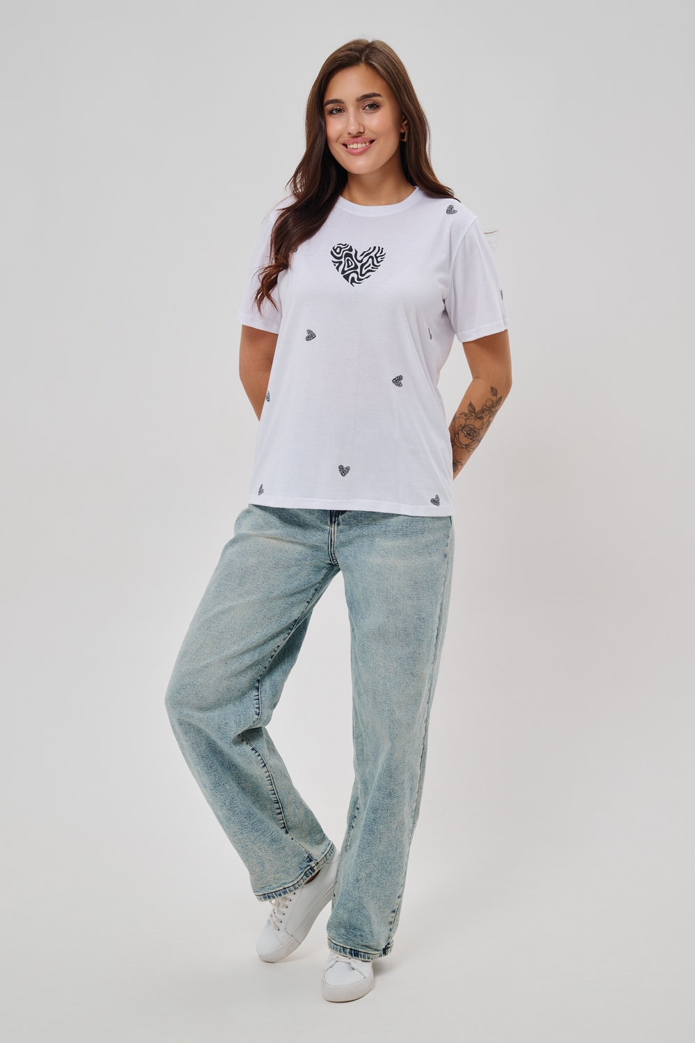 Женская футболка элегантного приталенного кроя с короткими рукавами и классическим круглым вырезом горловины. Минималистичный дизайн дополнен нежными маленькими принтами в форме сердец с узором зебры, создающими тонкий акцент на образ. Материал приятен к телу, обеспечивает комфорт и свободу движений. Идеально подойдет для повседневного стиля, подчеркивая женственность и утонченность облика обладательницы.