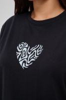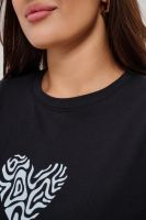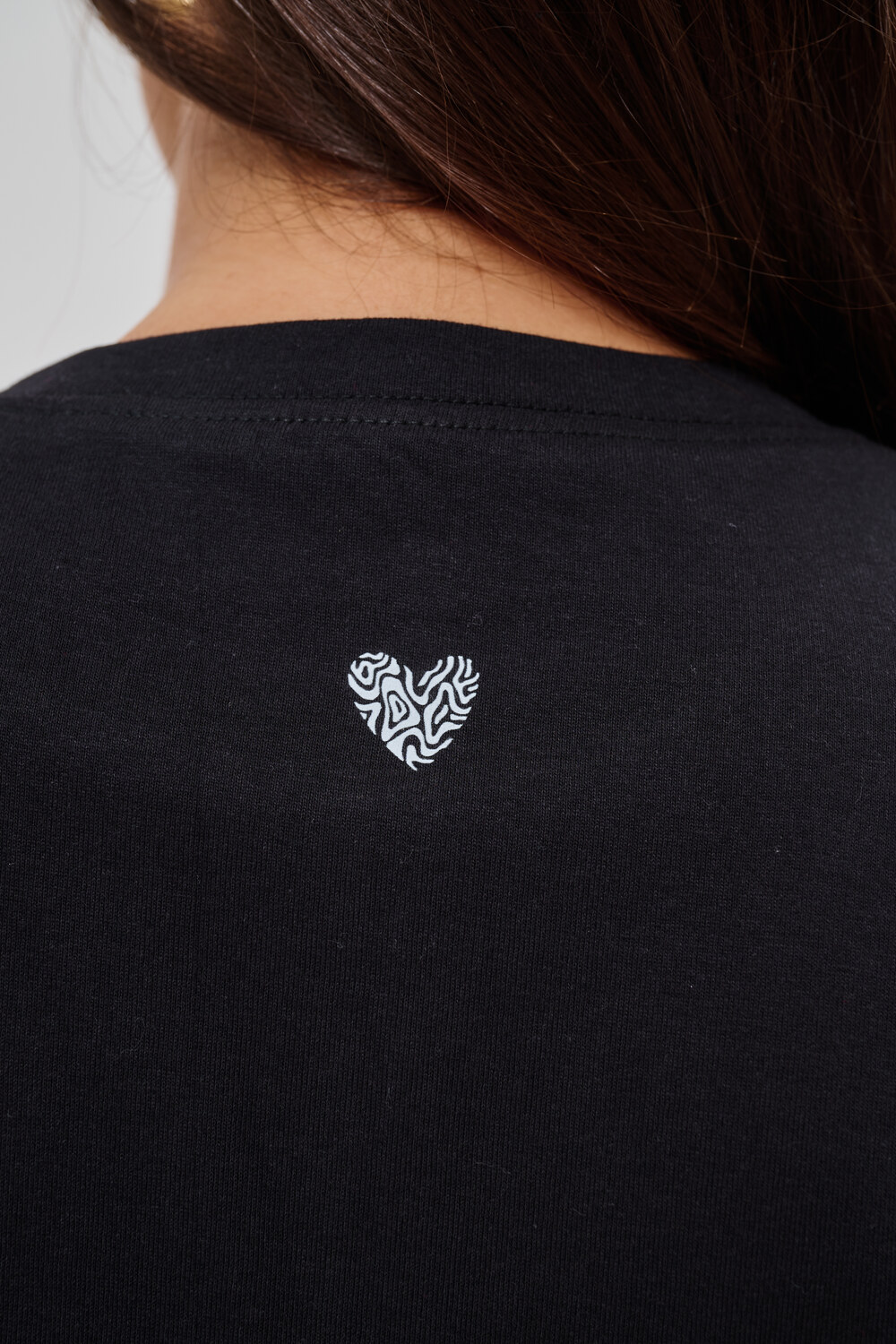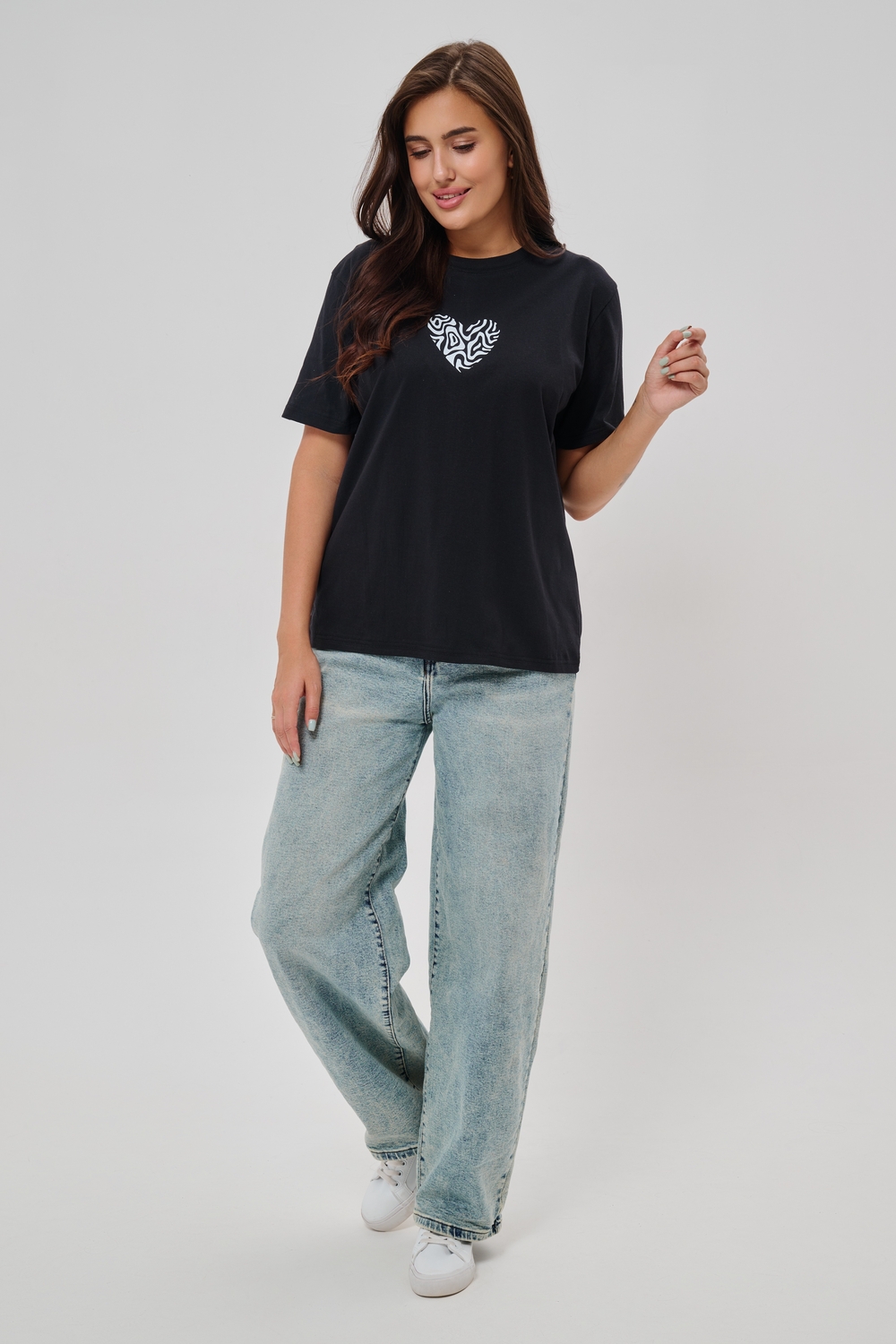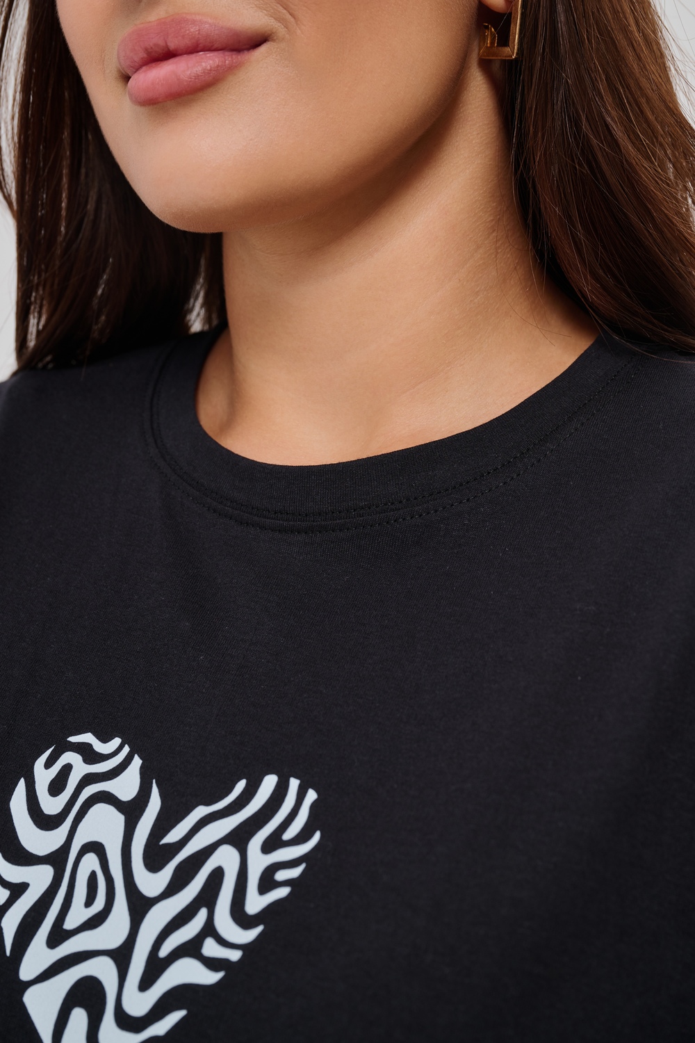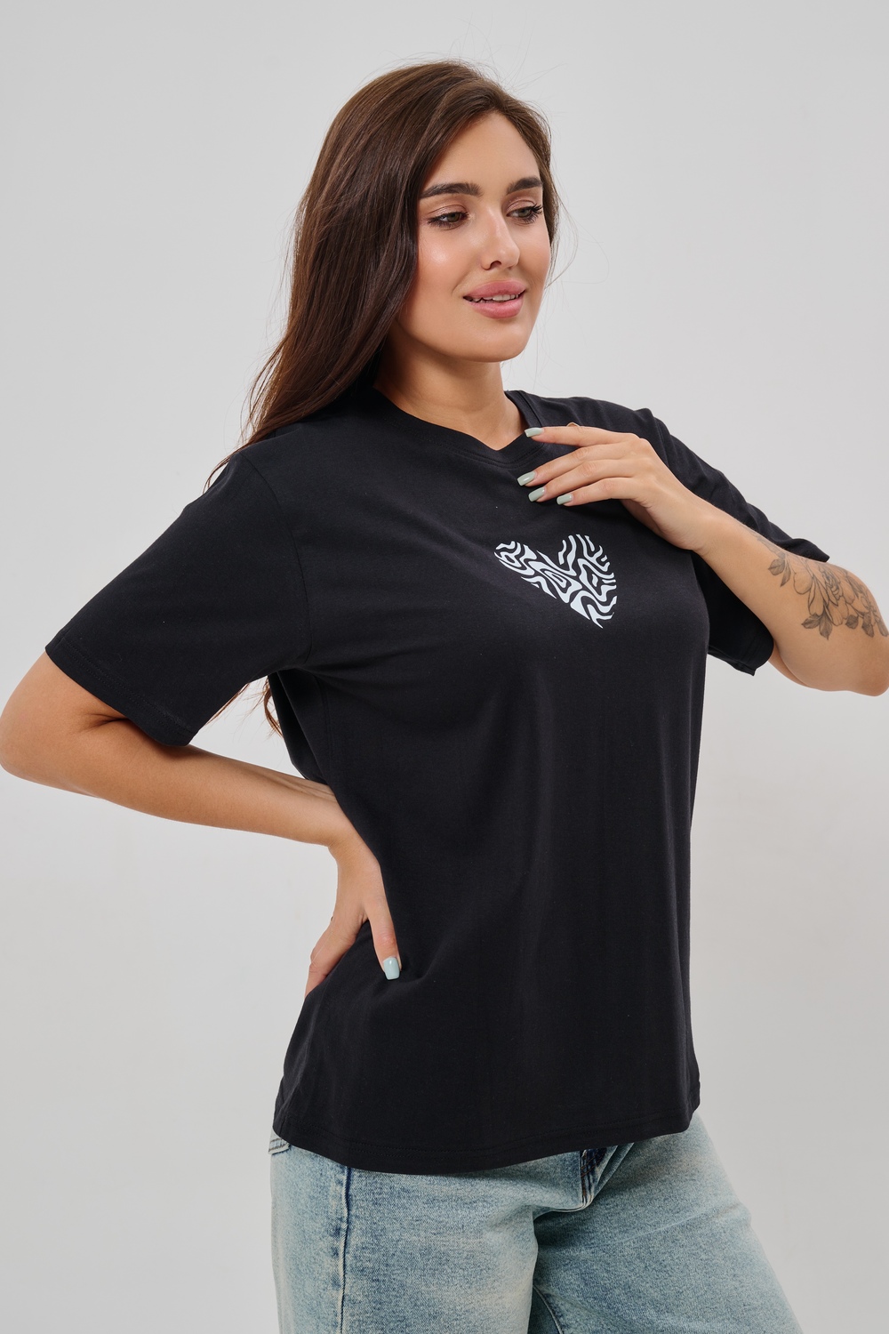 Женская футболка элегантного приталенного кроя с короткими рукавами и классическим круглым вырезом горловины. Минималистичный дизайн дополнен нежным принтом в форме сердца с узором зебры, создающими тонкий акцент на образ. Материал приятен к телу, обеспечивает комфорт и свободу движений. Идеально подойдет для повседневного стиля, подчеркивая женственность и утонченность облика обладательницы.