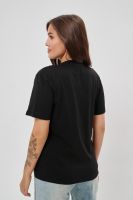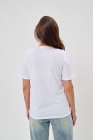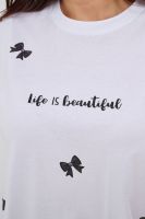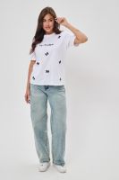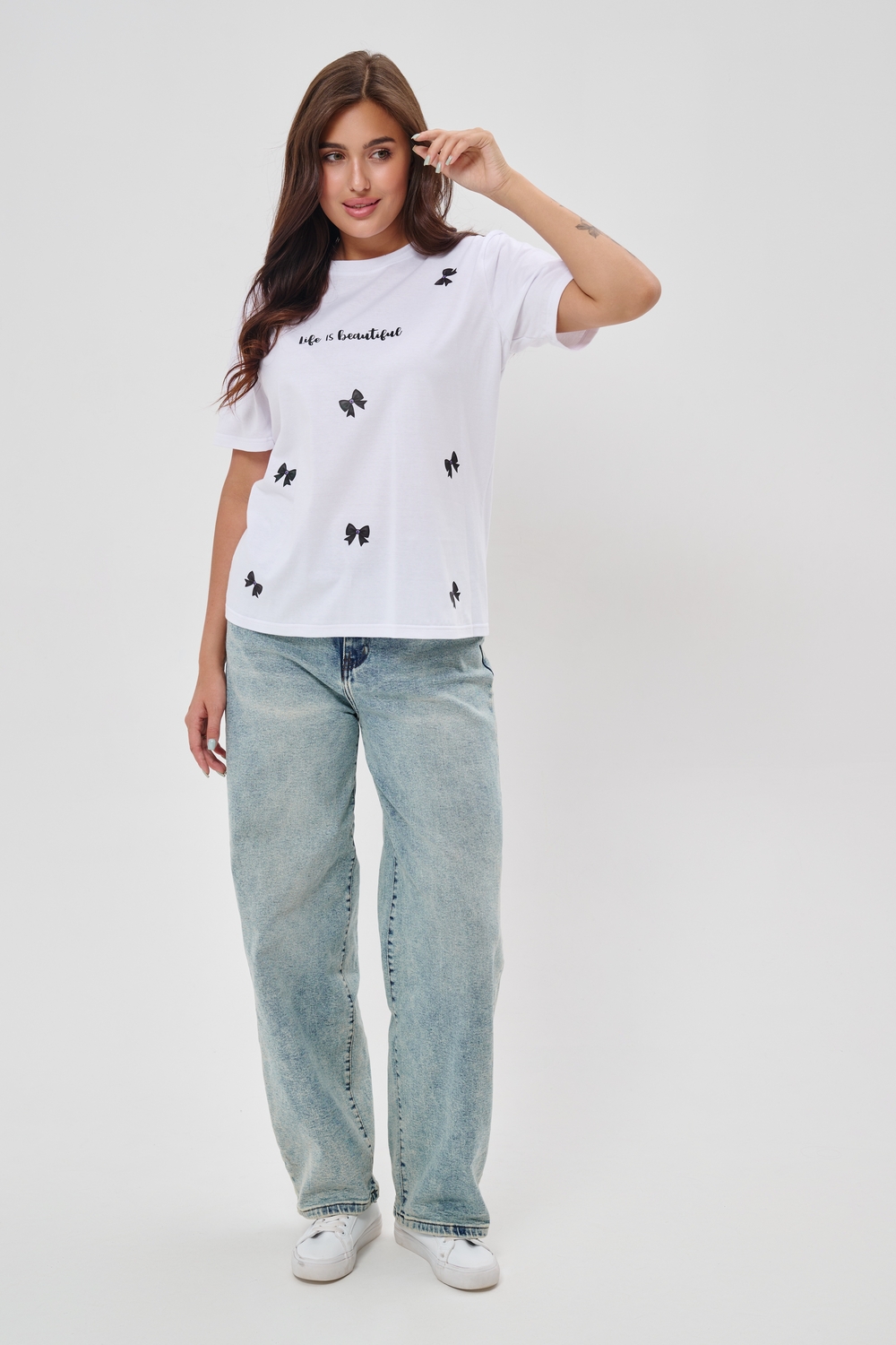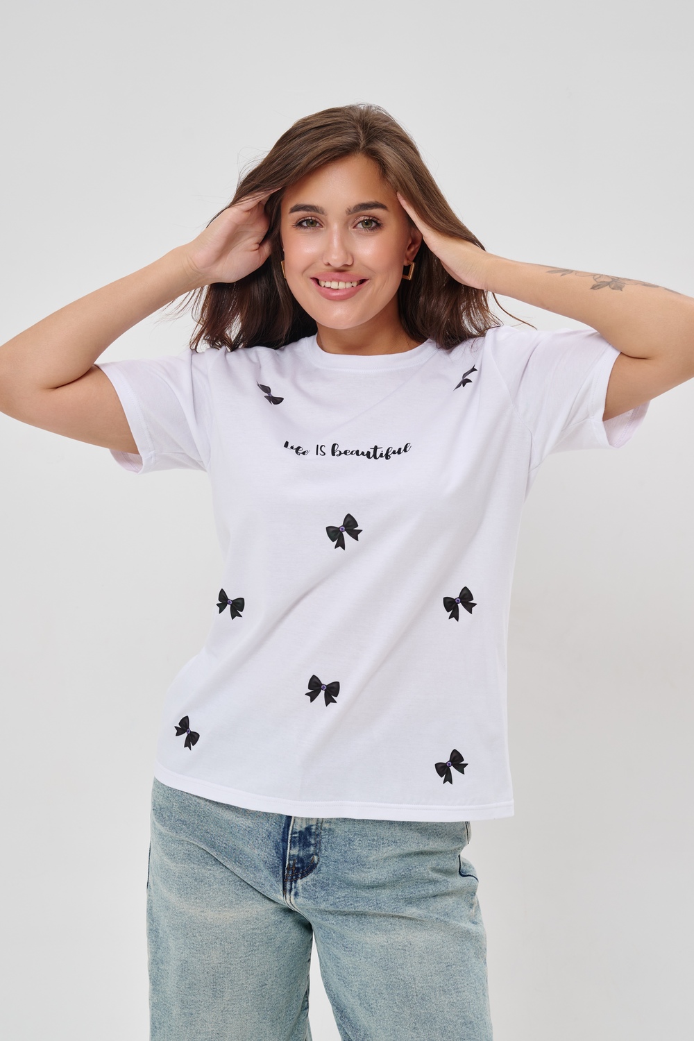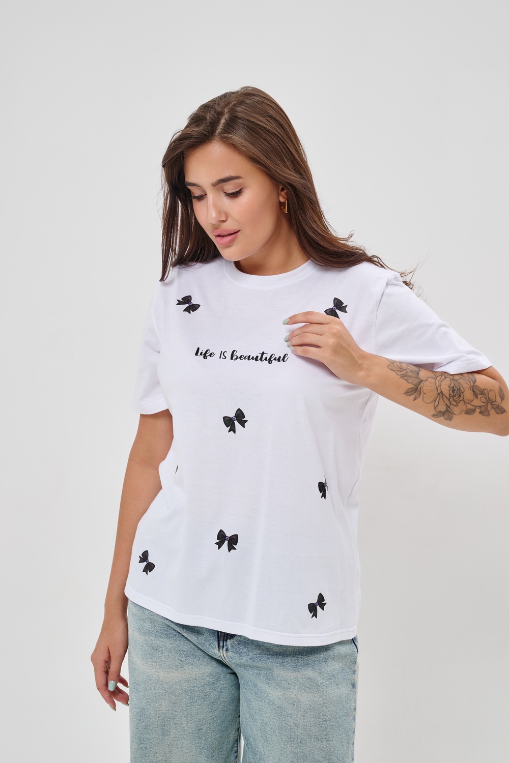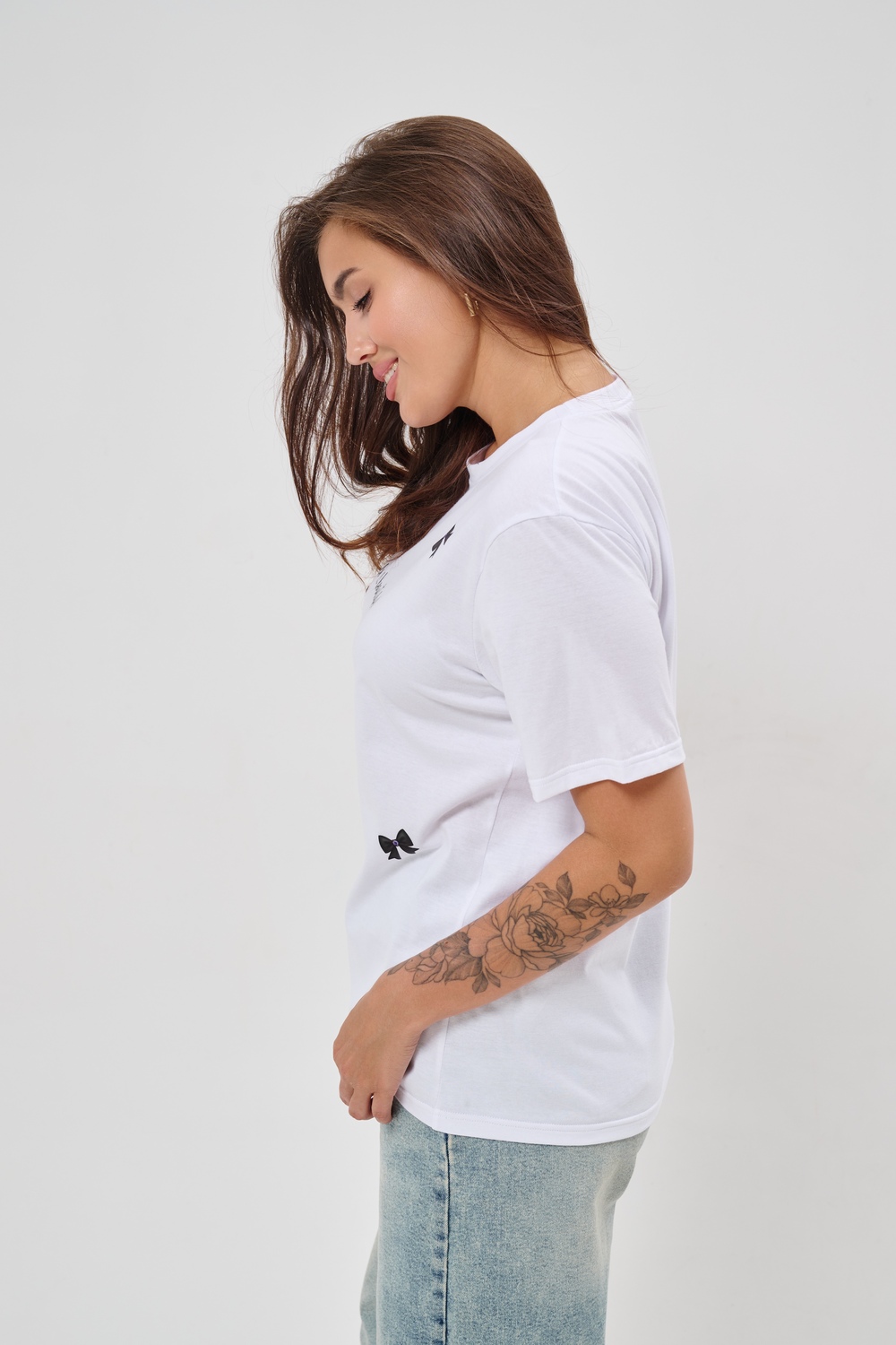 Женская футболка приталенного кроя, изготовлена из мягкого материала — кулирки. Элегантная форма с короткими рукавами и аккуратным круглым вырезом создают ощущение лёгкости и свежести образа. Особенное внимание привлекает надпись на груди, украшенная минималистичными маленькими бантиками в сдержанном чёрном цвете. Такая деталь добавляет образу шарма и игривости, оставаясь одновременно простой и изысканной. Футболка легко впишется в гардероб современной девушки, добавив нотку кокетства любому образу.
