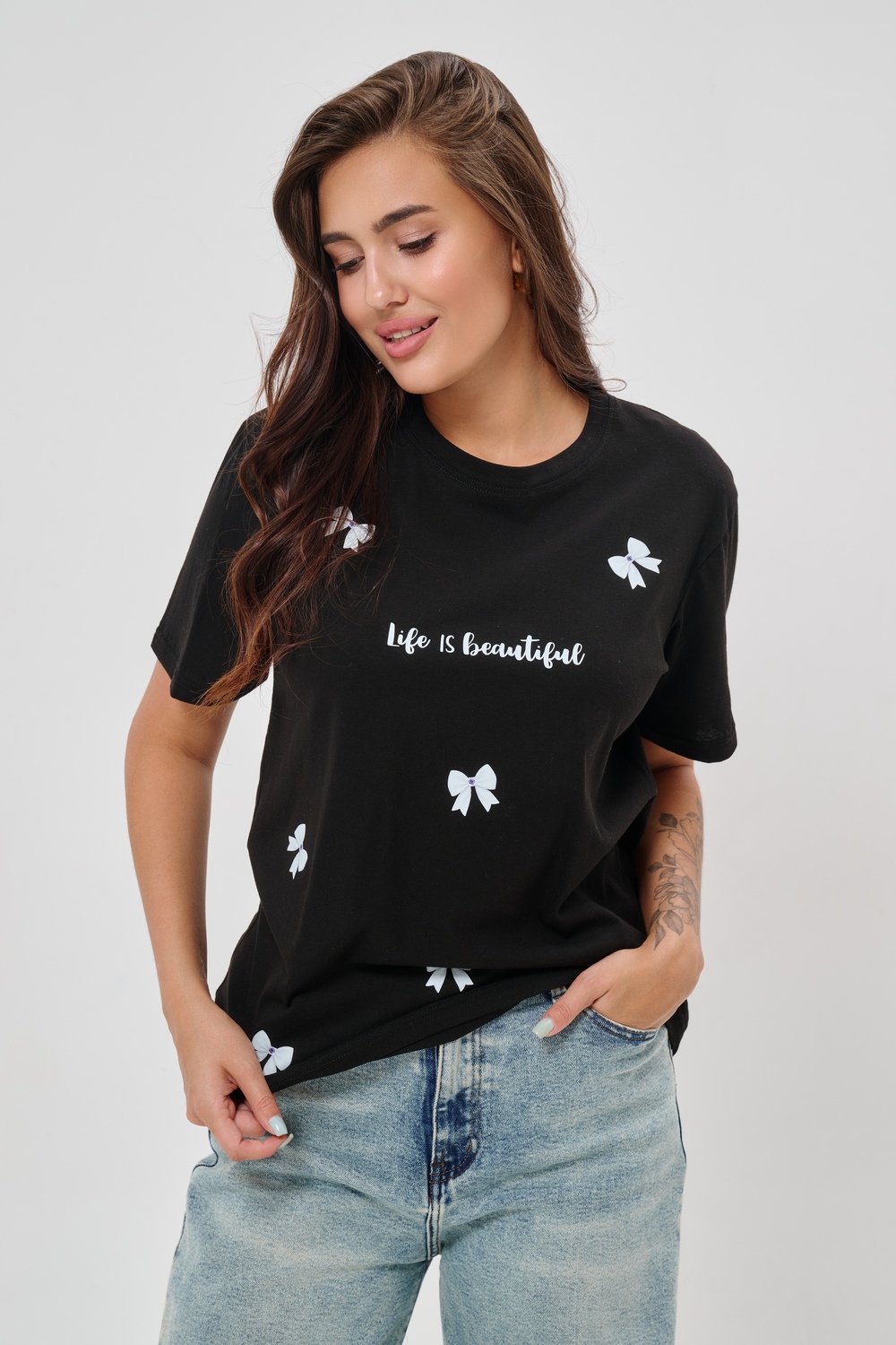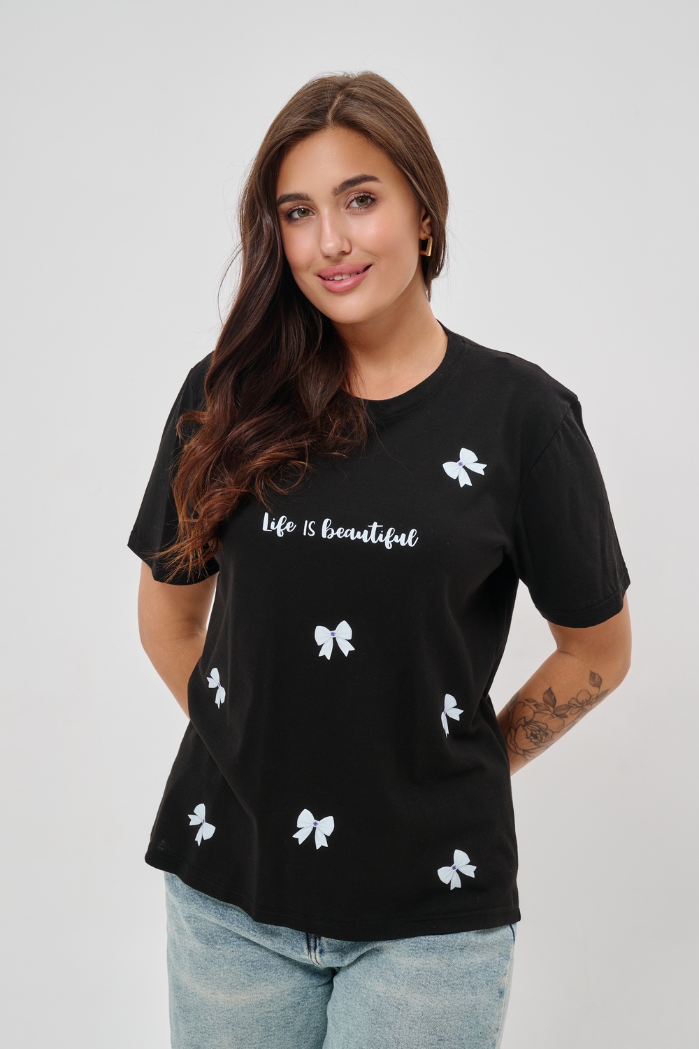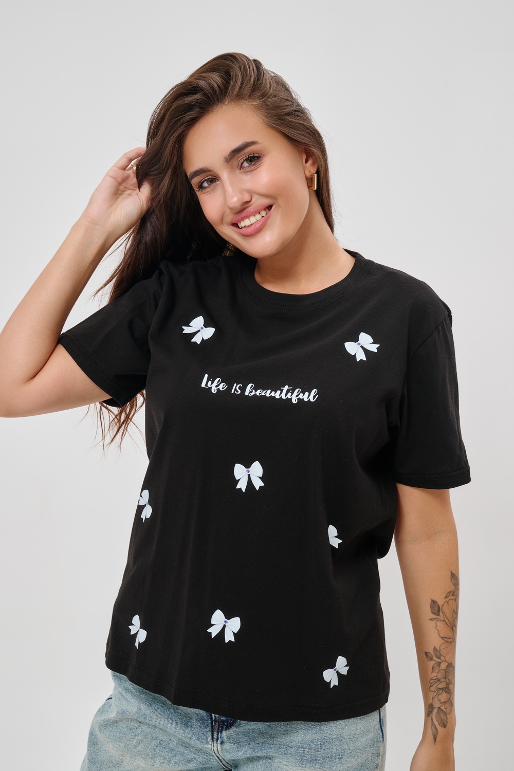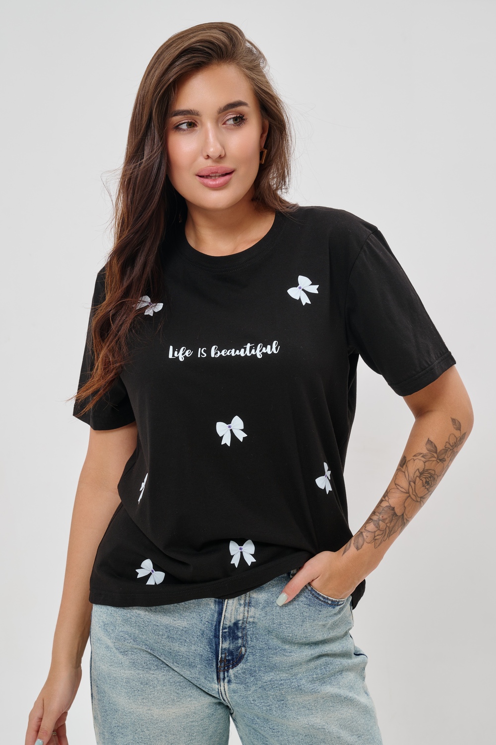 Женская футболка приталенного кроя, изготовлена из мягкого материала — кулирки. Элегантная форма с короткими рукавами и аккуратным круглым вырезом создают ощущение лёгкости и свежести образа. Особенное внимание привлекает надпись на груди, украшенная минималистичными маленькими бантиками в сдержанном чёрном цвете. Такая деталь добавляет образу шарма и игривости, оставаясь одновременно простой и изысканной. Футболка легко впишется в гардероб современной девушки, добавив нотку кокетства любому образу.