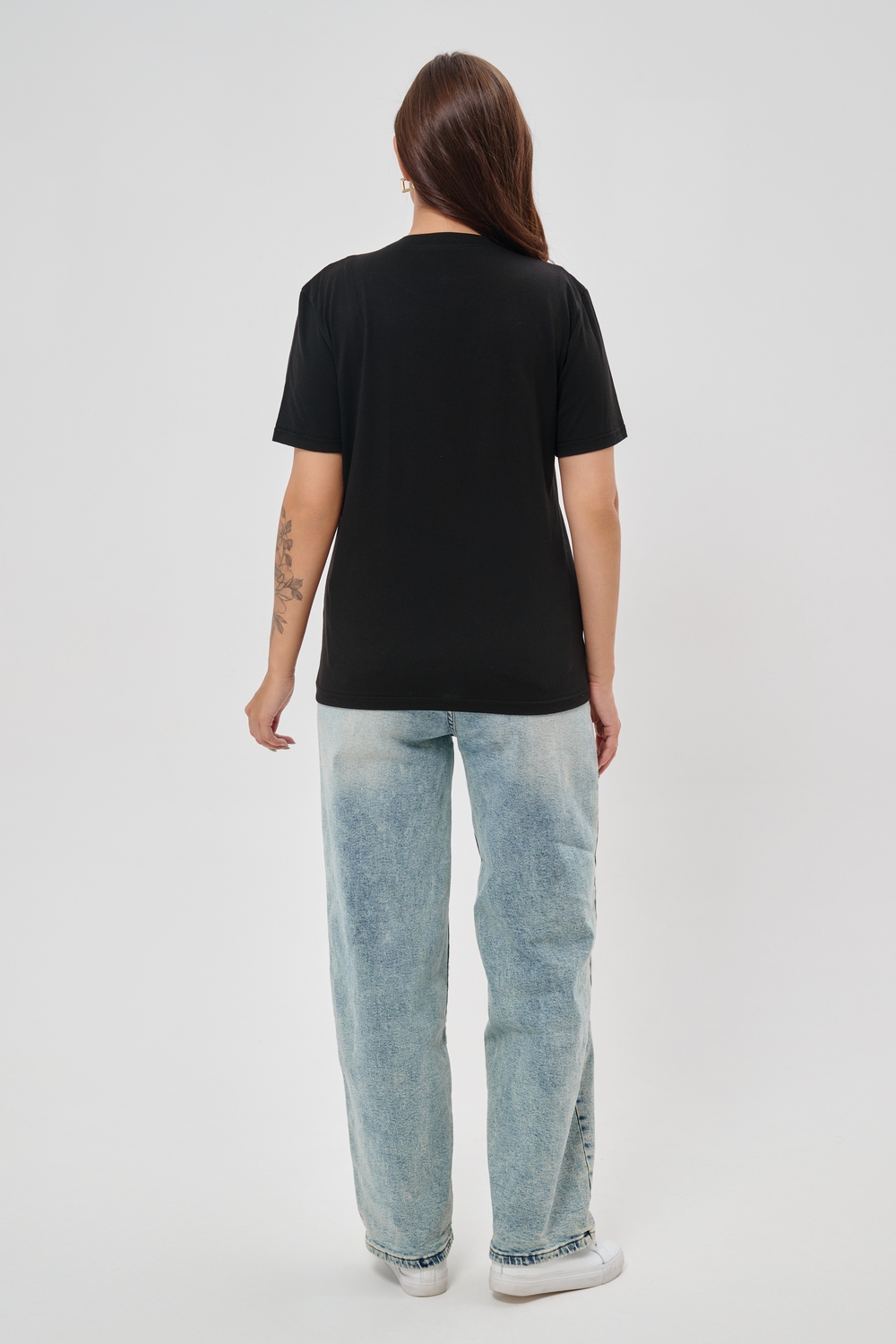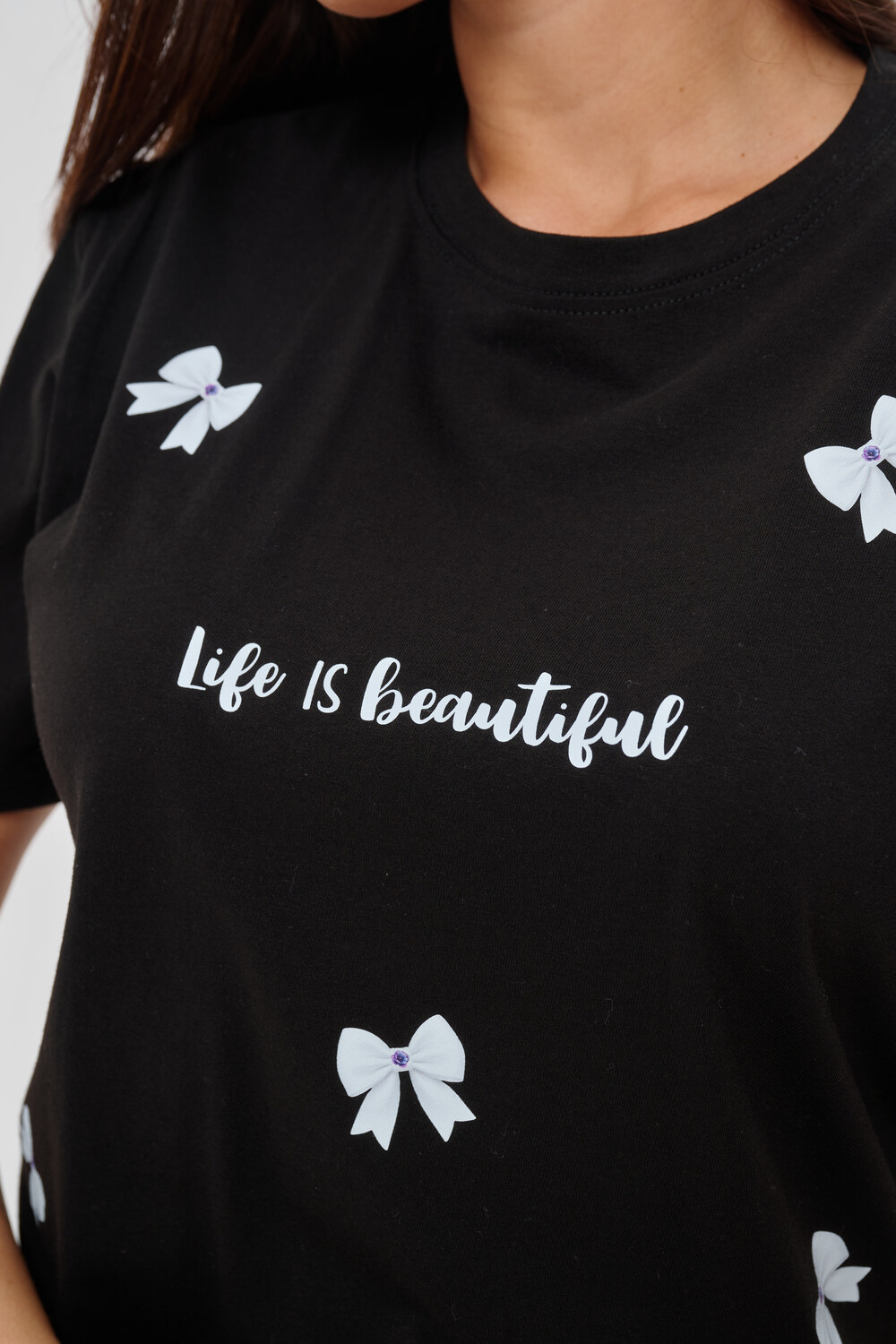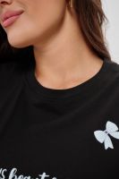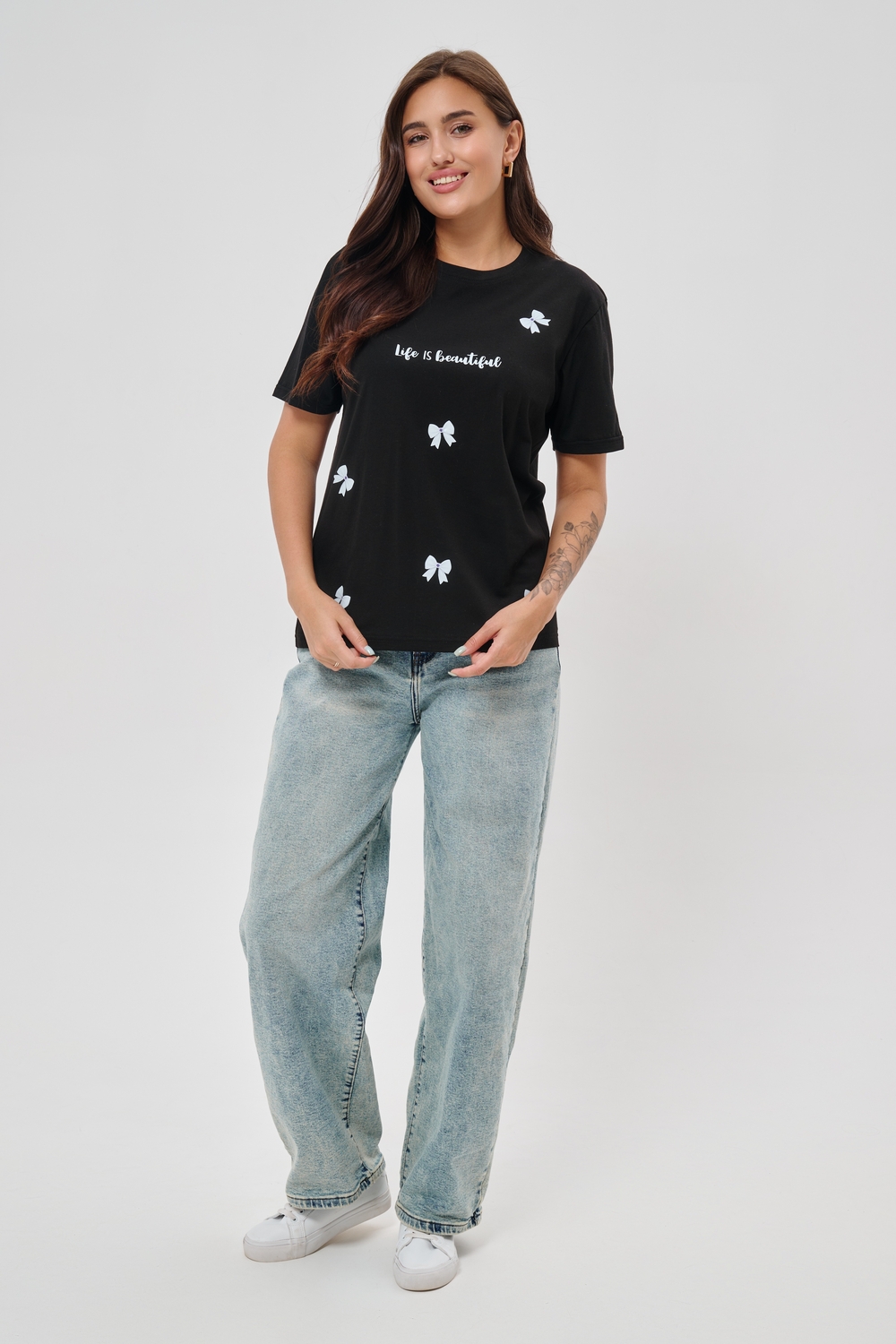 Женская футболка приталенного кроя, изготовлена из мягкого материала — кулирки. Элегантная форма с короткими рукавами и аккуратным круглым вырезом создают ощущение лёгкости и свежести образа. Особенное внимание привлекает надпись на груди, украшенная минималистичными маленькими бантиками в сдержанном чёрном цвете. Такая деталь добавляет образу шарма и игривости, оставаясь одновременно простой и изысканной. Футболка легко впишется в гардероб современной девушки, добавив нотку кокетства любому образу.