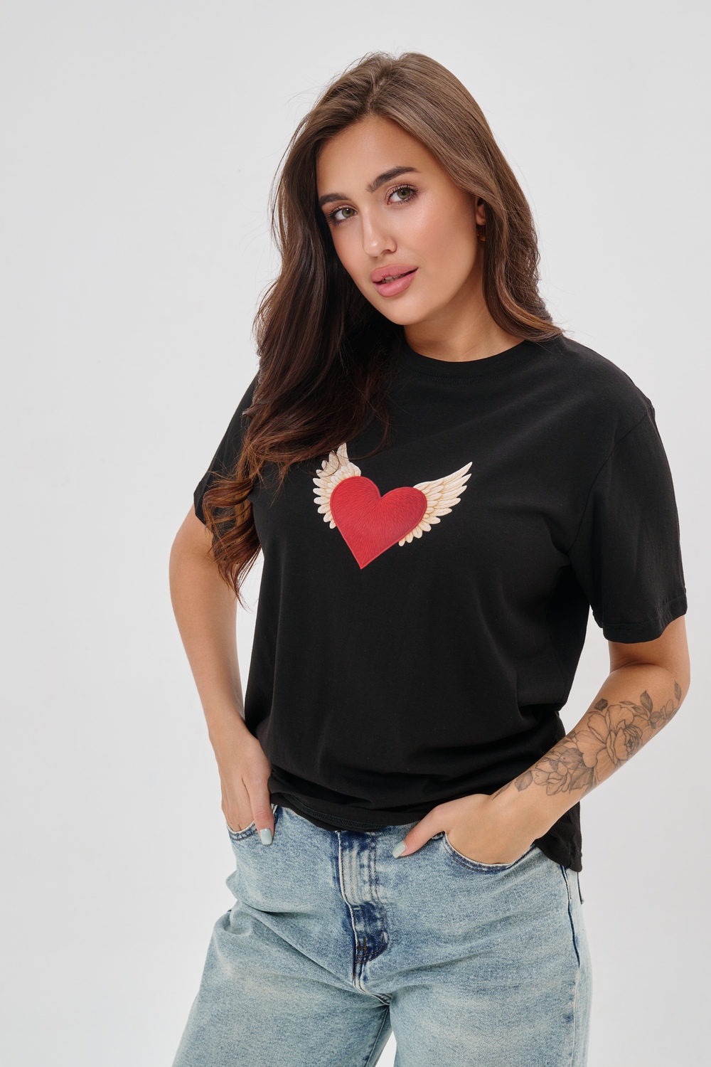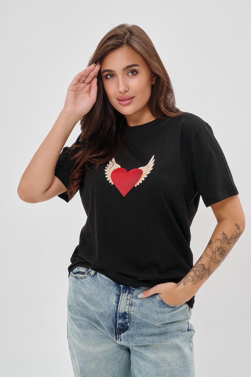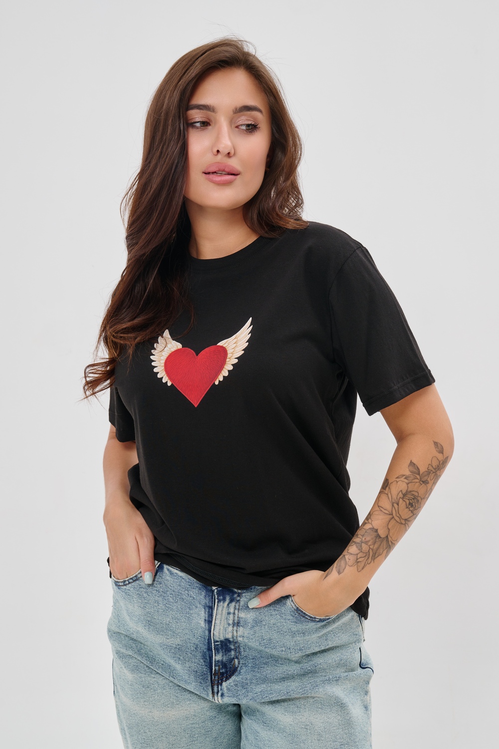 Женская футболка приталенного кроя из кулирки, идеально подчеркивает линии фигуры. Классический короткий рукав и круглый вырез делают её удобной и повседневной. Центральная деталь изделия — оригинальный принт на груди в виде красного сердца с крыльями, символично объединяя романтичность и воздушность. Такая футболка обязательно привлечёт внимание и станет любимой вещью вашего гардероба!