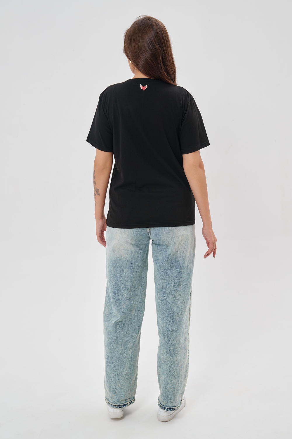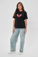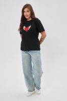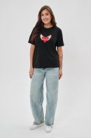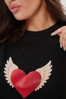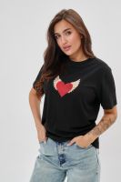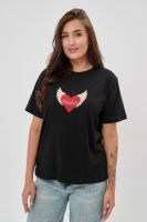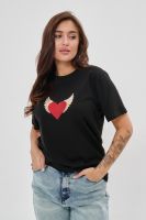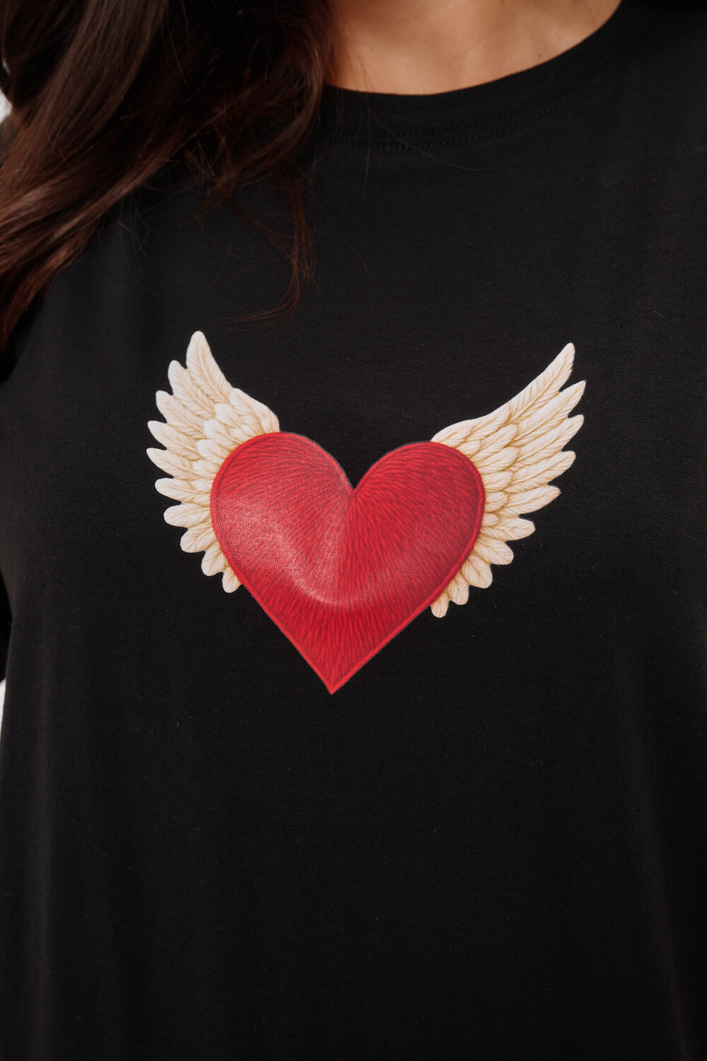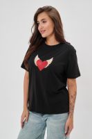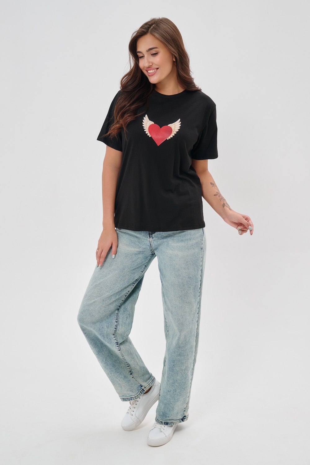 Женская футболка приталенного кроя из кулирки, идеально подчеркивает линии фигуры. Классический короткий рукав и круглый вырез делают её удобной и повседневной. Центральная деталь изделия — оригинальный принт на груди в виде красного сердца с крыльями, символично объединяя романтичность и воздушность. Такая футболка обязательно привлечёт внимание и станет любимой вещью вашего гардероба!