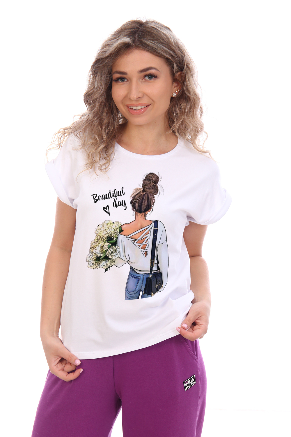 Футболка женская с оригинальным принтом, из хлопковой ткани с лайкрой. Ткань держит форму, не вытягивается, приятная на ощупь. Стильная футболка оригинального фасона. Посадка свободная.