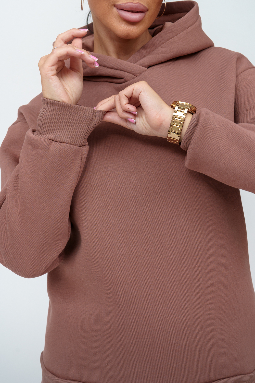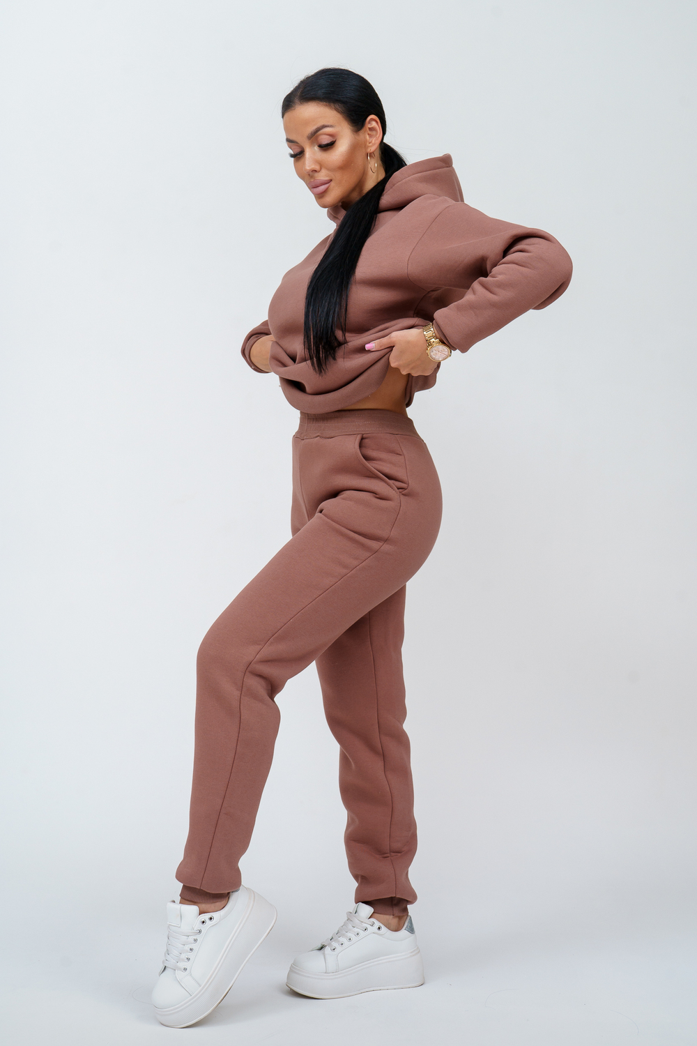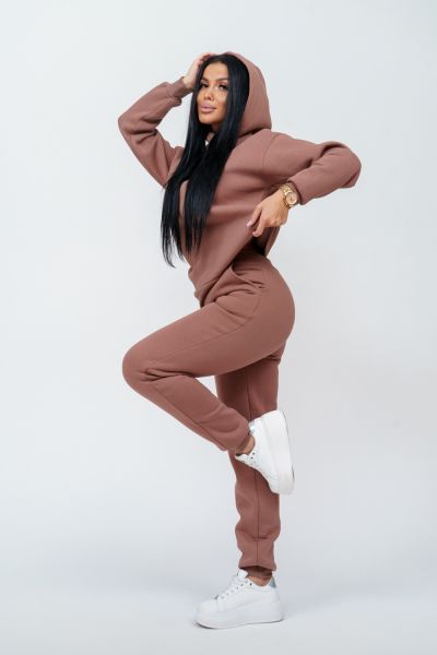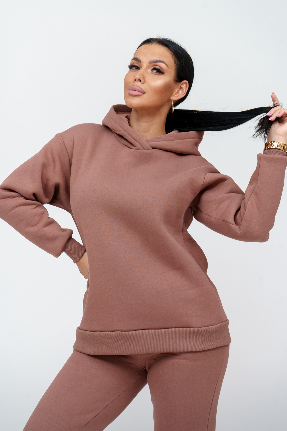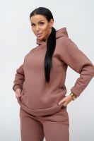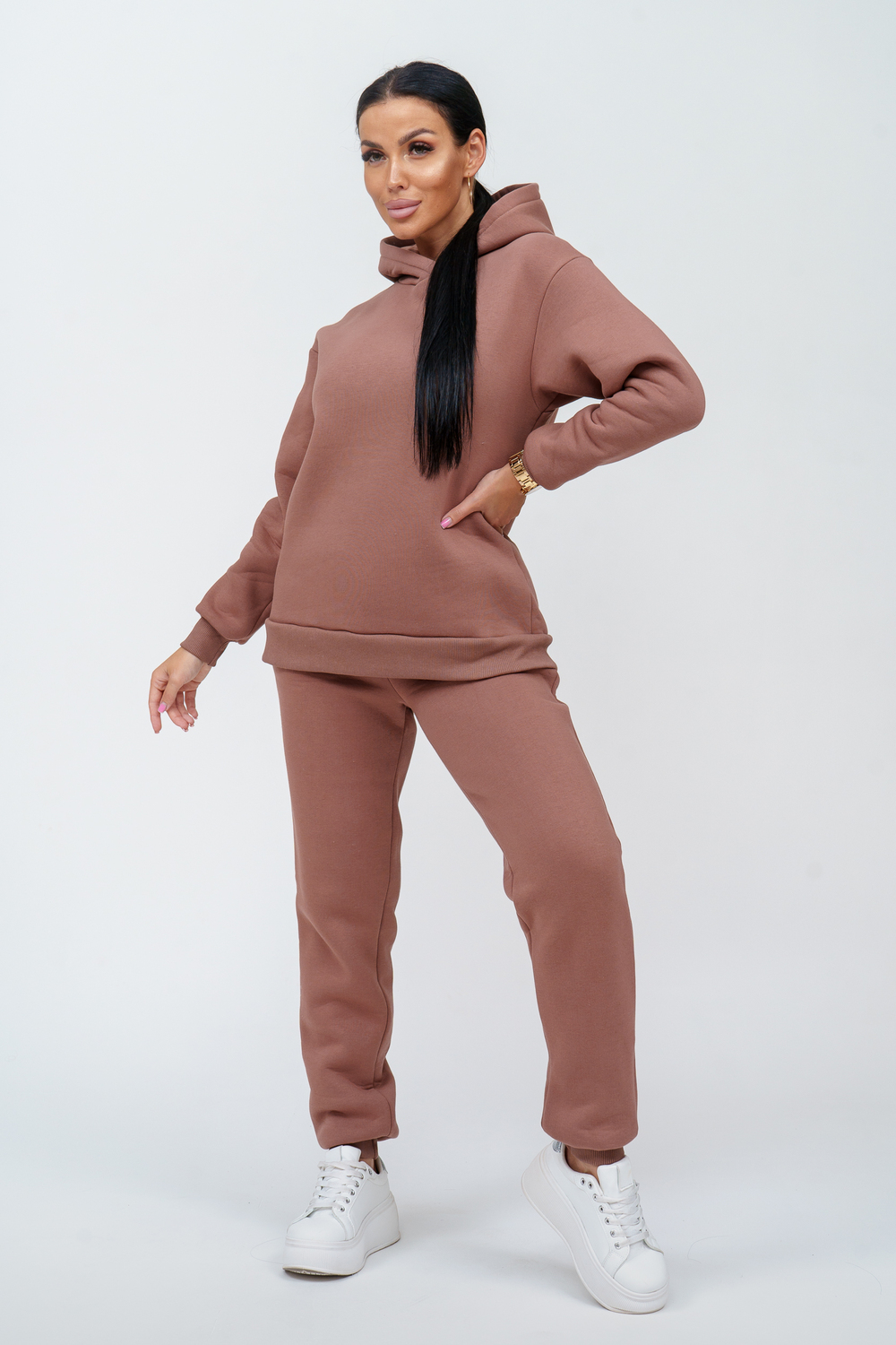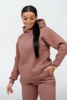 Материал: футер трехнитка с начесом Состав: 70% хлопок, 30% полиэстер Костюм женский. Куртка со спущенным рукавом на манжете и двойным капюшоном. Брюки на притачном поясе с резинкой, по низу изделия манжета.