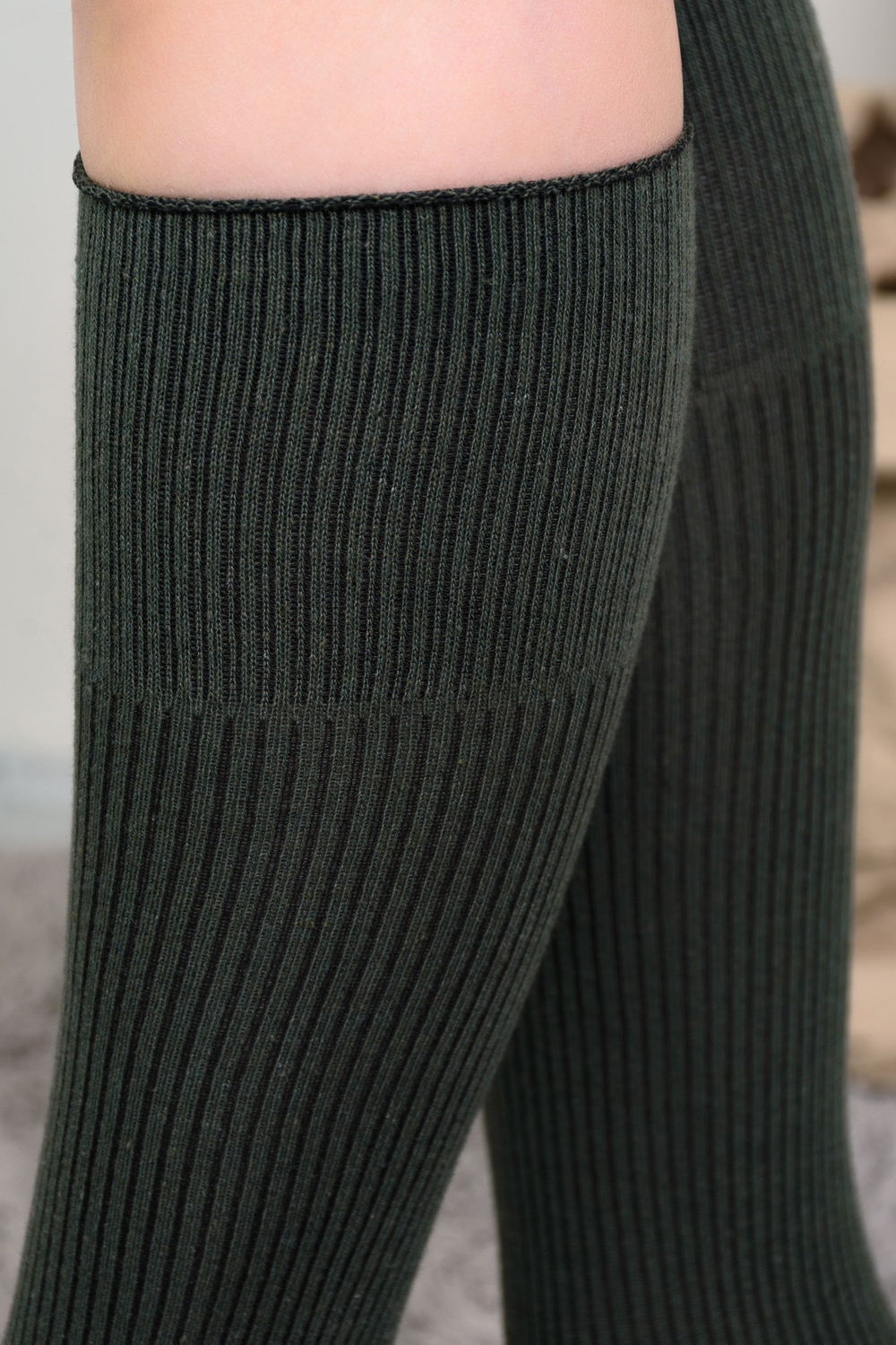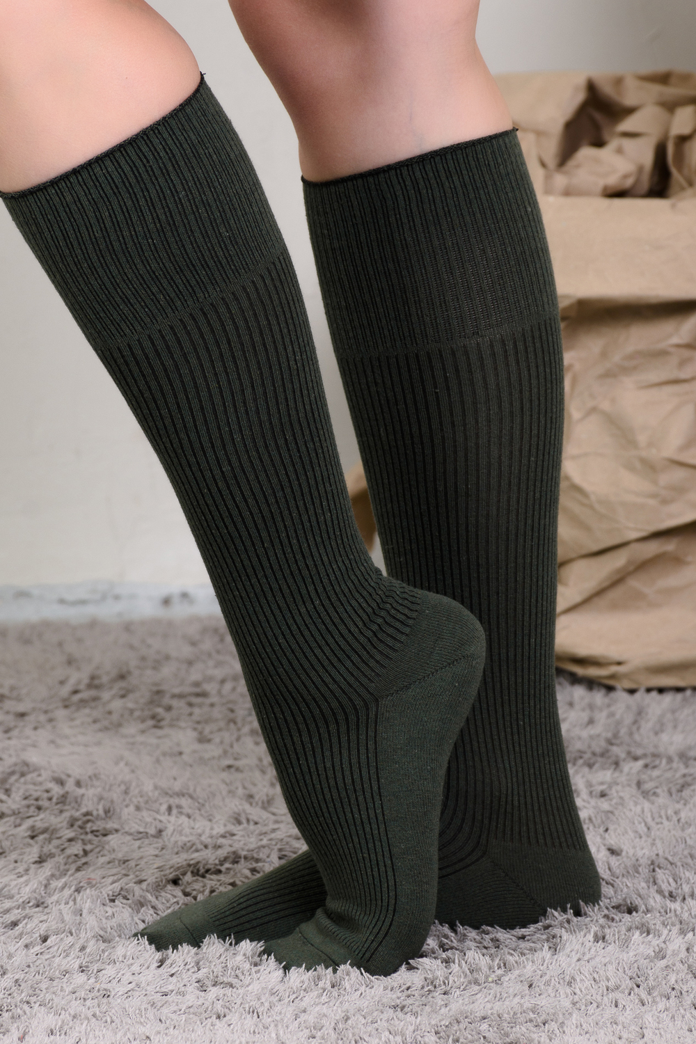 Высокие женские гольфы. Мягкая резинка сверху, по всей поверхности вывязаны полосы, подошва гладкая. В упаковке 2 пары одного цвета