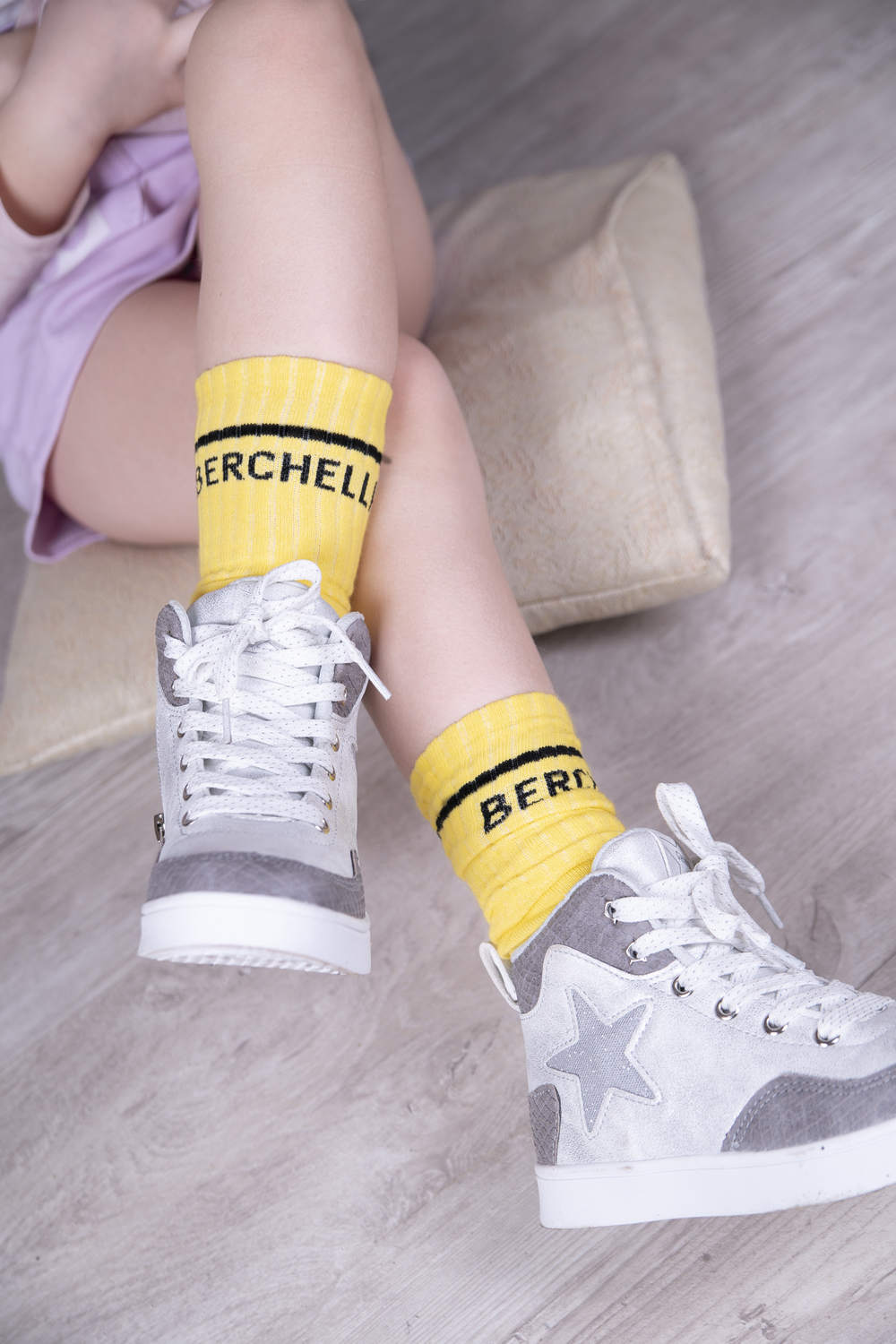 Стильные детские гольфы с фирменной надписью Berchelli и широкой резинкой по верху. В упаковке 2 пары - по 1 паре каждой расцветки