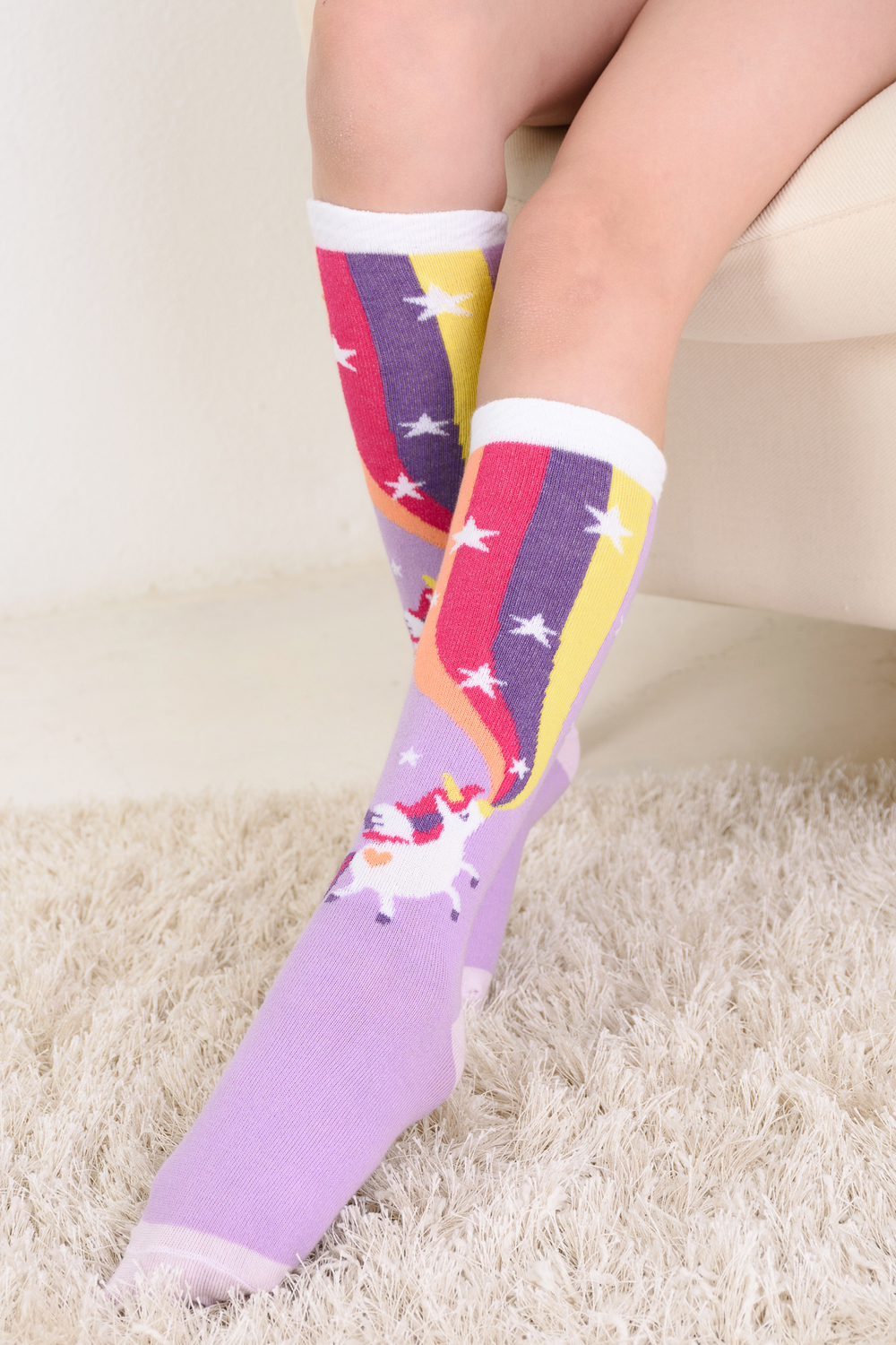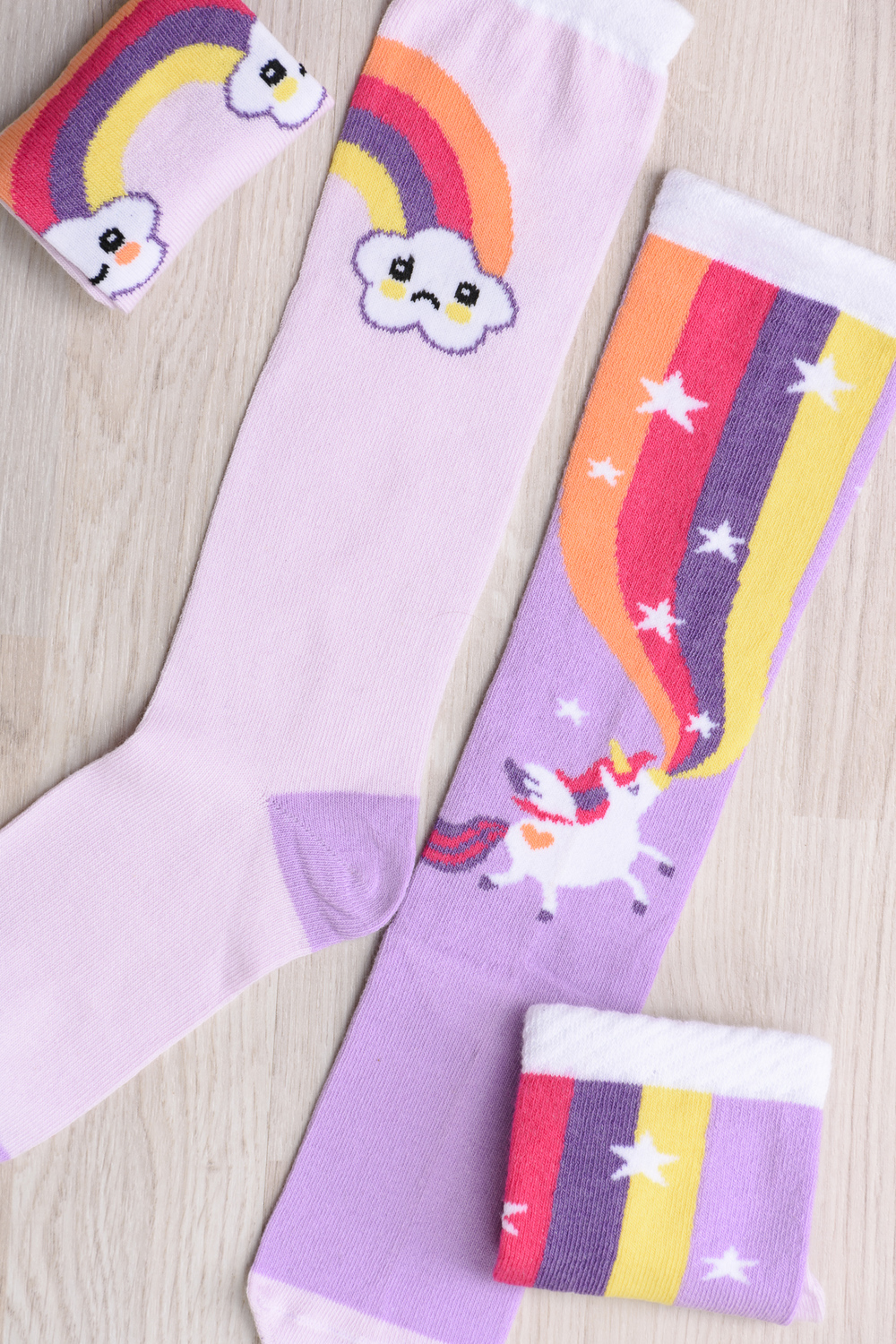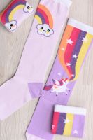 Яркие детские гольфы с рисунками в виде радуги и единорогов. Поднимут настроение вашему ребенку и станут любимым предметом гардероба. В упаковке 2 пары
