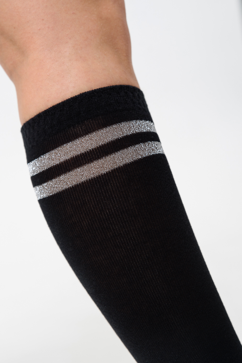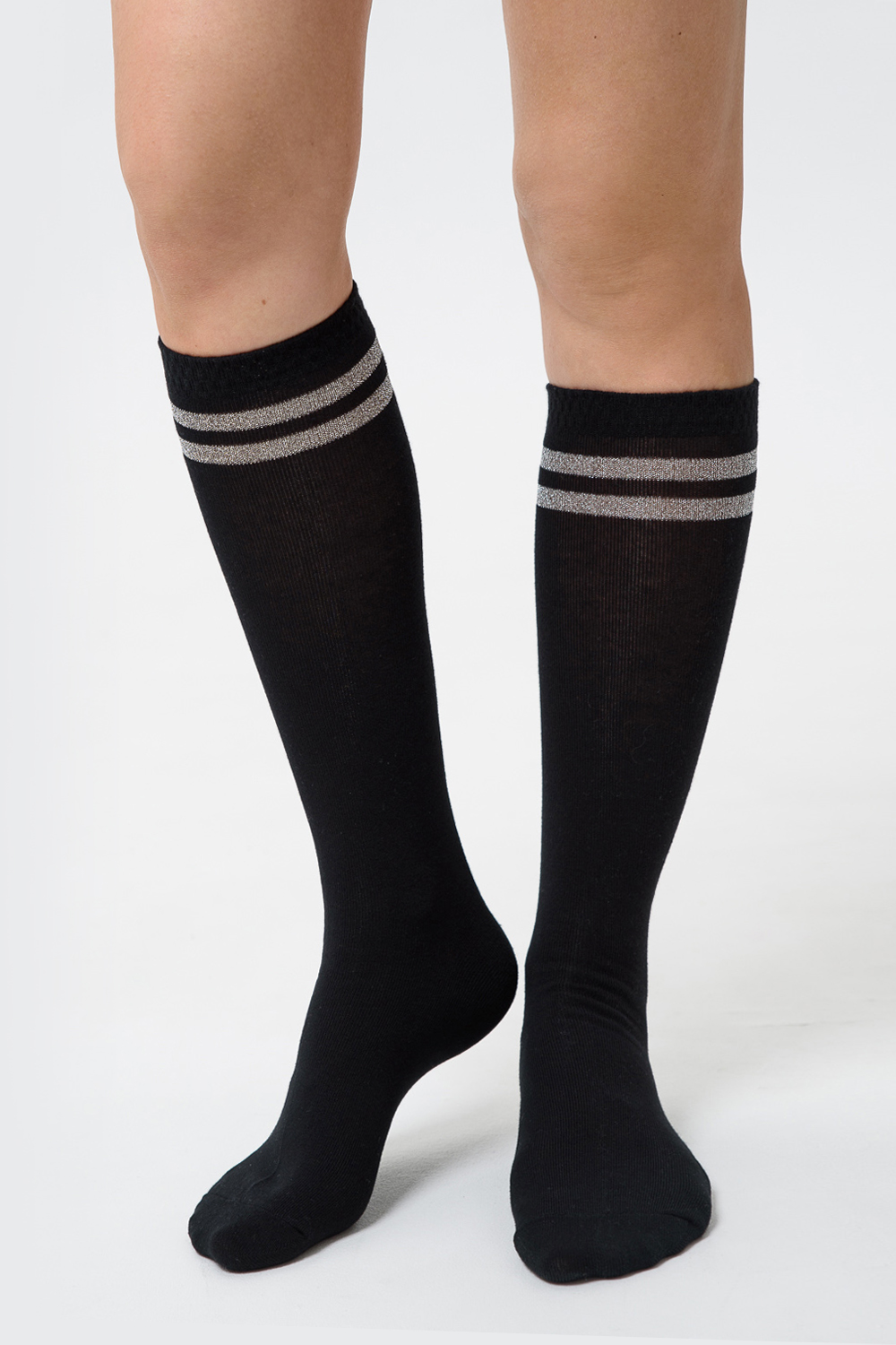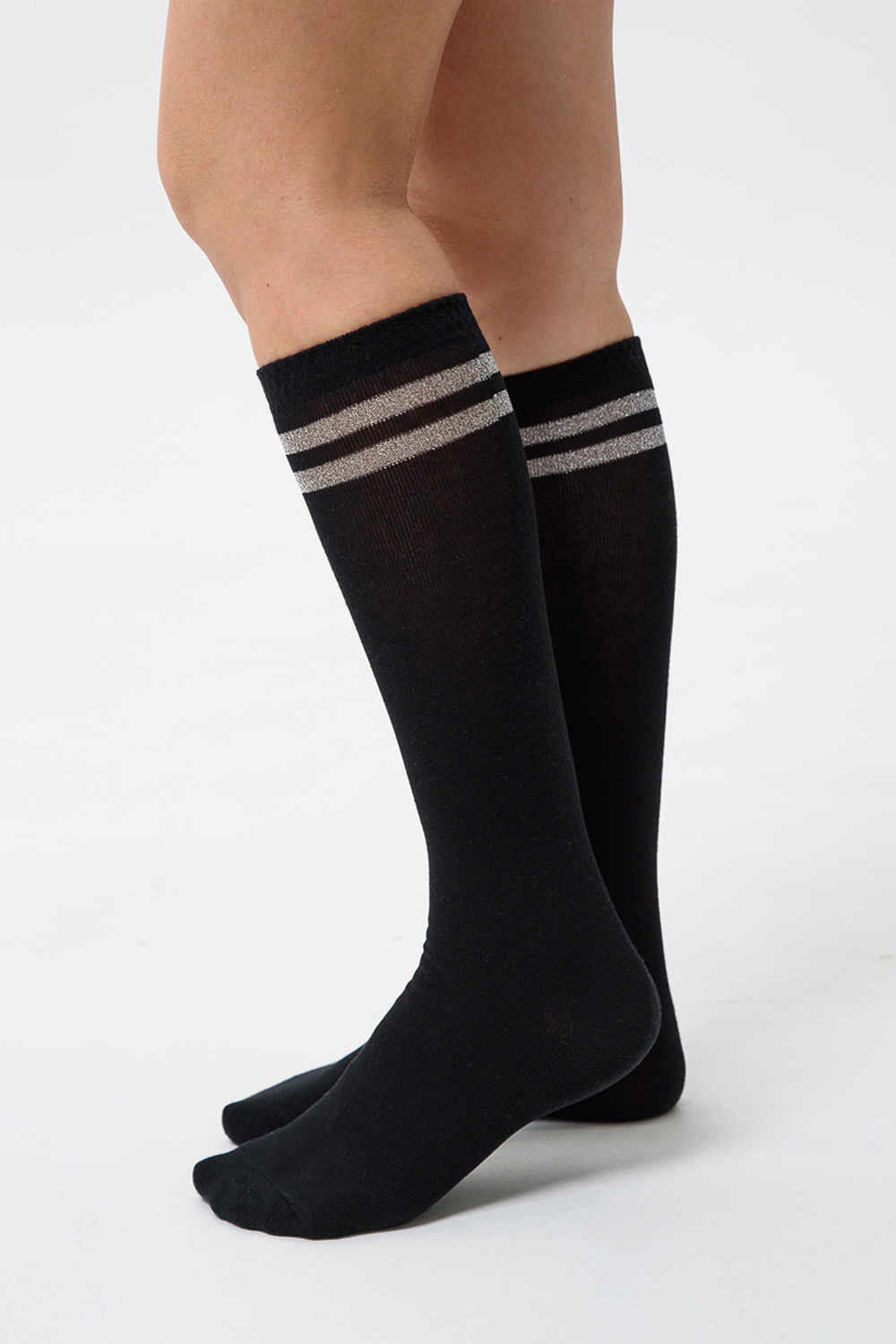 Комплект из двух пар женских гольф. На верхней части носка у самой резинки две полоски выполнены из люрекса - блестящего материала. В комплекте белый+черный - одна пара белого цвета, одна черного.