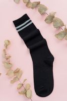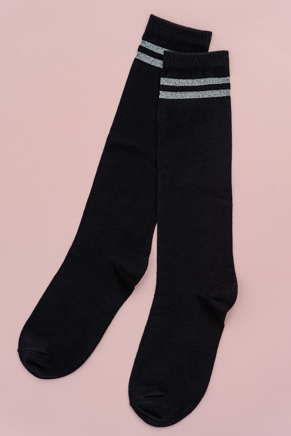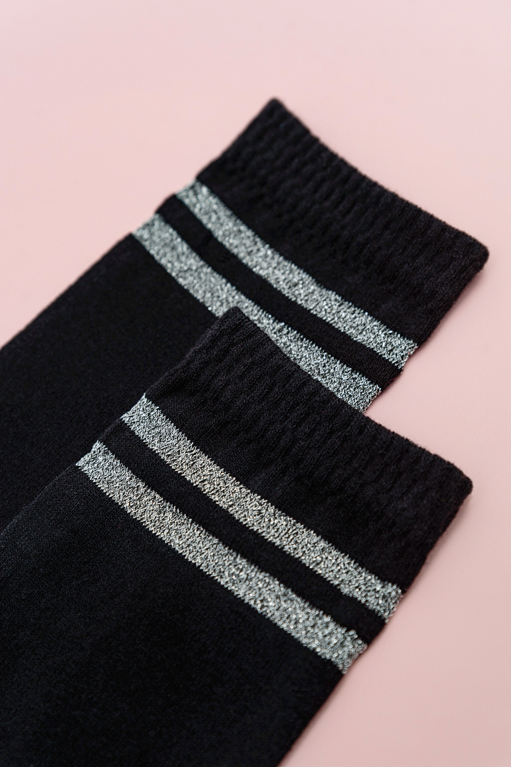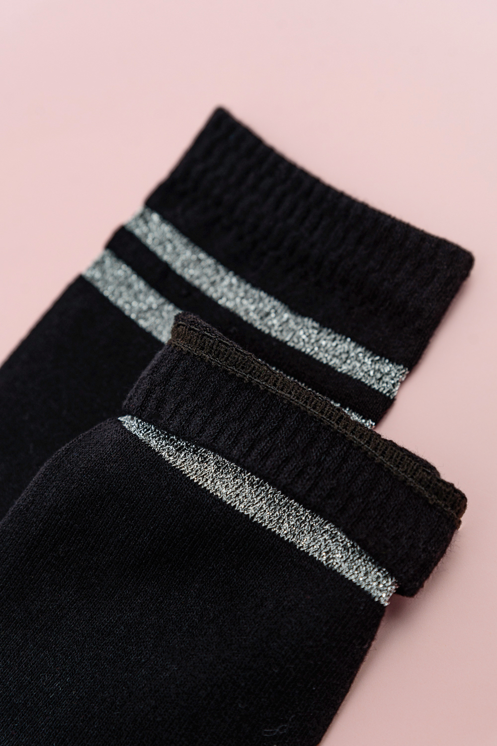 Комплект из двух пар женских гольф. На верхней части носка у самой резинки две полоски выполнены из люрекса - блестящего материала. В комплекте белый+черный - одна пара белого цвета, одна черного.