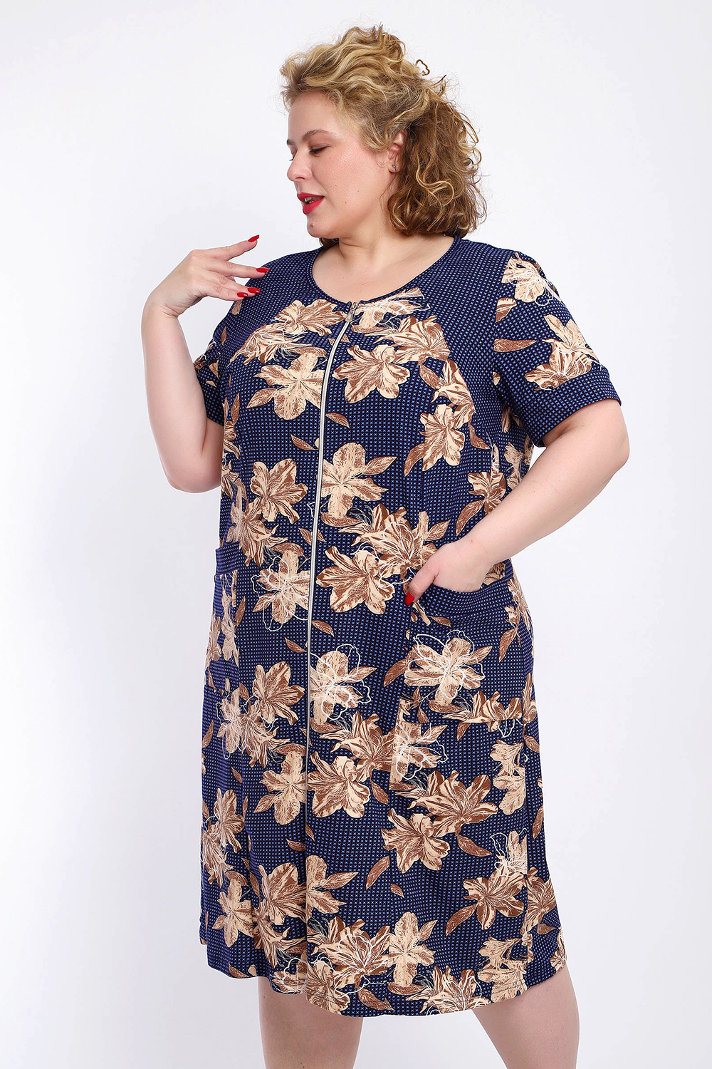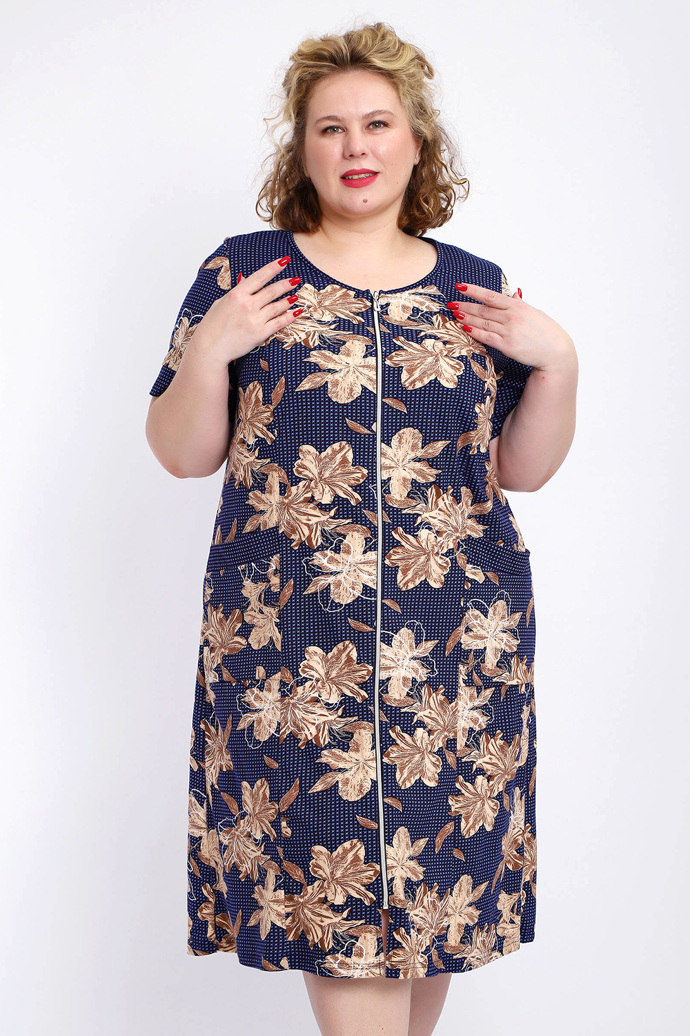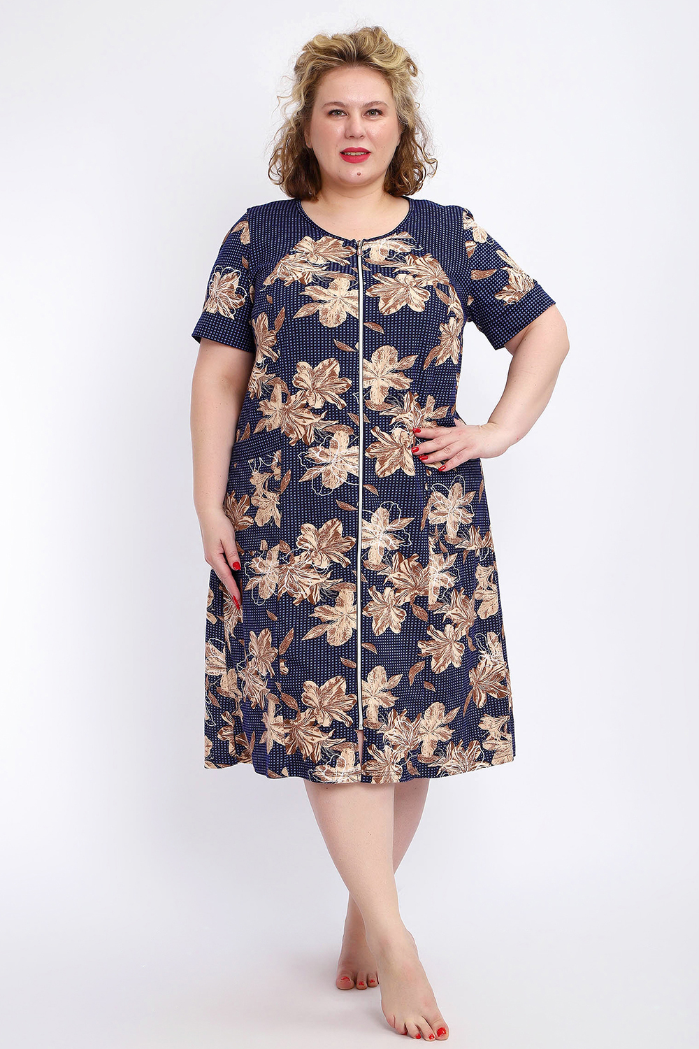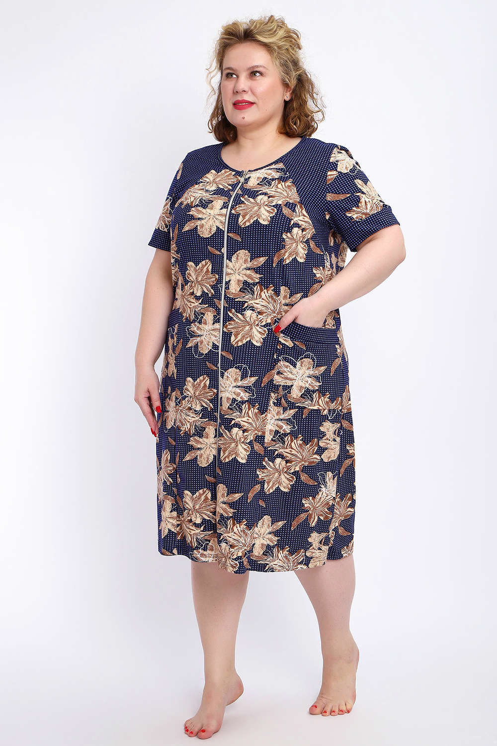Ощутите домашний уют и комфорт - выбирайте халат женский домашний больших размеров из мягкой хлопковой ткани с очаровательным принтом. Халат на молнии является самой популярной моделью, обеспечивает удобство во время носки, не сковывает движений. Прямой свободный крой платья позволяет скрыть недостатки фигуры и ощущать легкость во время домашнего отдыха. Халат домашний дополнен накладными карманами и стильной круглой горловиной, которая оформлена декоративными планками. Длина платья универсальная, за колено. В наличии есть большие размеры, поэтому выбирайте такой халат в роддом. Изделие выглядит стильно и привлекательно за счет нежных светлых бутонов цветов на контрастном темном фоне. Женская домашняя одежда российского производства имеет идеальную посадку, не линяет, не дает усадку после стирки и долго сохраняет первоначальный внешний вид. Этот женский универсальный халат изготовлен из 100% хлопка, поэтому его можно хорошо использовать как банный халат. Для вашего удобства у халатика есть два боковых кармана, которые хорошо подходят для телефона или всяких мелочей. Размерная сетка включает в себя большие размеры ( до 74 размера). Халат трикотажный выполнен из 100% хлопка. Ткань не вызывает аллергии, не электризуется, хорошо держит форму, не деформируется при стирке. Мягкое трикотажное полотно отлично пропускает воздух, позволяет коже дышать, что актуально в самые жаркие летние дни. Благодаря универсальному крою халат в нежной расцветке подходит для покупательниц любого возраста и любого типа женской фигуры, скрывает недостатки и подчеркивает достоинства. Свободный силуэт позволяют носить его как домашнее платье, даря удобство и комфорт в течение всего дня. Домашний халат с рукавами отлично подойдет в подарок маме, бабушке или сестре на новый год, 8 марта или просто так порадовать.