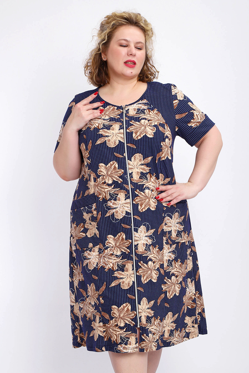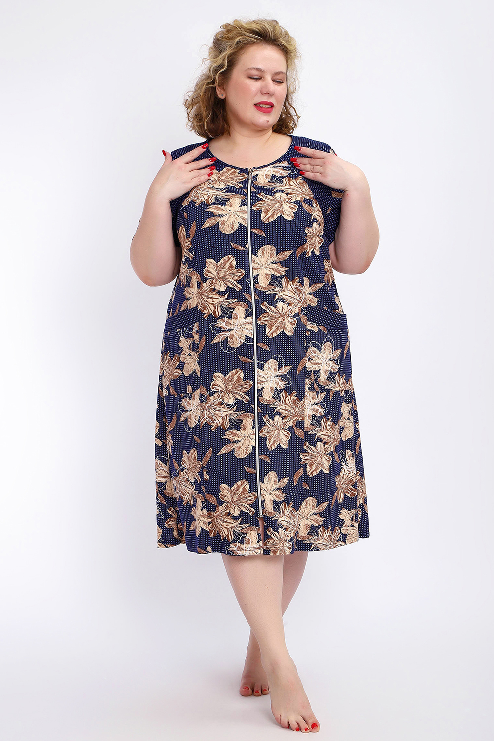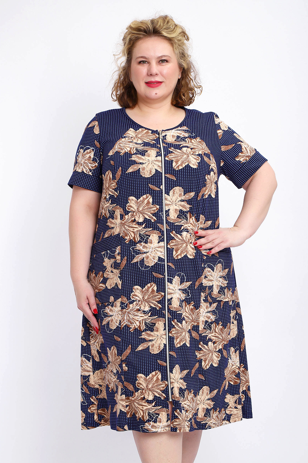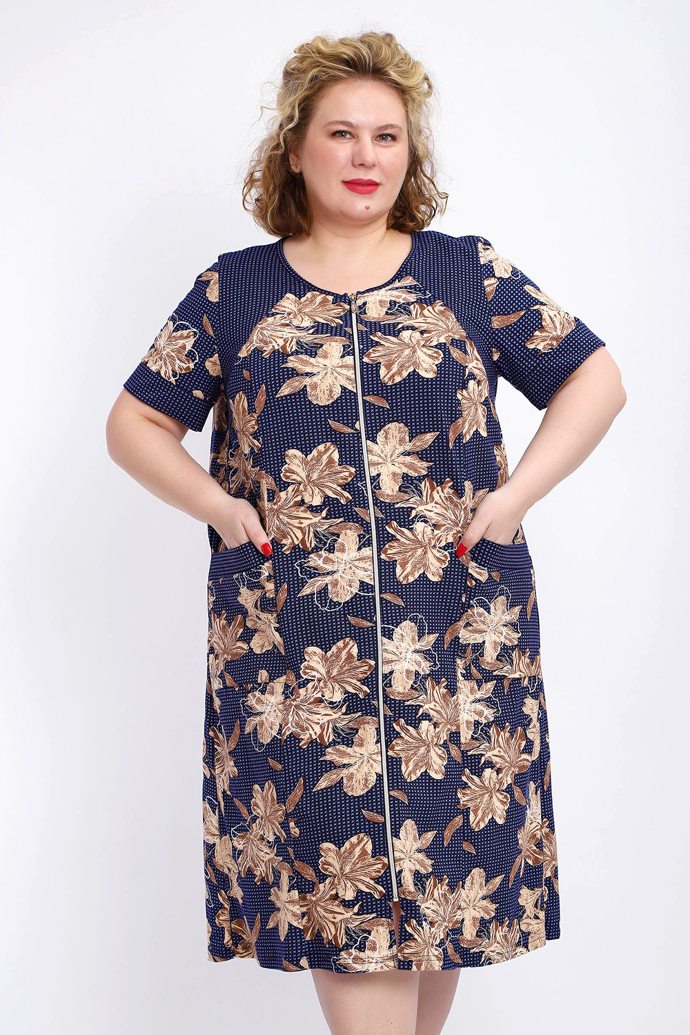 Ощутите домашний уют и комфорт - выбирайте халат женский домашний больших размеров из мягкой хлопковой ткани с очаровательным принтом. Халат на молнии является самой популярной моделью, обеспечивает удобство во время носки, не сковывает движений. Прямой свободный крой платья позволяет скрыть недостатки фигуры и ощущать легкость во время домашнего отдыха. Халат домашний дополнен накладными карманами и стильной круглой горловиной, которая оформлена декоративными планками. Длина платья универсальная, за колено. В наличии есть большие размеры, поэтому выбирайте такой халат в роддом. Изделие выглядит стильно и привлекательно за счет нежных светлых бутонов цветов на контрастном темном фоне. Женская домашняя одежда российского производства имеет идеальную посадку, не линяет, не дает усадку после стирки и долго сохраняет первоначальный внешний вид. Этот женский универсальный халат изготовлен из 100% хлопка, поэтому его можно хорошо использовать как банный халат. Для вашего удобства у халатика есть два боковых кармана, которые хорошо подходят для телефона или всяких мелочей. Размерная сетка включает в себя большие размеры ( до 74 размера). Халат трикотажный выполнен из 100% хлопка. Ткань не вызывает аллергии, не электризуется, хорошо держит форму, не деформируется при стирке. Мягкое трикотажное полотно отлично пропускает воздух, позволяет коже дышать, что актуально в самые жаркие летние дни. Благодаря универсальному крою халат в нежной расцветке подходит для покупательниц любого возраста и любого типа женской фигуры, скрывает недостатки и подчеркивает достоинства. Свободный силуэт позволяют носить его как домашнее платье, даря удобство и комфорт в течение всего дня. Домашний халат с рукавами отлично подойдет в подарок маме, бабушке или сестре на новый год, 8 марта или просто так порадовать.