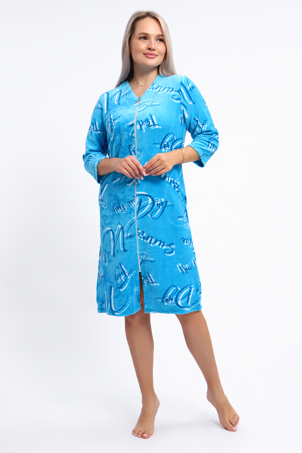 Халат женский на молнии из набивного велюра полуприлегающего силуэта. Горловина халата имеет V-образный вырез, обработана обтачкой, рукав 3/4, карманы. Халат прекрасно подойдет для дома и отдыха.