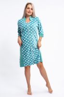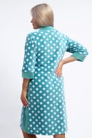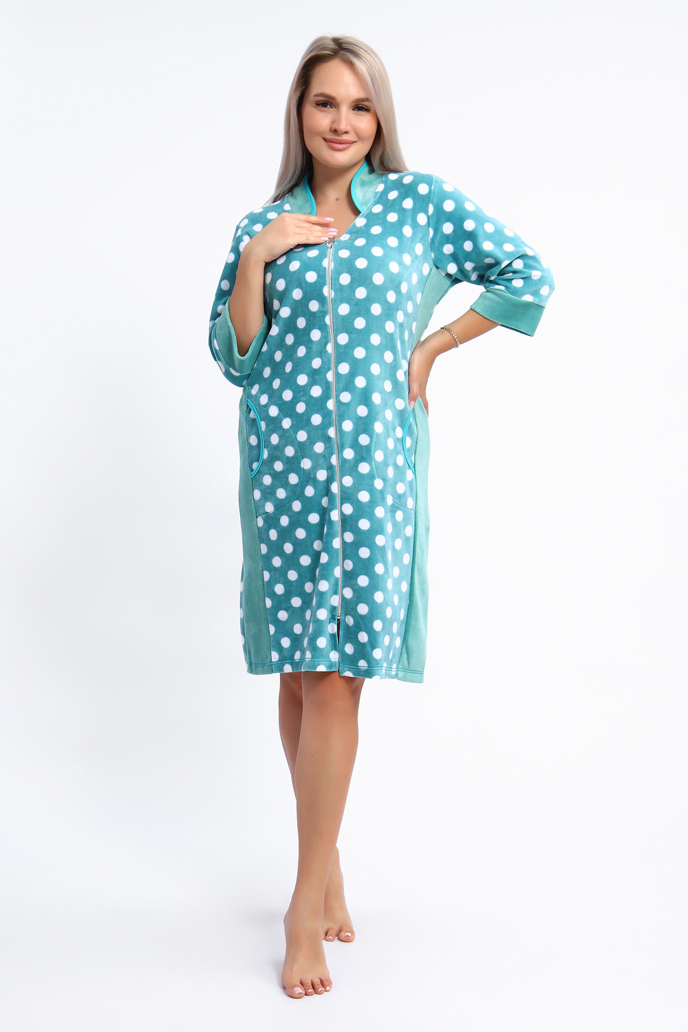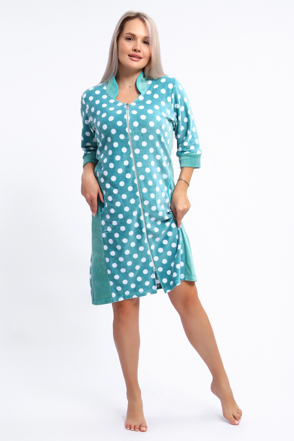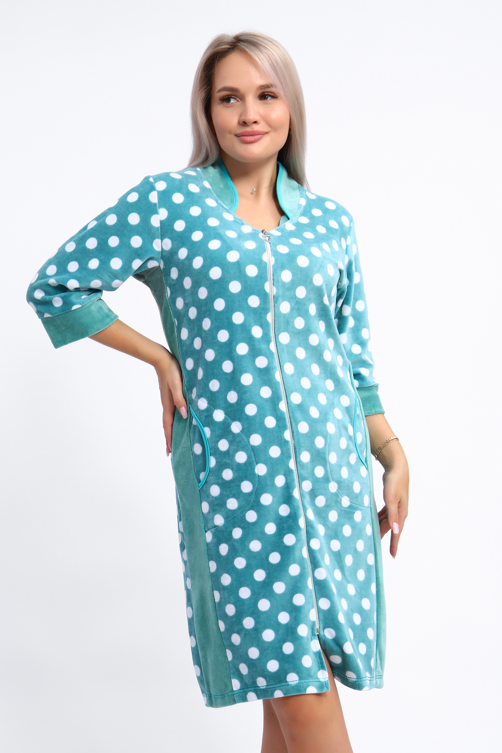 Халат велюровый на молнии в горошек. Воротник-стойка, рукава 3/4 на манжете, по бокам однотонная вставка, с карманами. Ткань велюр, качество отличное, после стирки цвет не теряет, не деформируется, приятное к телу. Для дома и отдыха.