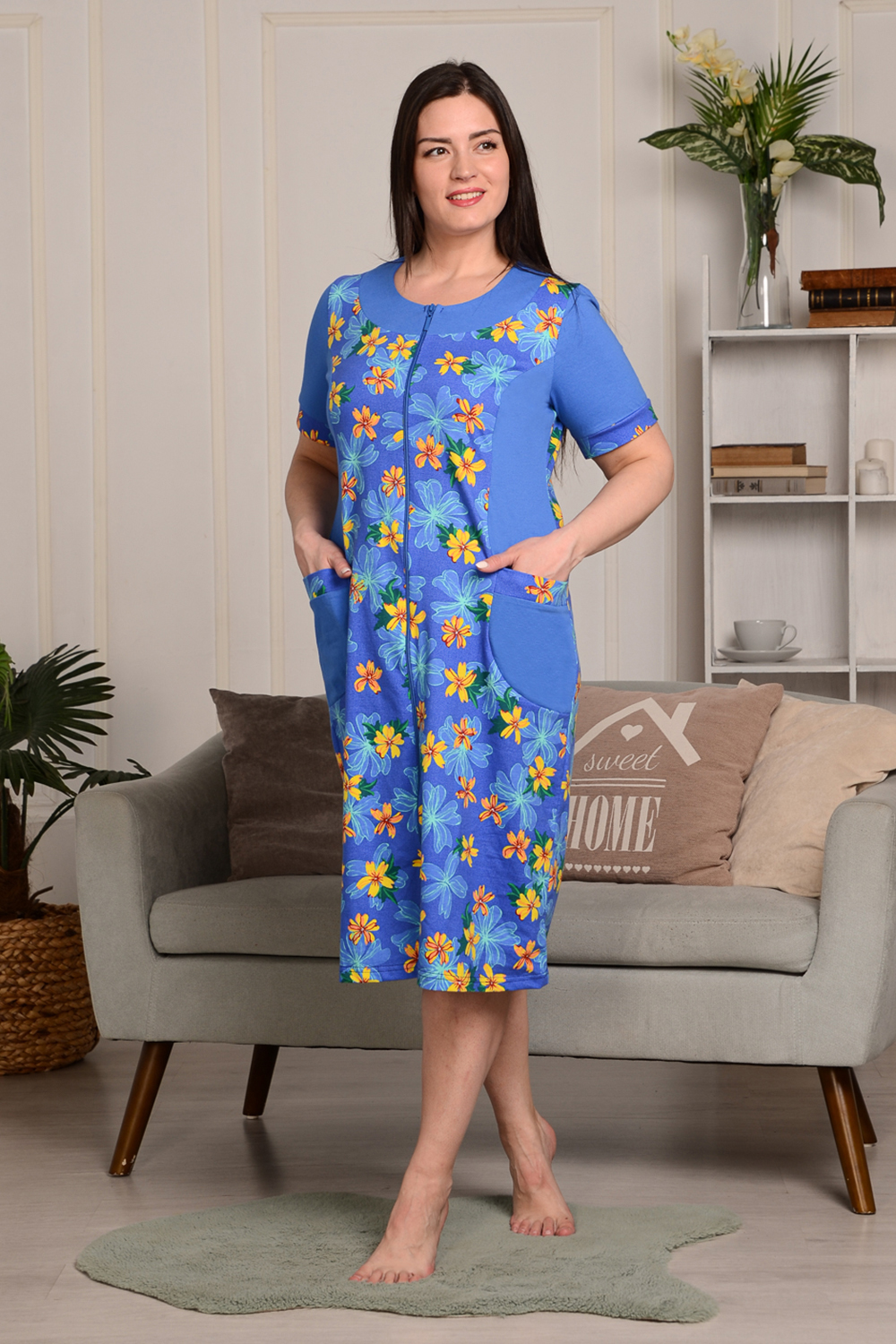 Халат женский на молнии. Дома хочется выглядеть стильно и не лишиться комфорта. Тогда обратите внимание на халат с коротким рукавом, изготовленный из натурального хлопка. Стильный халат из мягкого трикотажа может смело использоваться как банный, пляжный и хозяйственный. Женский халат на молнии с боковыми карманами. Рукав короткий. Состав: 100% хлопок. Крой халата поможет не только скрыть недостатки фигуры, но и подчеркнуть все достоинства.