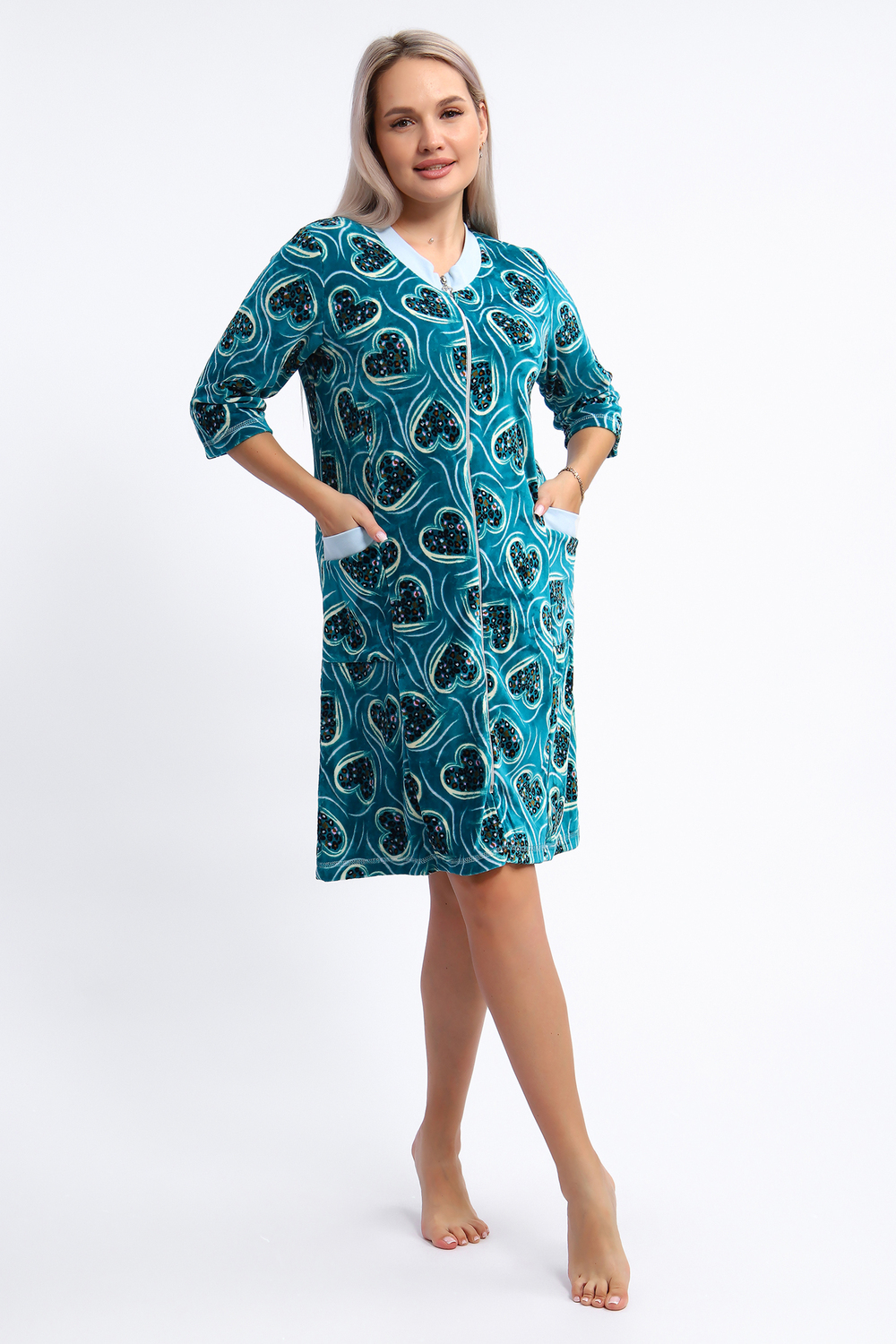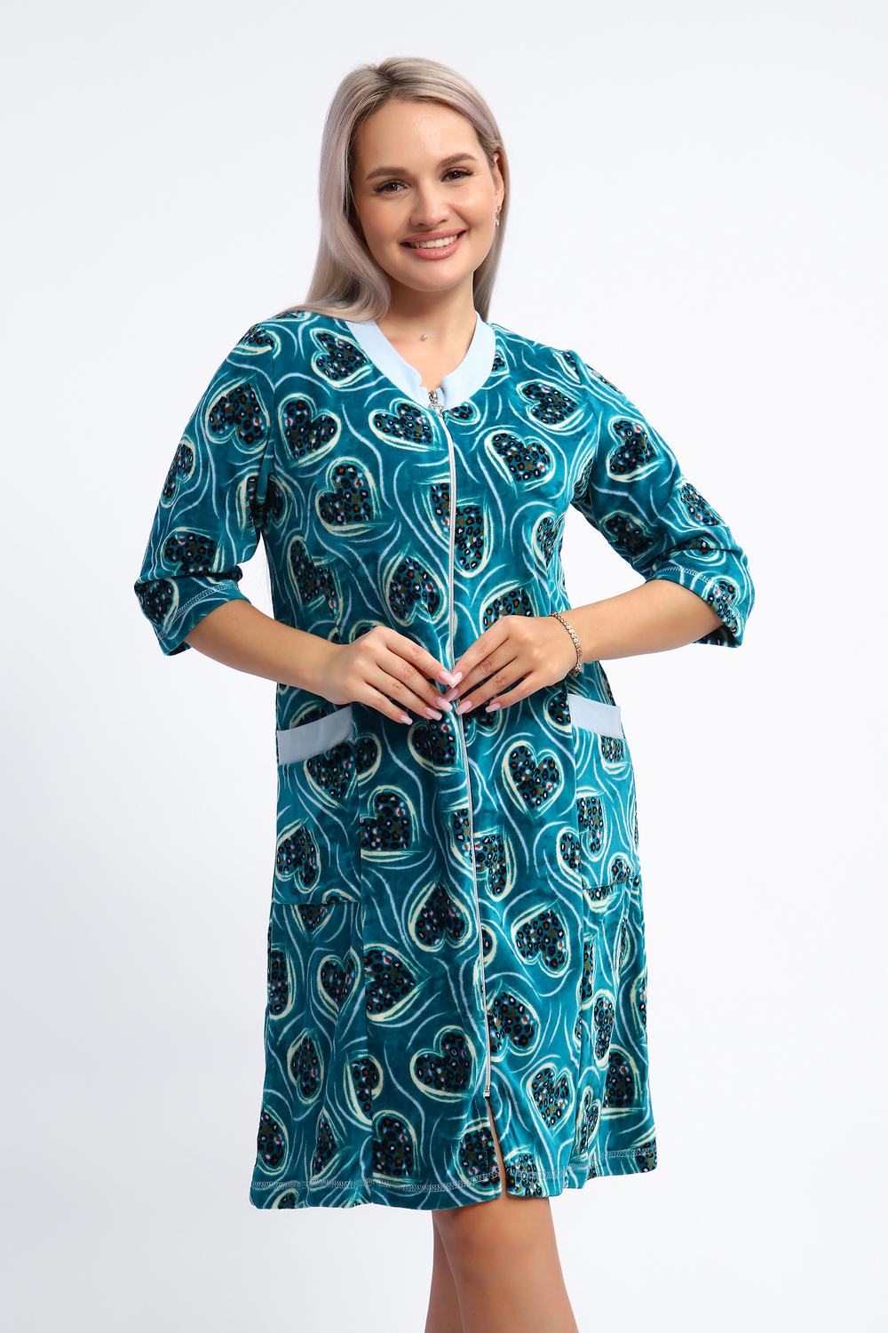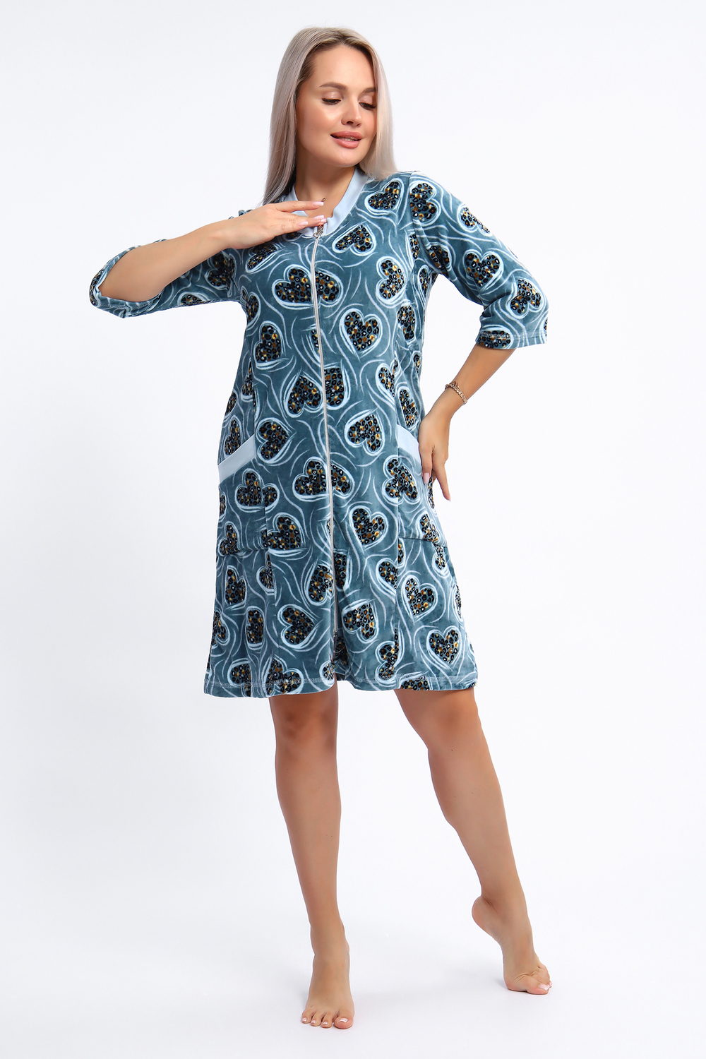Халат женский на серебристой молнии выполнен из набивного велюра. Халат с рукавом 3/4, головина и карманы отделаны тканью контрастного цвета. Халат идеально подойдет для дома и отдыха.