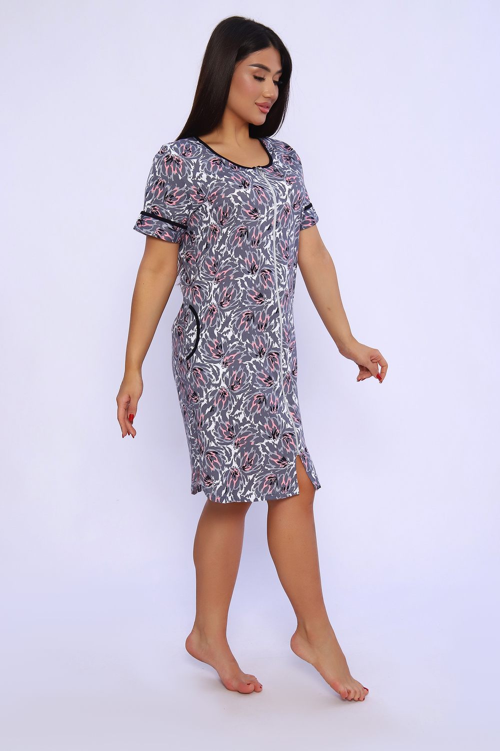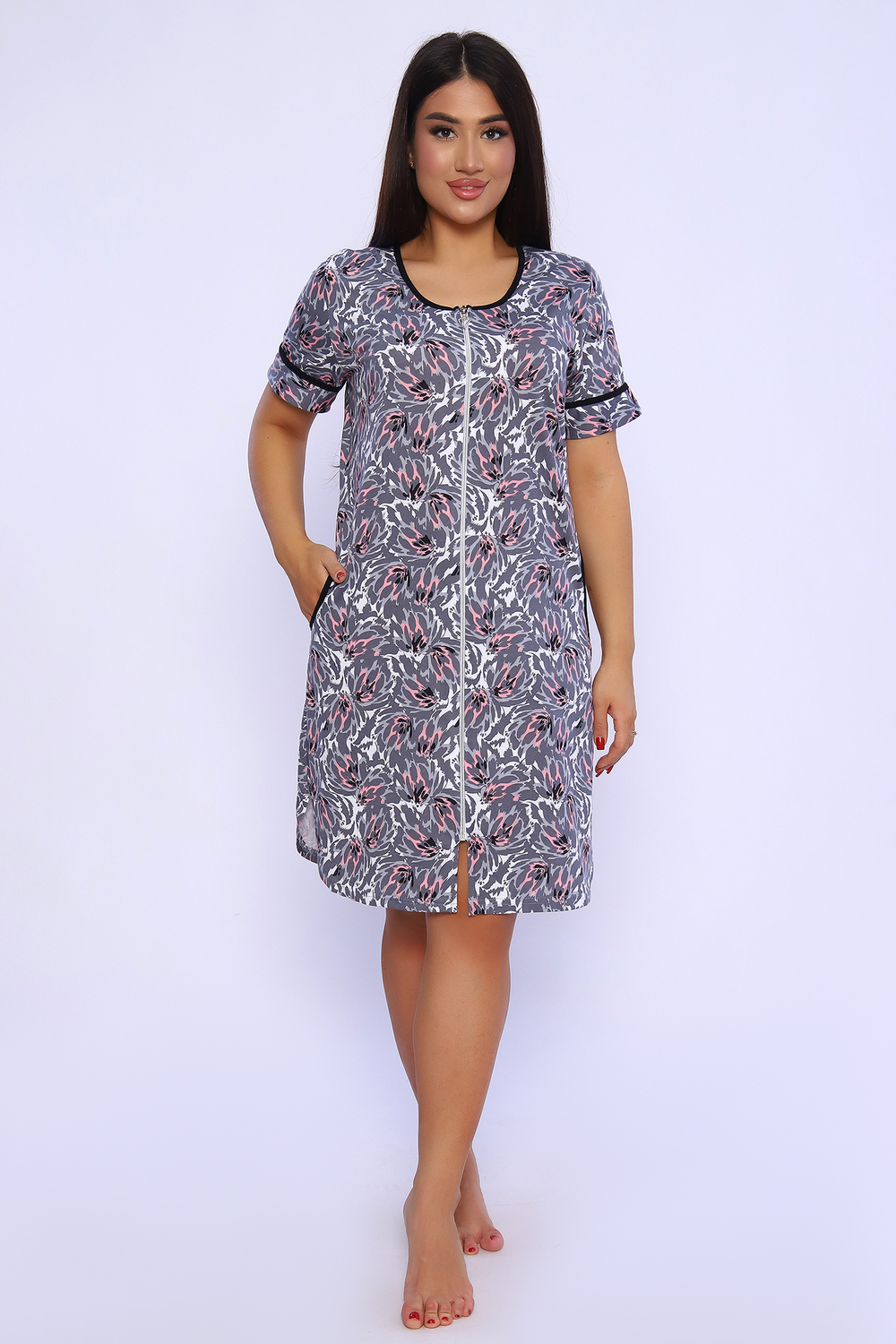 Халат женский на молнии оригинальной расцветки выполнен из кулирки 100% хлопок. Горловина, карманы и рукава отделаны контрастным кантом, по бокам разрезы с закруглением. Халатик идеально подойдет для дома и отдыха.