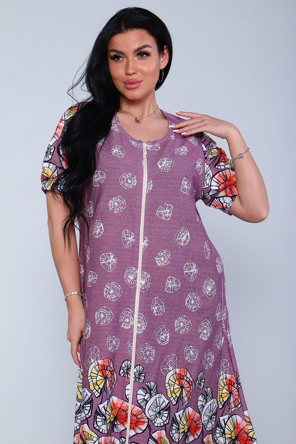 Халат женский, свободного кроя. На полочке халата в боковых швах расположены карманы. На рукавах посередине низка в подгибке втачена резинка, которая придает небольшую пышность рукаву. Изделие А-образного силуэта с хорошим расширением к низу, отлично садится на женщин с широкими бедрами. Халатик хорошо подходит для дома и отдыха на даче.