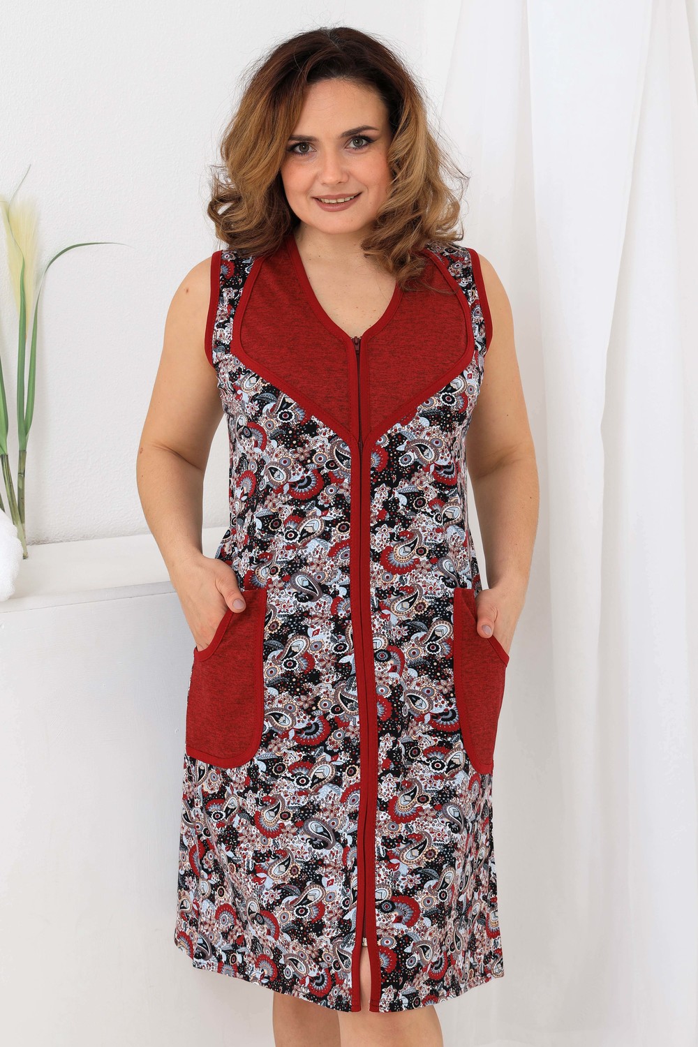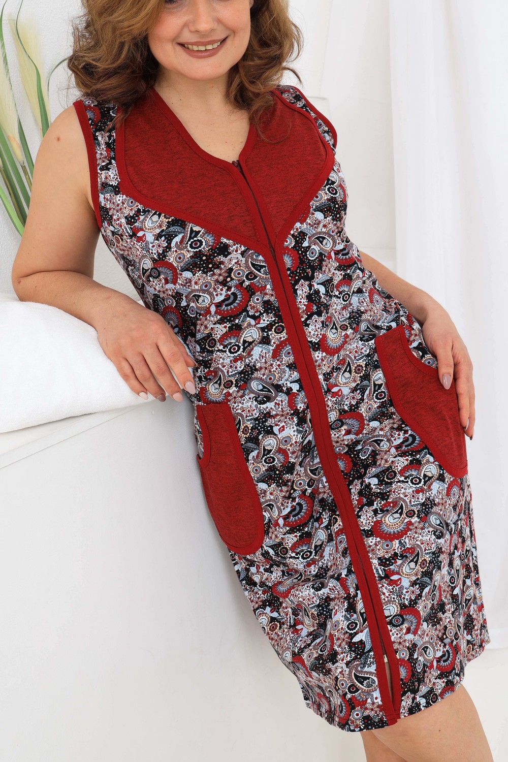 Удобный и практичный халат без рукавов. Застежка на молнию, оригинальный крой полочки. Отлично подходит для лета.