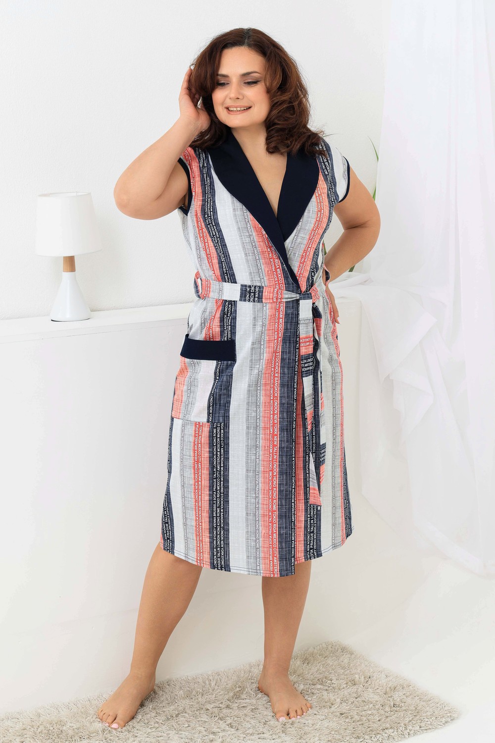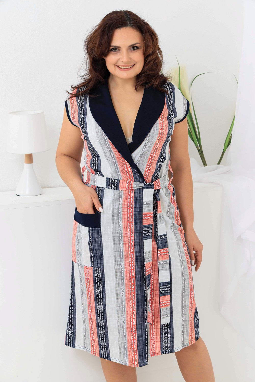Нежный и очень красивый халат с поясом на запах. Модель с одним карманом и коротким рукавом. Комфортный и легкий халат с оригинальным принтом.