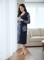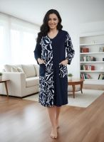 Элегантный женский халат на молнии, выполненный в стиле домашнего платья. Глубокий темно-синий цвет гармонично сочетается с контрастным бело-черным растительным или абстрактным принтом, расположенным вертикальной вставкой спереди и на рукавах. Удобная длина миди, V-образный вырез и практичные карманы делают его идеальным для стильного и комфортного отдыха дома.
