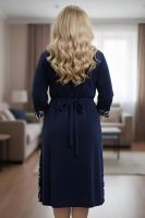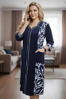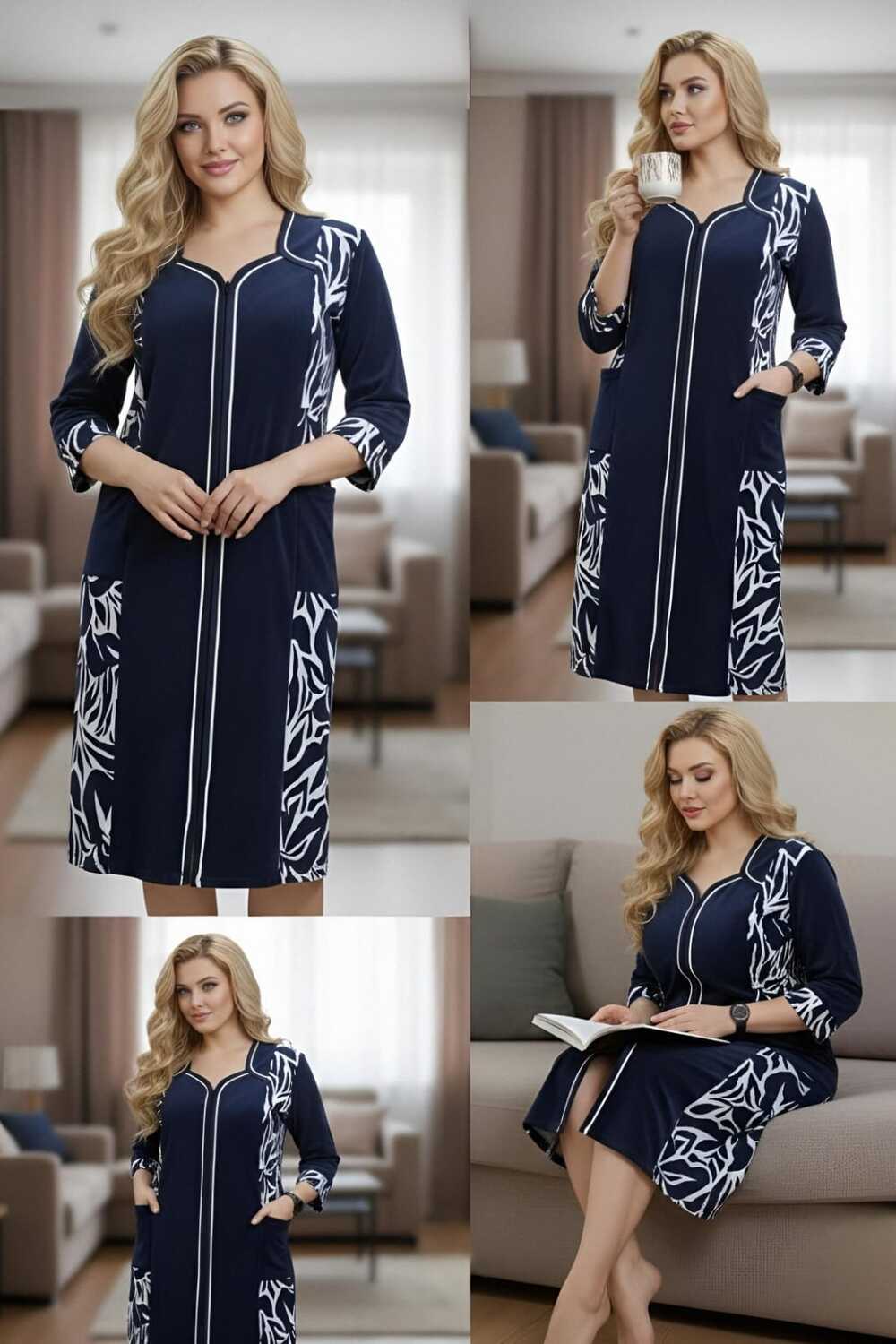 Этот элегантный халат — идеальный выбор для женщин, которые ценят комфорт, не забывая о стиле. Модель выполнена в глубоком темно-синем цвете, который гармонично сочетается с контрастной белой отделкой и эффектным растительным орнаментом. Вертикальная застежка-молния и боковые вставки с белым принтом визуально вытягивают силуэт, делая фигуру более стройной и изящной. На спинке предусмотрен вшитый пояс-завязка, который позволяет аккуратно приталить модель точно по вашей фигуре. Рукав длиной 3/4 не мешает домашним делам, а глубокие накладные карманы позволяют всегда держать под рукой телефон или другие мелочи. Фигурное каре с аккуратным кантом подчеркивает зону декольте, сохраняя при этом сдержанный и достойный вид. Халат выполнен из мягкого велюра, приятного на ощупь материала, который отлично пропускает воздух и дарит ощущение уюта в любое время года. В такой одежде приятно начинать утро за чашкой кофе или отдыхать после рабочего дня, оставаясь при этом женственной и ухоженной.