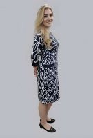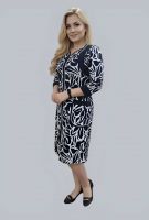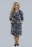 Этот элегантный женский халат темно-синего цвета сочетает в себе домашний уют и изысканный стиль. Он выполнен из мягкого, приятного к телу трикотажа, который отлично держит форму и обеспечивает комфорт в течение всего дня. Халат имеет полуприлегающий силуэт длиной ниже колена. Центральная застежка на молнии по всей длине делает его практичным и удобным в использовании. Главным украшением служат контрастные белые вставки с изящным растительным (лиственным) принтом на плечах, манжетах и в нижней части изделия. Белый кант вдоль молнии и выреза горловины визуально вытягивает силуэт, придавая образу стройность. V-образный вырез подчеркивает линию шеи, рукав 3/4 открывает запястья, что удобно для домашних дел. Накладные карманы по бокам добавляют функциональности, пояс на спине позволяет регулировать степень прилегания и подчеркивает талию. Благодаря благородному темно-синему цвету и стильному принту, халат выглядит как полноценное домашнее платье. В нем можно не только отдыхать, но и встречать гостей. Качественный материал позволяет коже «дышать», а продуманный крой не стесняет движений.