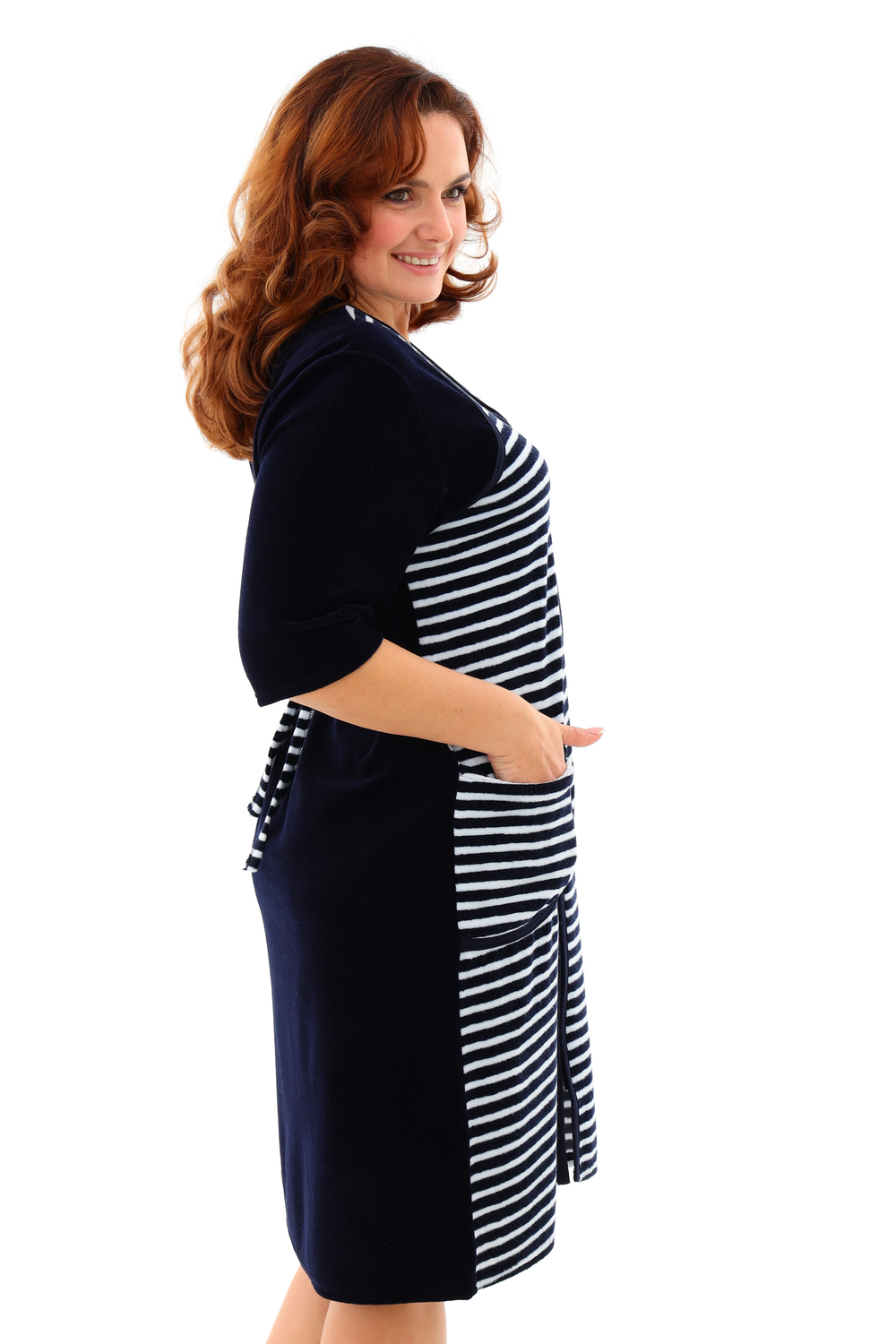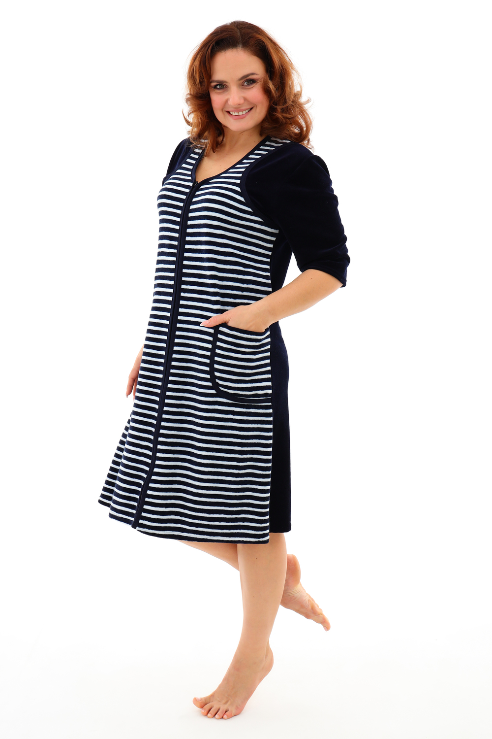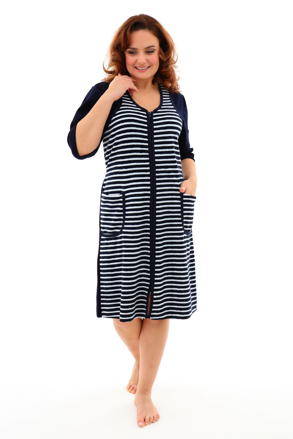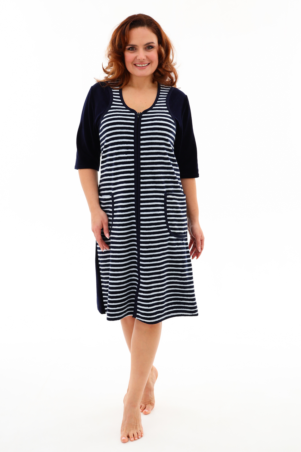 Мягкий женский халат из велюра. Пятнистый дизайн, однотонные рукава и вставки, застегивается на молнию, рукава ниже локтей, по бокам карманы, длина приблизительно до коленей. Размеры от 46 до 62.