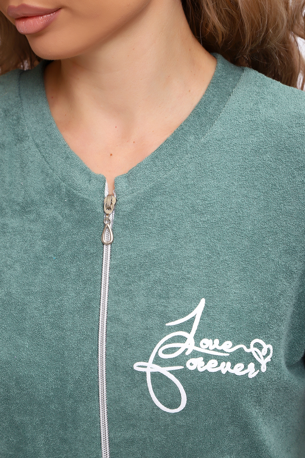 Домашний женский махровый халат на молнии. Это уютный вариант повседневной домашней одежды. Выглядит стильно и современно, как домашнее платье. Оптимальной длины до колена. Ткань отлично впитывает влагу и позволяет коже дышать.
