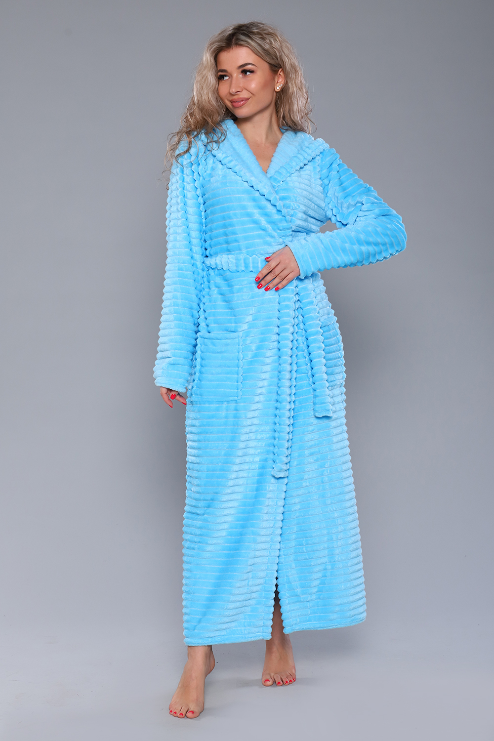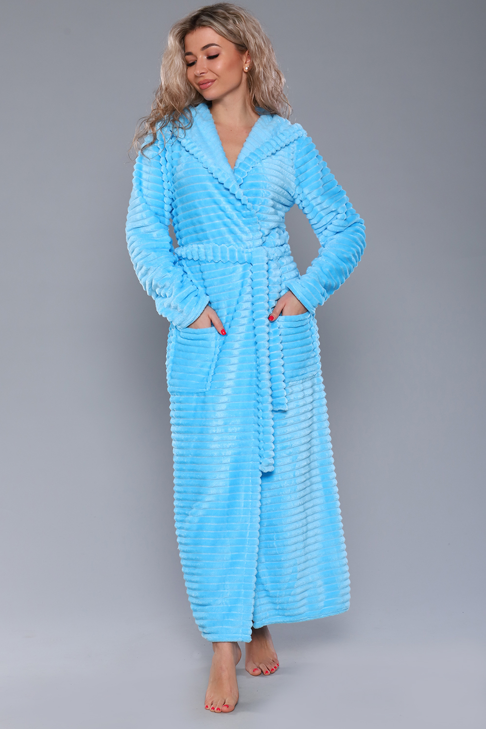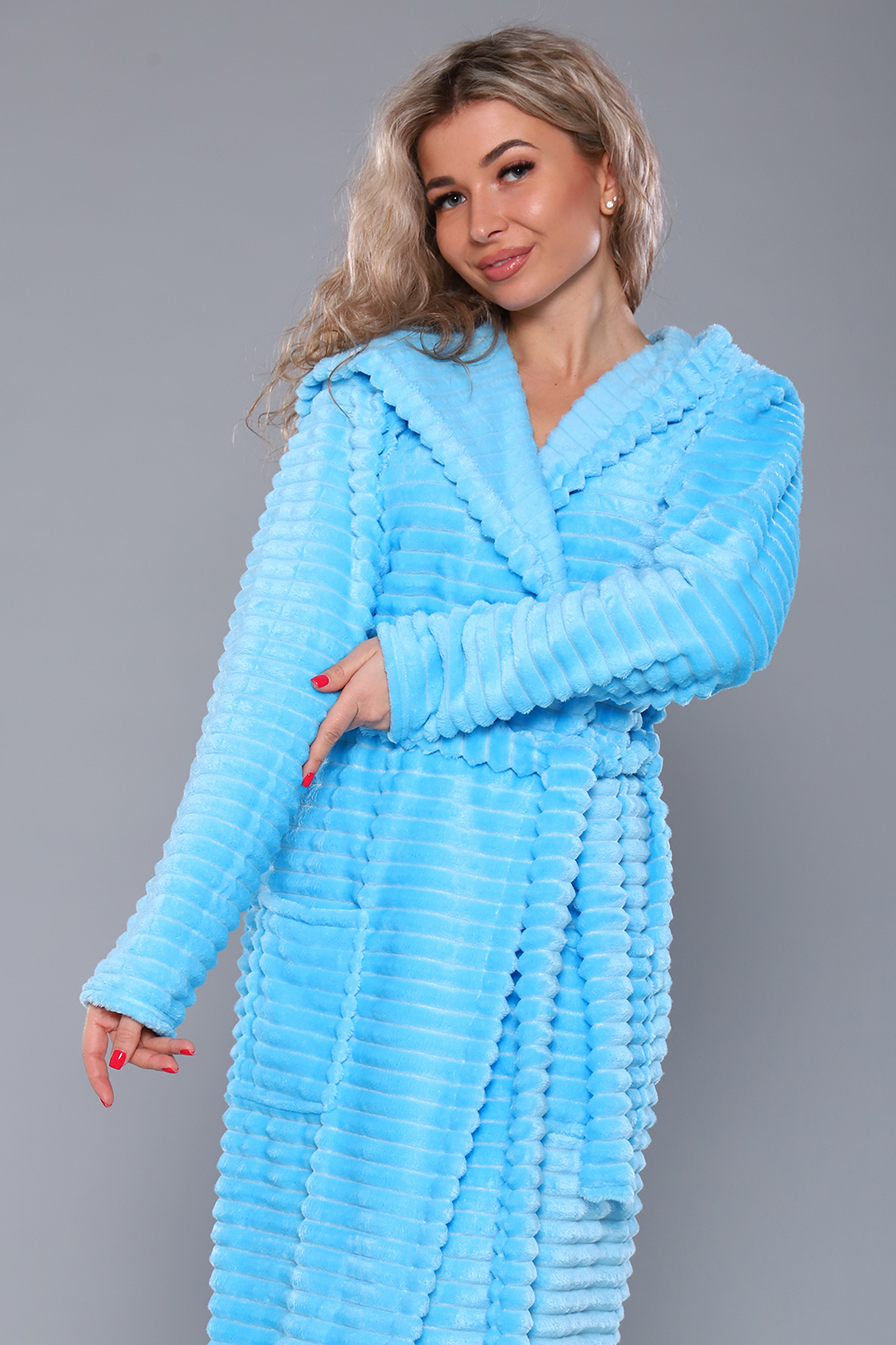 Женский домашний халат мягкий и уютный. Сшит из самого нежного велсофта, Материал хорошо сохраняет тепло, воздухопроницаемый, износоустойчив, Женские халаты из этого материала получаются невероятно комфортными, тёплыми и уютными. Данная модель халата имеет два вместительных кармана, удобный пояс и объёмный капюшон. Длина изделия Макси