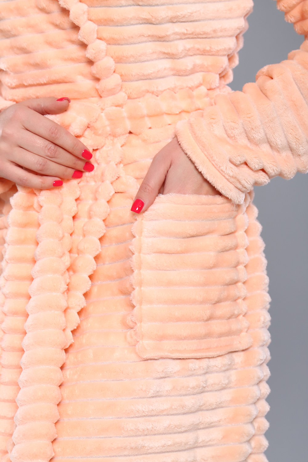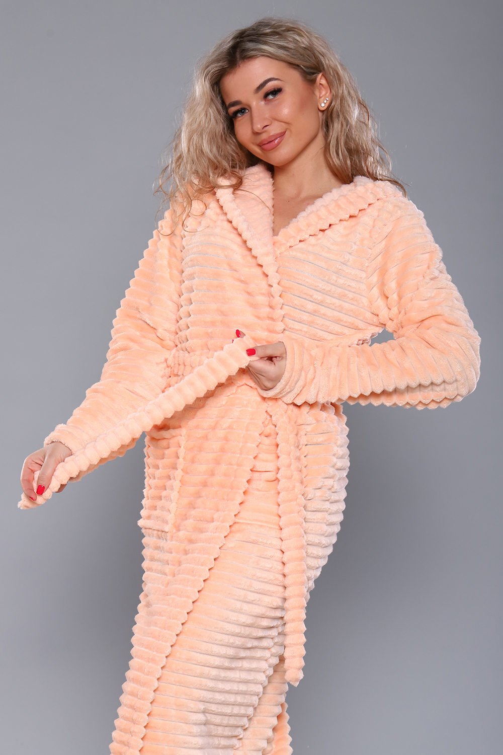 Женский домашний халат мягкий и уютный. Сшит из самого нежного велсофта, Материал хорошо сохраняет тепло, воздухопроницаемый, износоустойчив, Женские халаты из этого материала получаются невероятно комфортными, тёплыми и уютными. Данная модель халата имеет два вместительных кармана, удобный пояс и объёмный капюшон. Длина изделия Макси