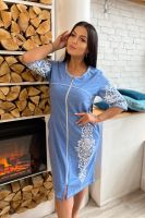 Халат на молнии, полуприлегающего силуэта, длиной ниже колена, с округлой горловиной, с карманами в боковом шве. Рукав втачной, длиной 3/4. В верхней части полочки и спинки расположены фигурные кокетки. Горловина и низ рукавов обработаны бейкой из основного полотна.