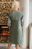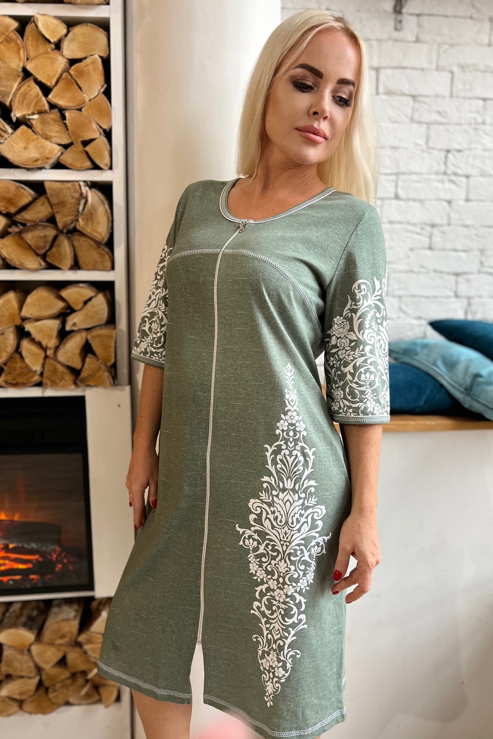 Халат на молнии, полуприлегающего силуэта, длиной ниже колена, с округлой горловиной, с карманами в боковом шве. Рукав втачной, длиной 3/4. В верхней части полочки и спинки расположены фигурные кокетки. Горловина и низ рукавов обработаны бейкой из основного полотна.