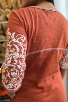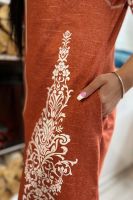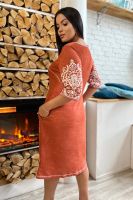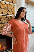 Халат на молнии, полуприлегающего силуэта, длиной ниже колена, с округлой горловиной, с карманами в боковом шве. Рукав втачной, длиной 3/4. В верхней части полочки и спинки расположены фигурные кокетки. Горловина и низ рукавов обработаны бейкой из основного полотна.