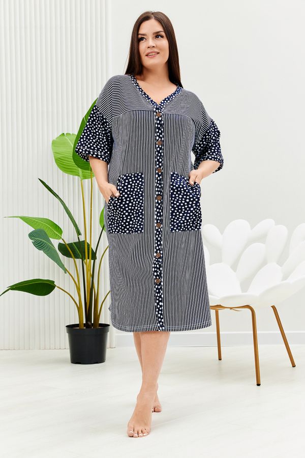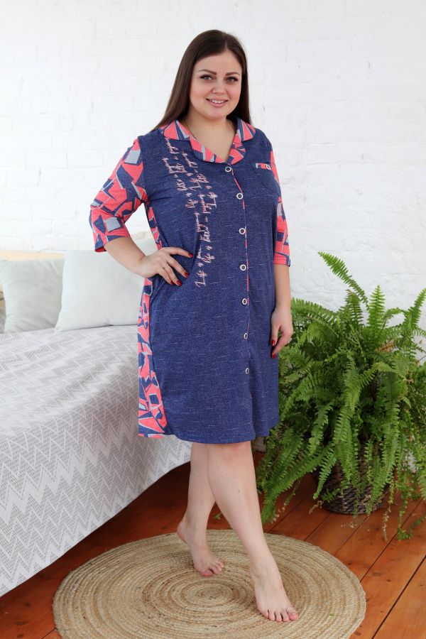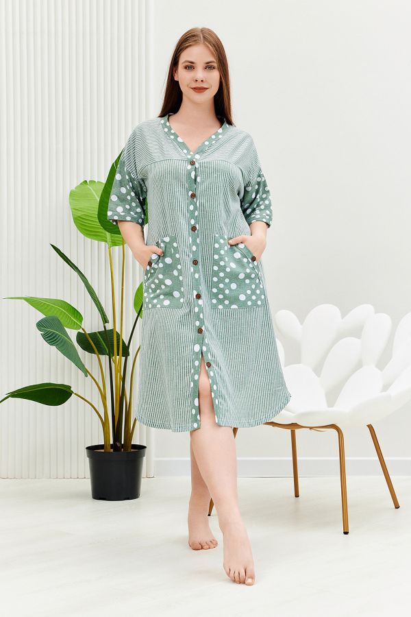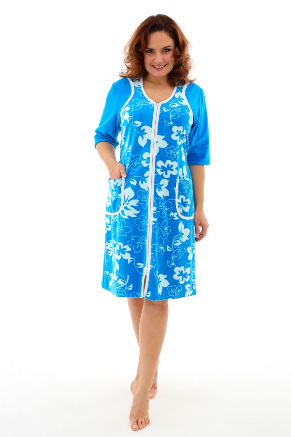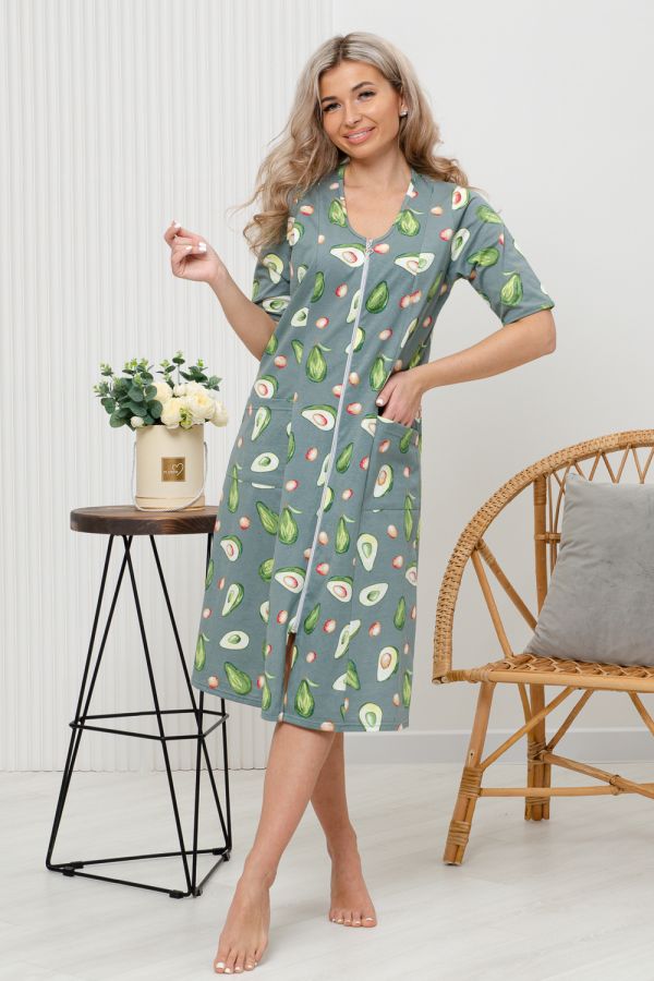 Халат женский оригинальной расцветки выполнен из 100% хлопка. Горловина имеет V-образный вырез, рукав короткий. Халат на молнии средней длины. подойдет для повседневной носки и отдыха.