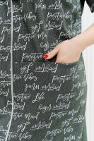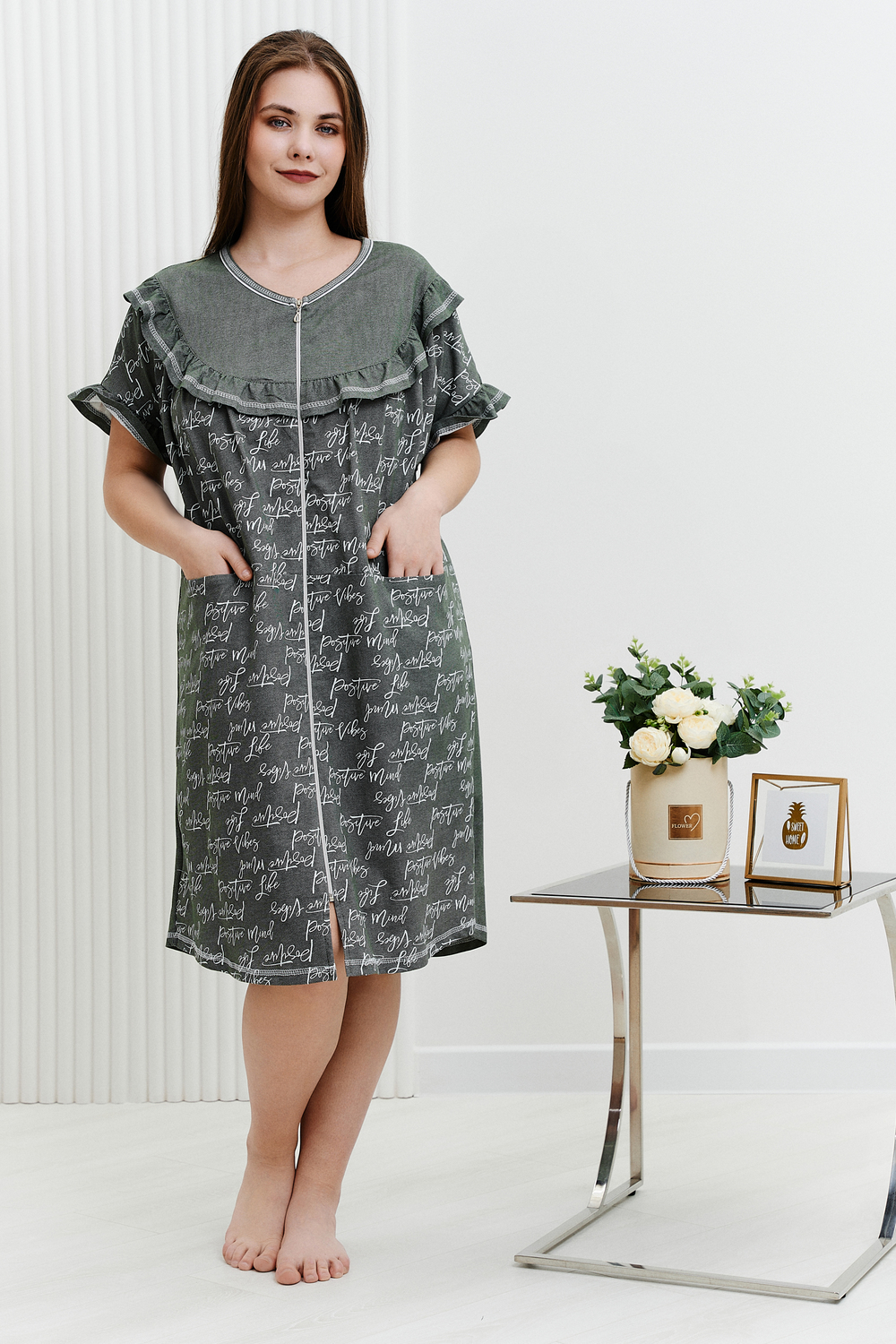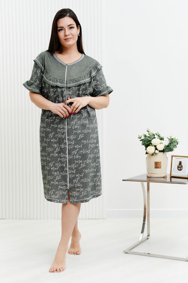 Халат женский, полуприлегающего силуэта, горловина округлая, застежка на тесьму-молнию. На полочке кокетка с рюшей, также рюша внизу цельнокроенного короткого рукава из отделочной ткани. Внутренние горизонтальные карманы в шве стачивания верхней и нижней части полочки.