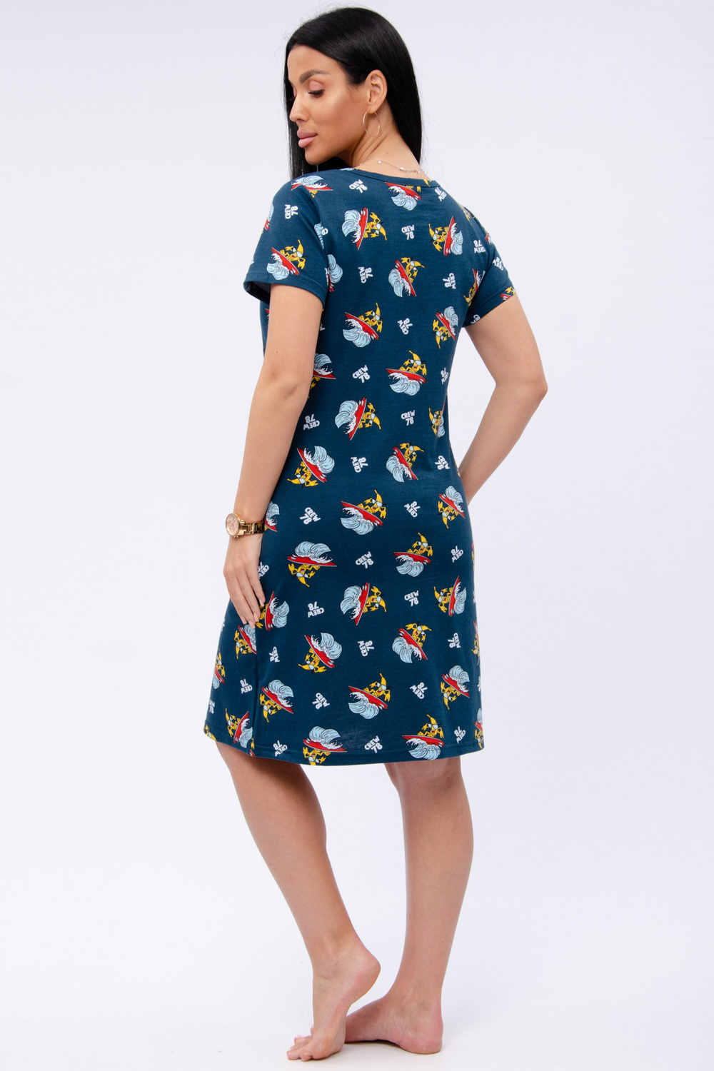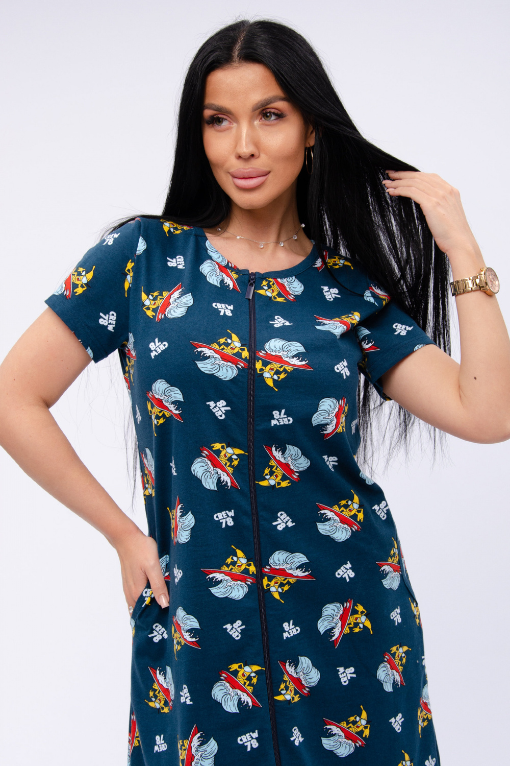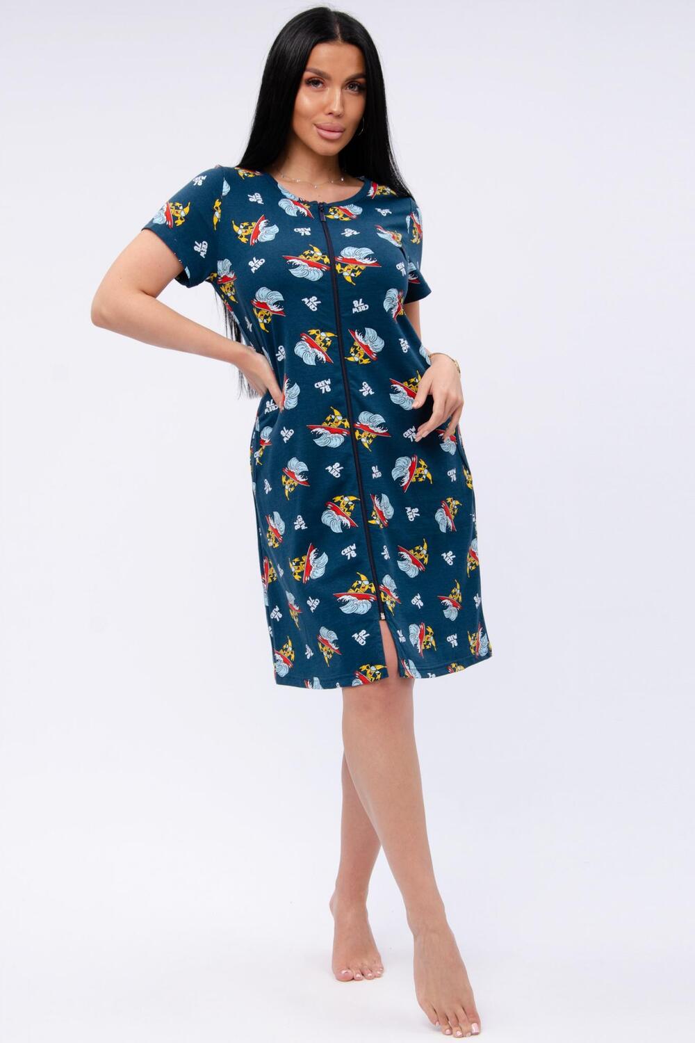 Женский халат на молнии. Рукав короткий. Красивый вырез на полочке. Халат прекрасно подойдет для дома, дачи и отдыха.