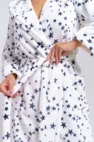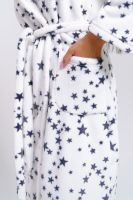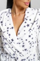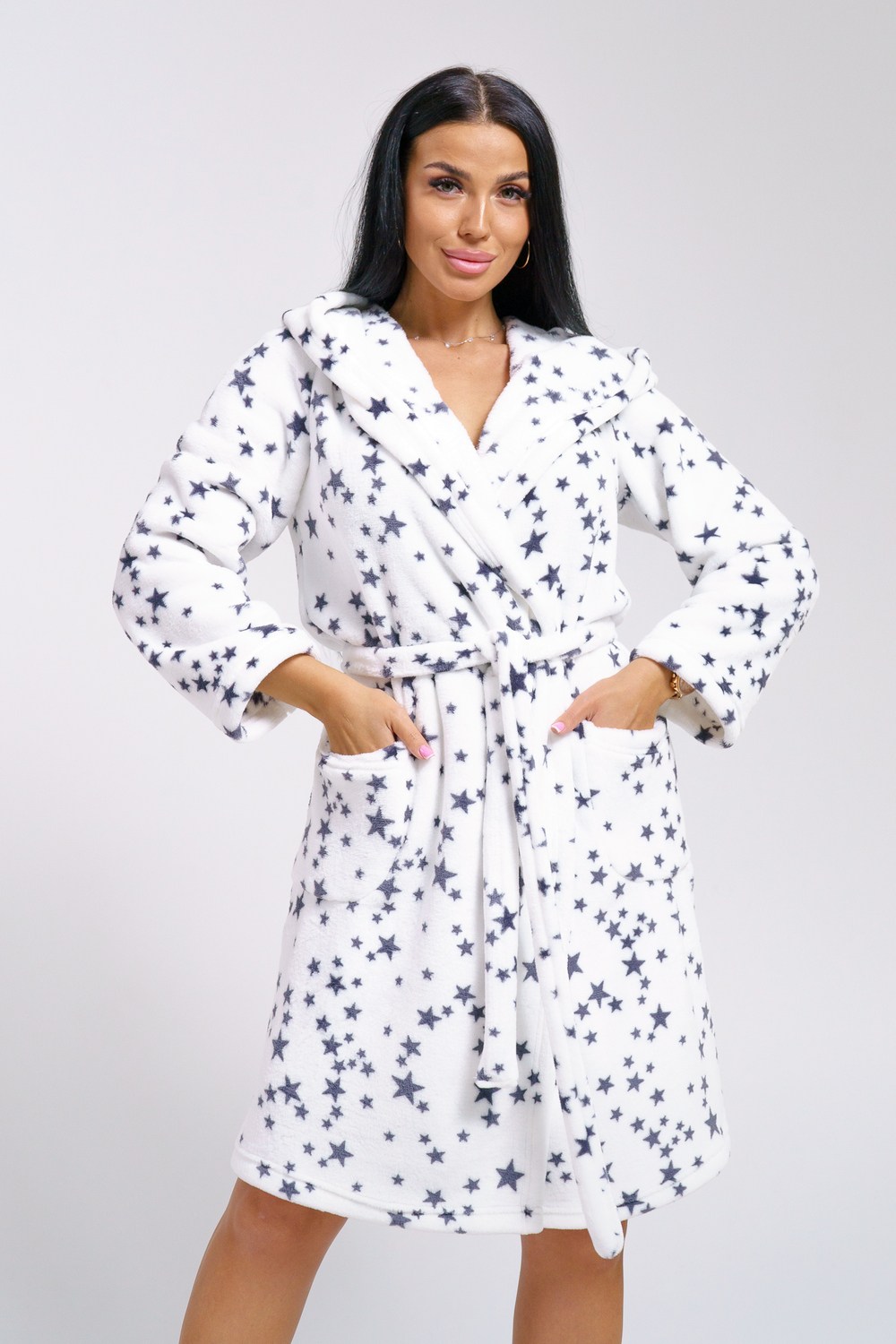 Запашной халат с капюшоном и длинными рукавами. В нижней части изделия два накладных кармана. В комплекте пояс.