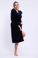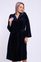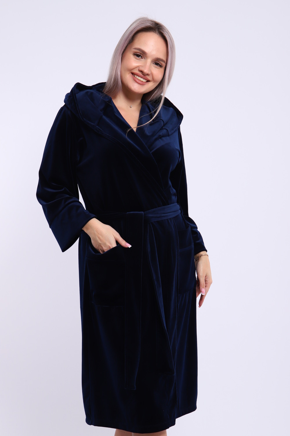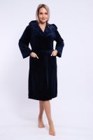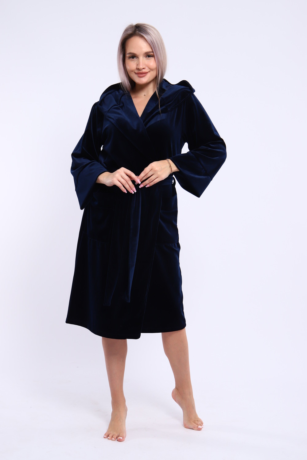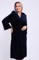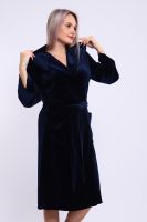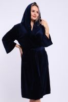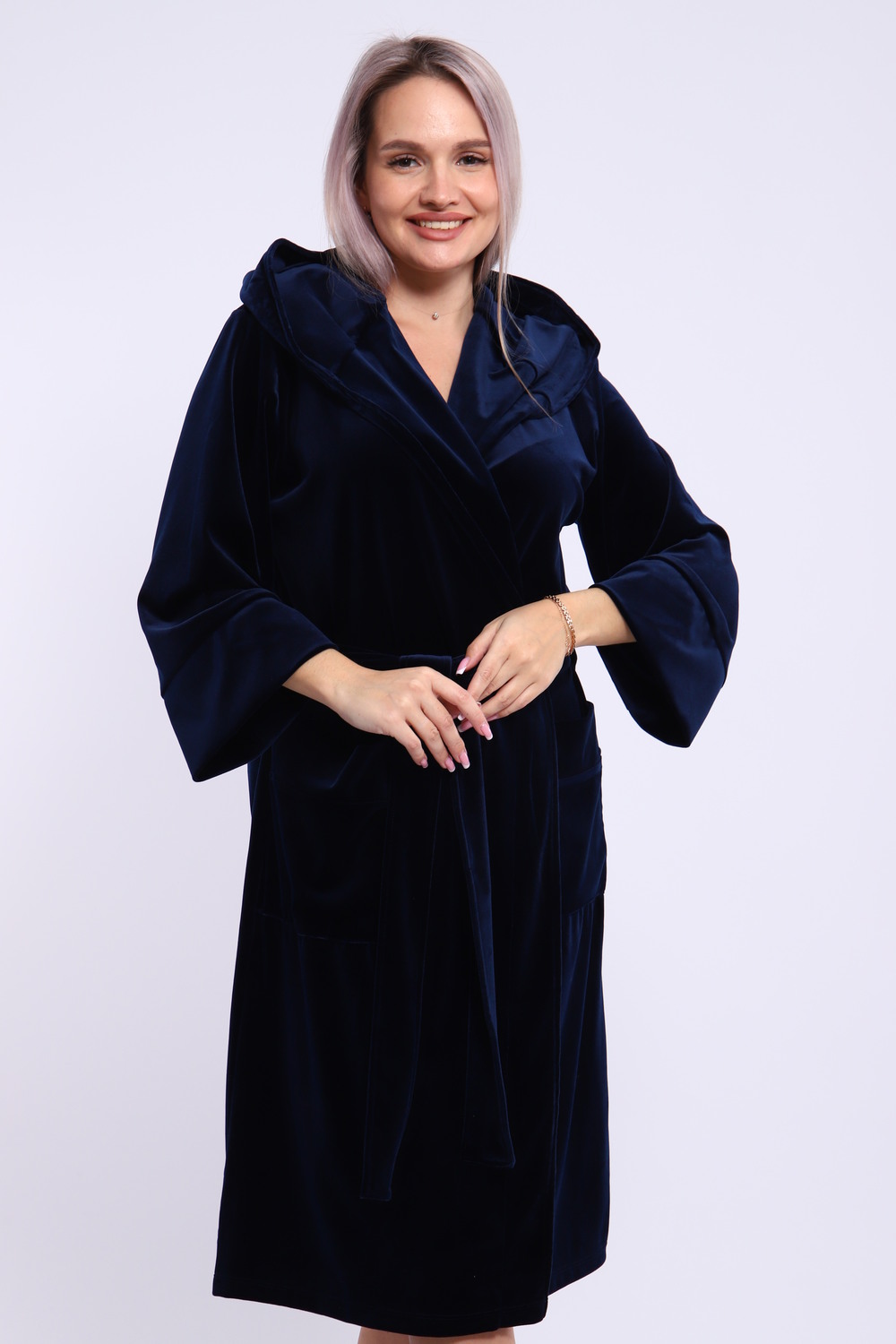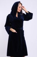 Халат женский на запах из ткани велюр. Халат на запах с поясом и с капюшоном, карманы по бокам настрочные, рукав 3/4 широкие с манжетами. Длина халата средняя, размер полный. Цвета насыщенные благородные с переливом.