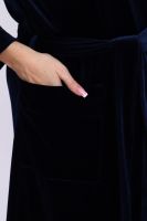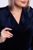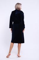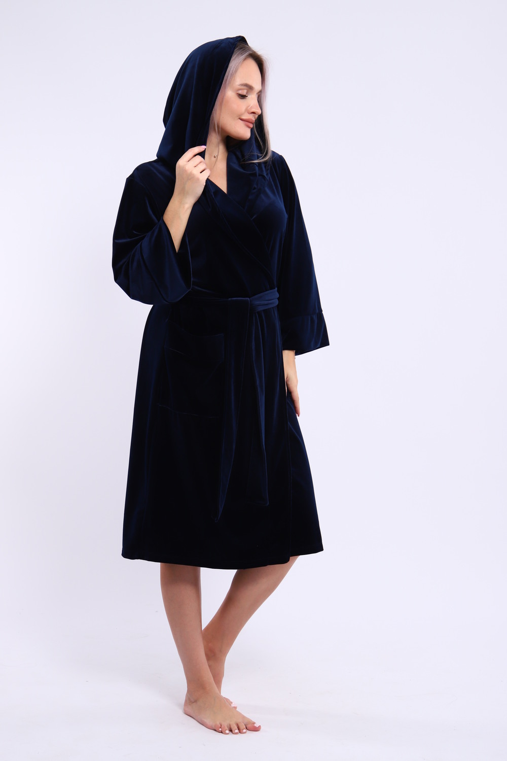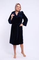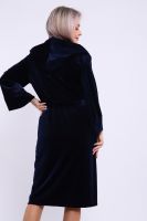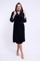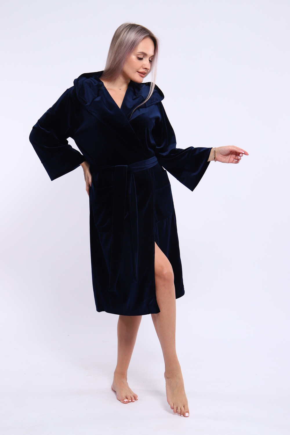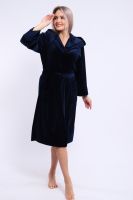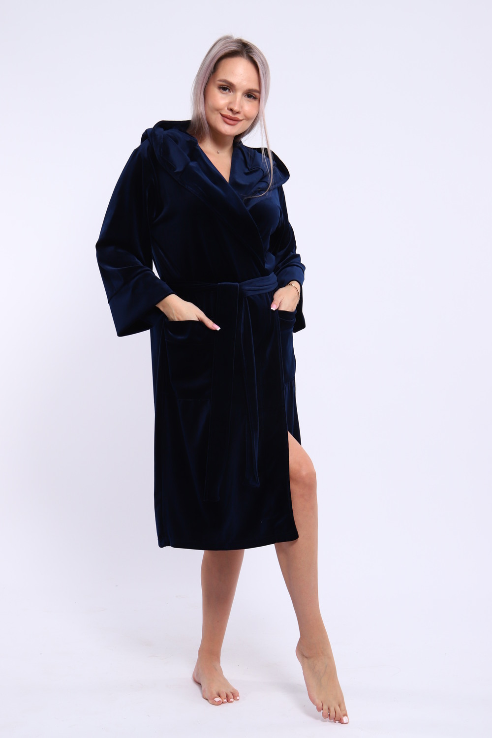 Халат женский на запах из ткани велюр. Халат на запах с поясом и с капюшоном, карманы по бокам настрочные, рукав 3/4 широкие с манжетами. Длина халата средняя, размер полный. Цвета насыщенные благородные с переливом.